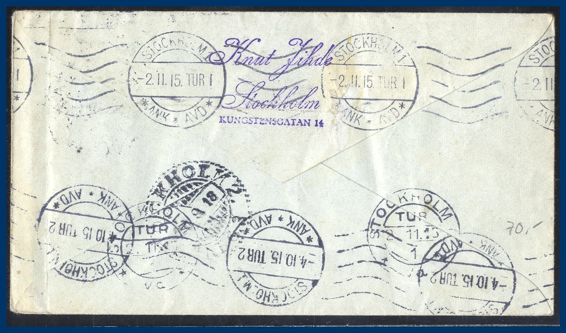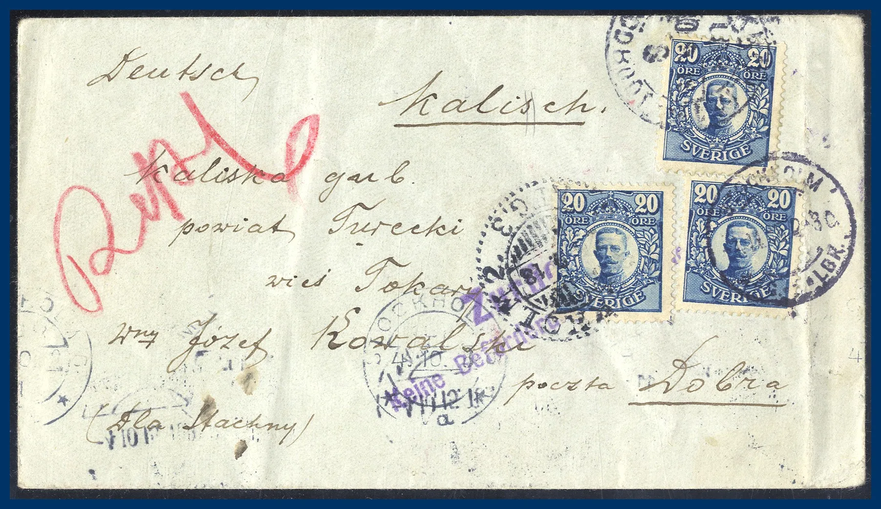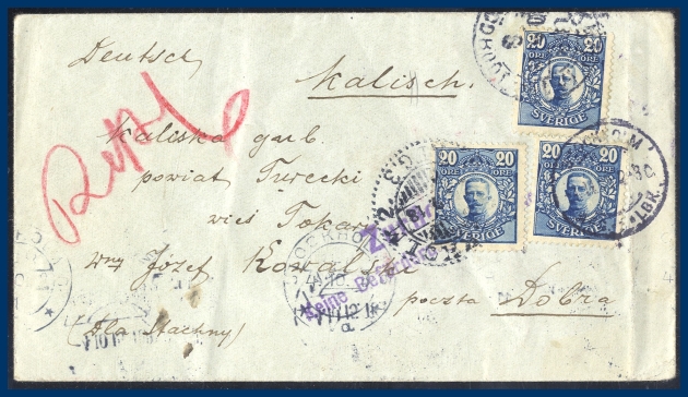 219. (A) 3x 20 öre Medaljong på brev till Polen avstämplat