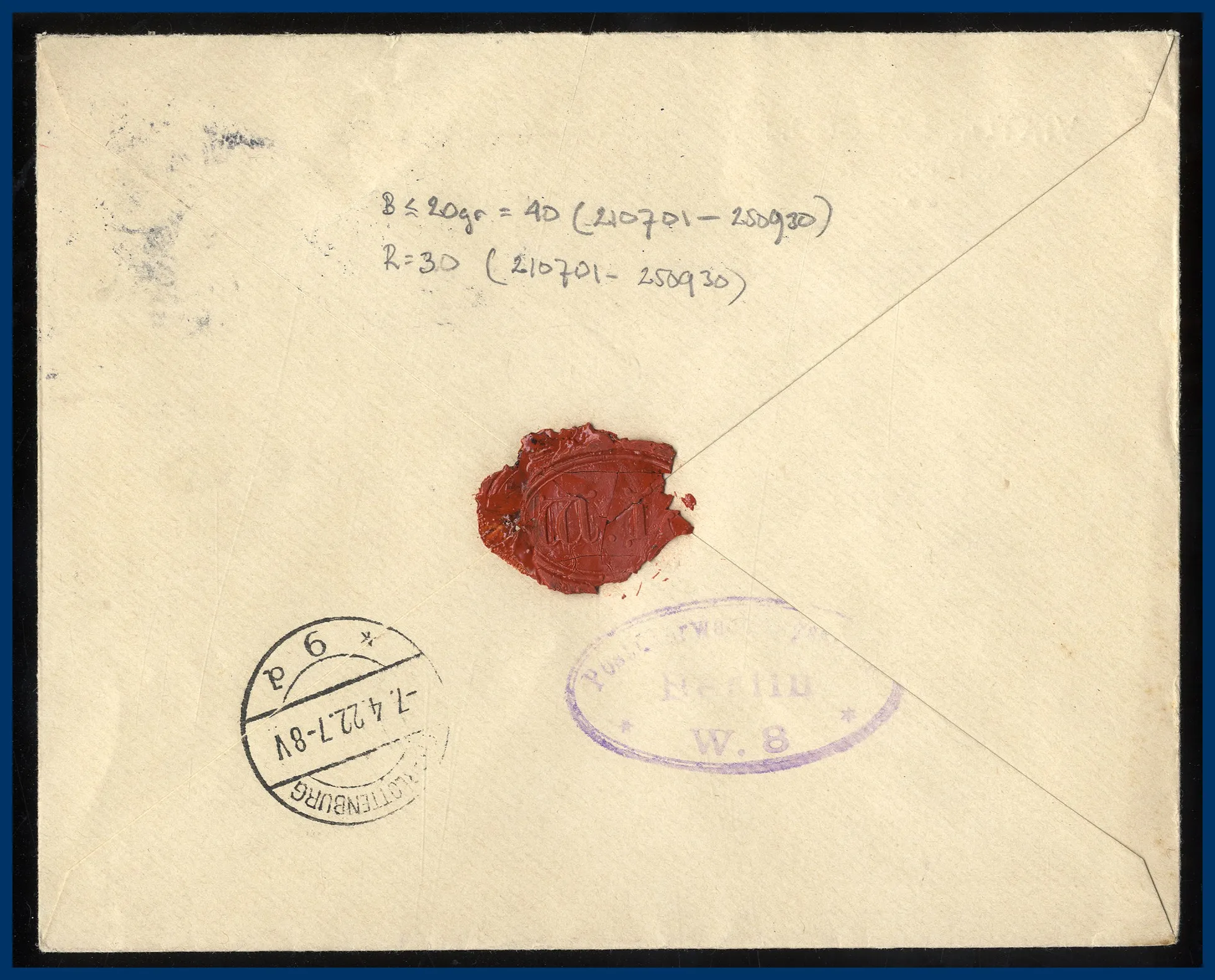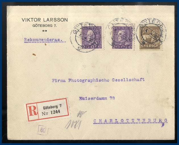 till Tyskland, frankerad med 2x 20 öre Profil vänster (F.179A) samt 30 öre Stående Lejon (F.148A), Korrekt porto.