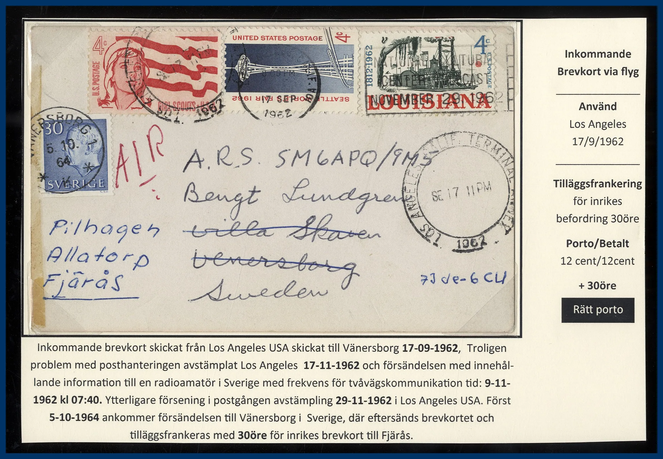 Radioamatör i Vänersborg (SM6APQ/9M5). Försening av postgången från USA med flera datum Sep-Nov 1962 och brevkortet anländer Vänersborg först 5.10.1964 då det tilläggsfrankeras med 30 öre och eftersänds till Fjärås.