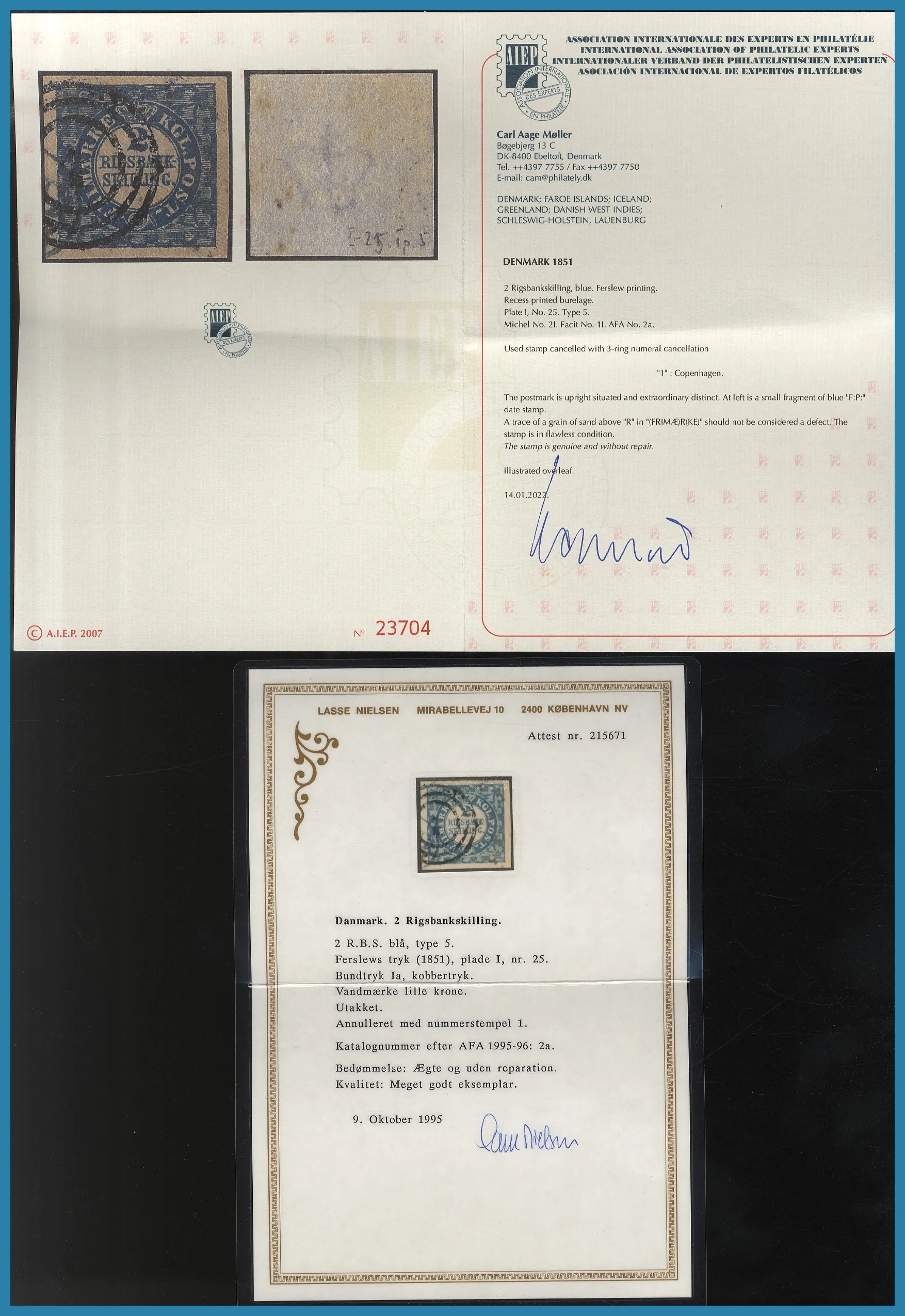 (Köpenhamn). Facit 11.000:-. Det medföljer 2 olika intyg, dels från Nielsen (1995), dels från Møller (2022). Båda säger att märket är äkta och utan reparation. Intygen avbildas i sin helhet på vår hemsida.