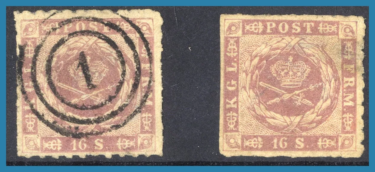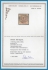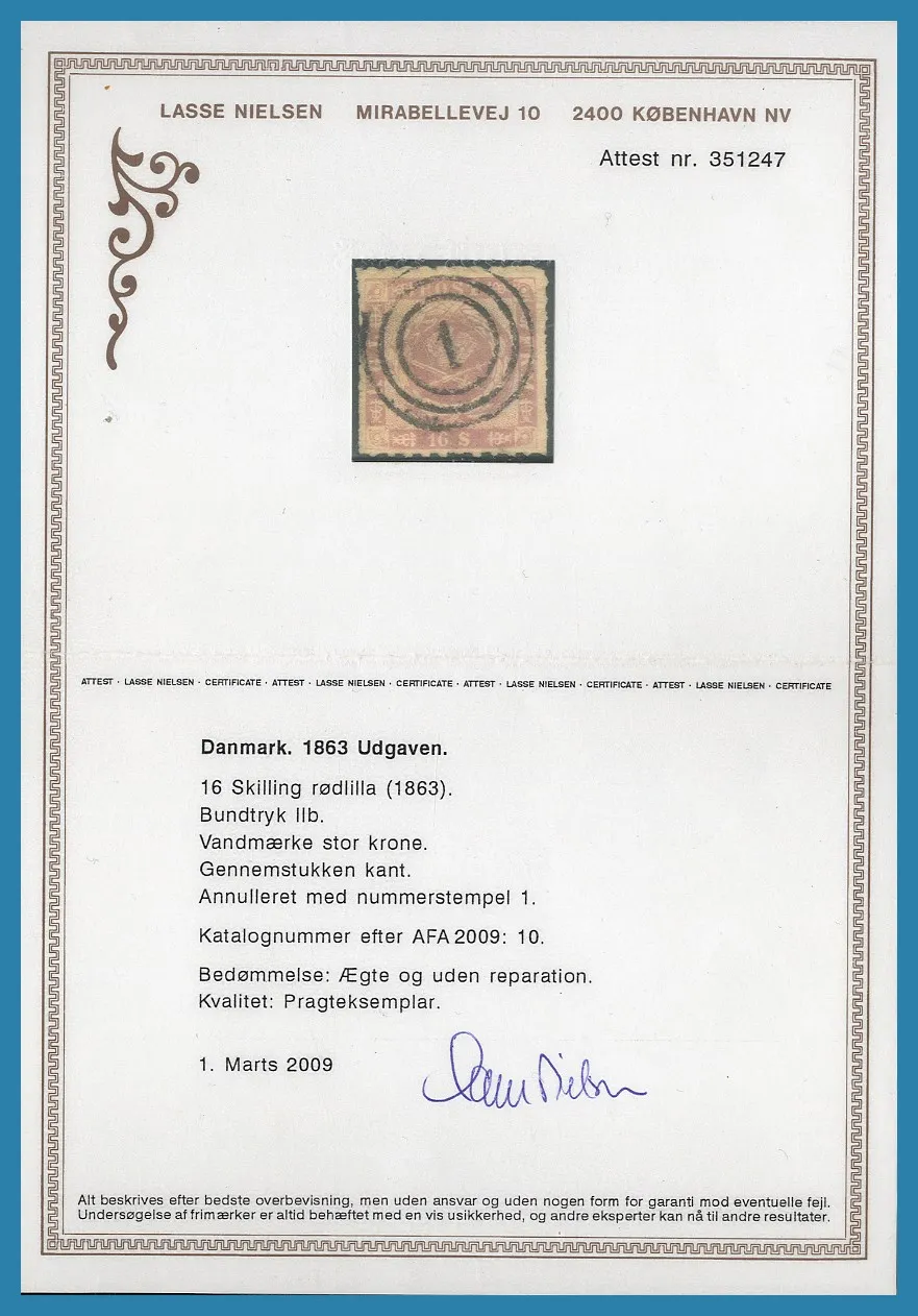 Intyg Nielsen (2009) "Äkta och utan reparation, praktexemplar". Hela intyget avbildas på vår hemsida. Facit 11.000 kr. Till den här posten medföljer även ett ostämplat exemplar av samma märke med riss och utan gummering.