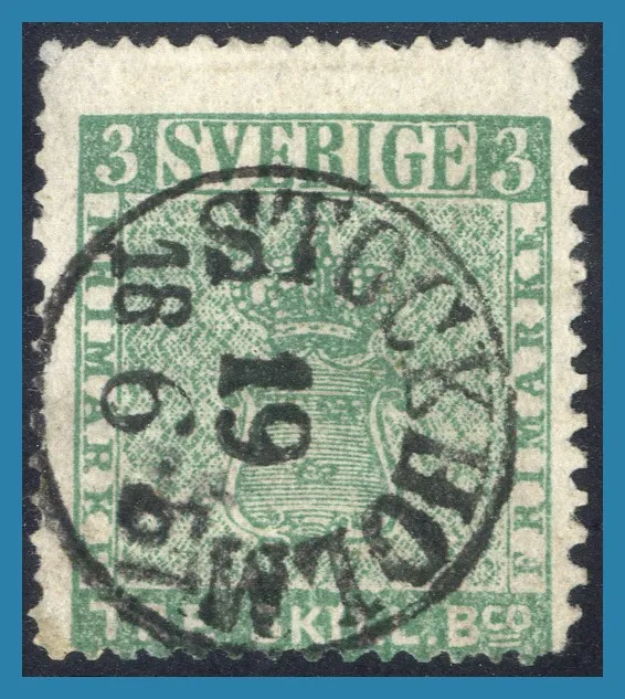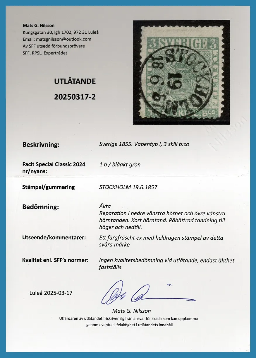 "Äkta, reparation i nedre vänstra hörnet och övre vänstra hörntanden. Kort hörntand. Påbättrad tandning till höger och nedtill." Facit för märke utan reparationer och i bra kvalitet 50.000:-