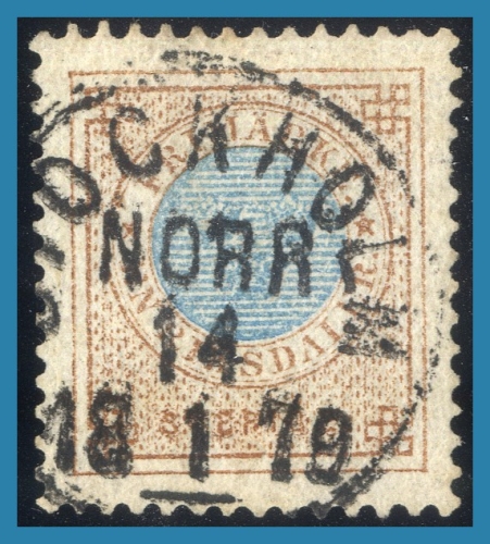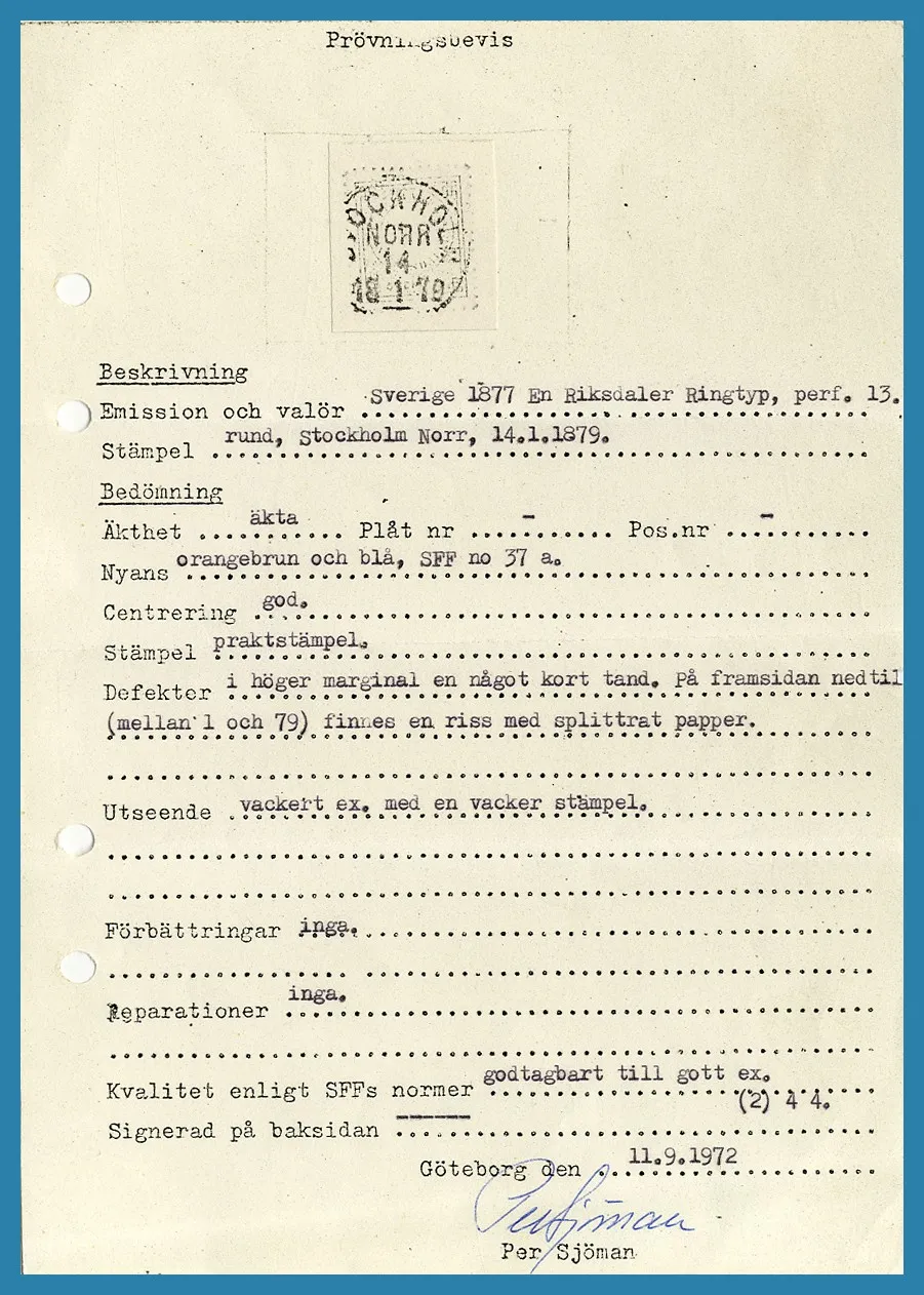 NORR 1879-01-14. Intyg Sjöman (1972) "Vackert ex med praktstämpel, inga reparationer eller förbättringar, dock nkt samt nedtill ett riss, godtagbart till gott ex med kvalitet (2),4,4". Facit 4000:-