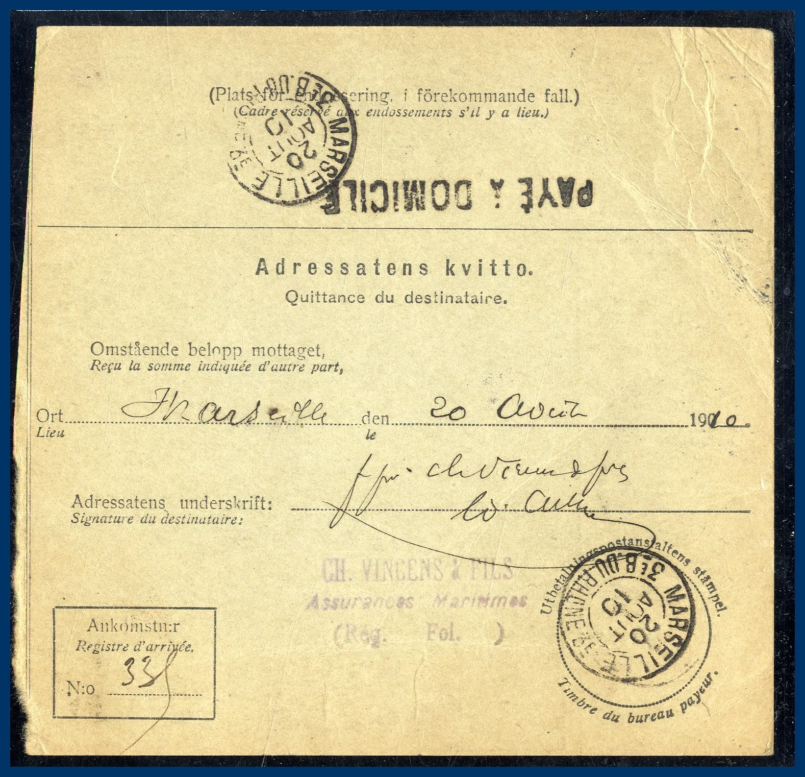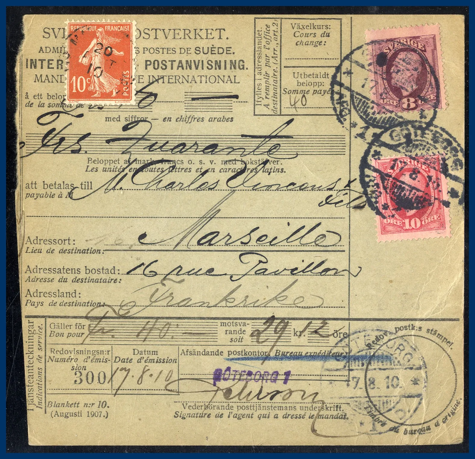 231. (A) Internationell postanvisning (40 Francs) frankerad med