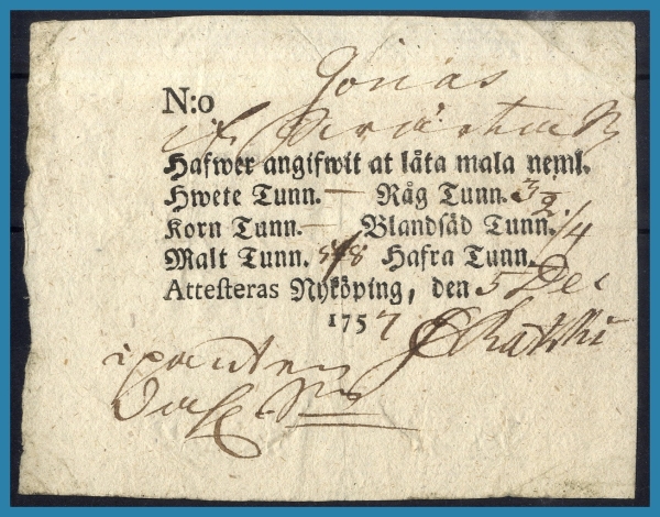 (A) Kvitto på betald Kvarntull Nyköping 1757.