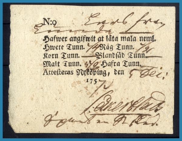 2. (A) Kvitto på betald Kvarntull Nyköping 1757.