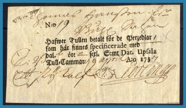 1. (A) Kvitto på passagetull (eller landtull) Linköping 1742