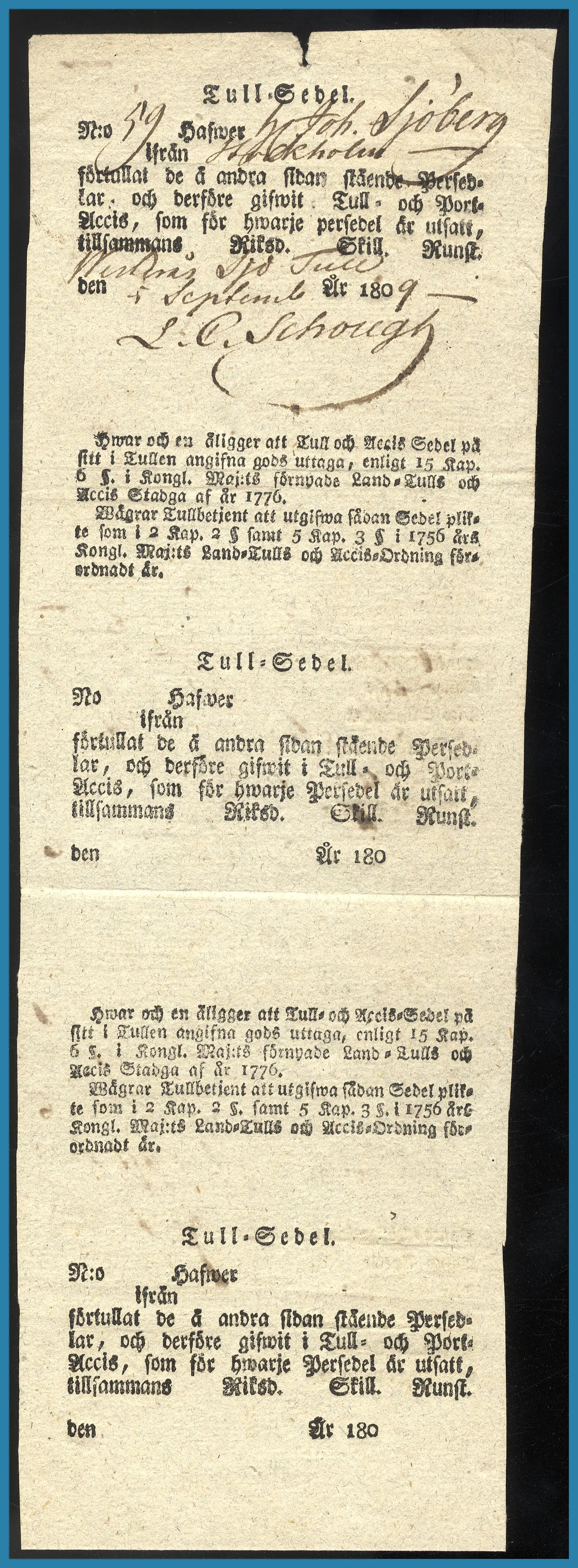 6. (A) Kvitto på passagetull, Sjötull. Västerås sjötull 1809.