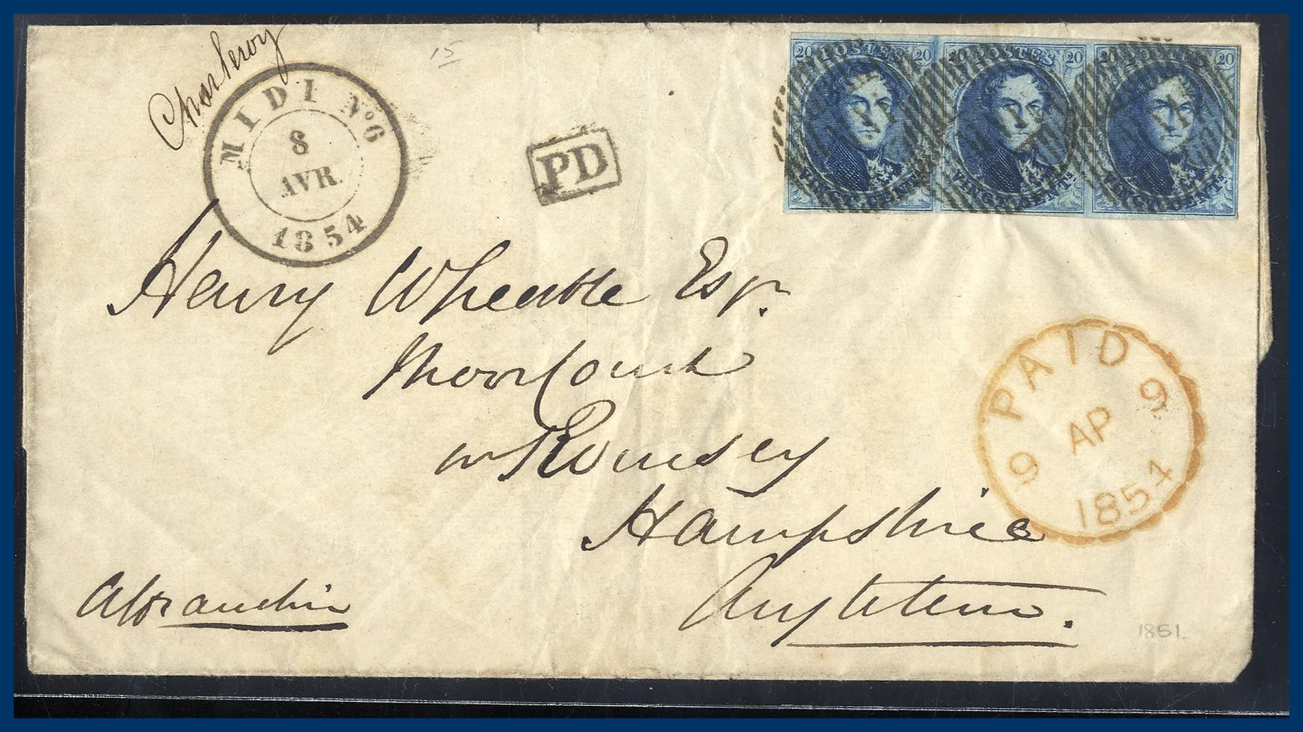 314. (A) Otandat 3-strip 20 centimes Leopold I (Mi. 4) på vackert