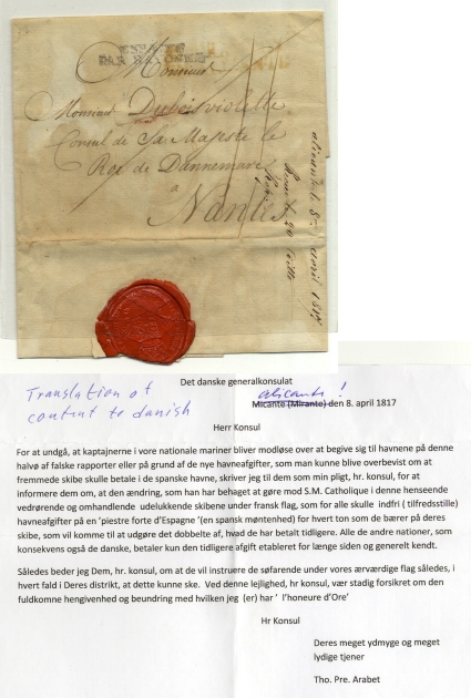 Bayonne (Rakstämpel) till Nantes, Frankrike. Vackert brev med innehåll från det Danska Generalkonsulatet i Alicante (se vaxsigill) till den Danska Konsuln i Nantes med lång innehåll som handlar om Hamnavgifter för Danska fartyg (Översättning av hela innehållet medföljer) Lösenanteckning 11 centimes.