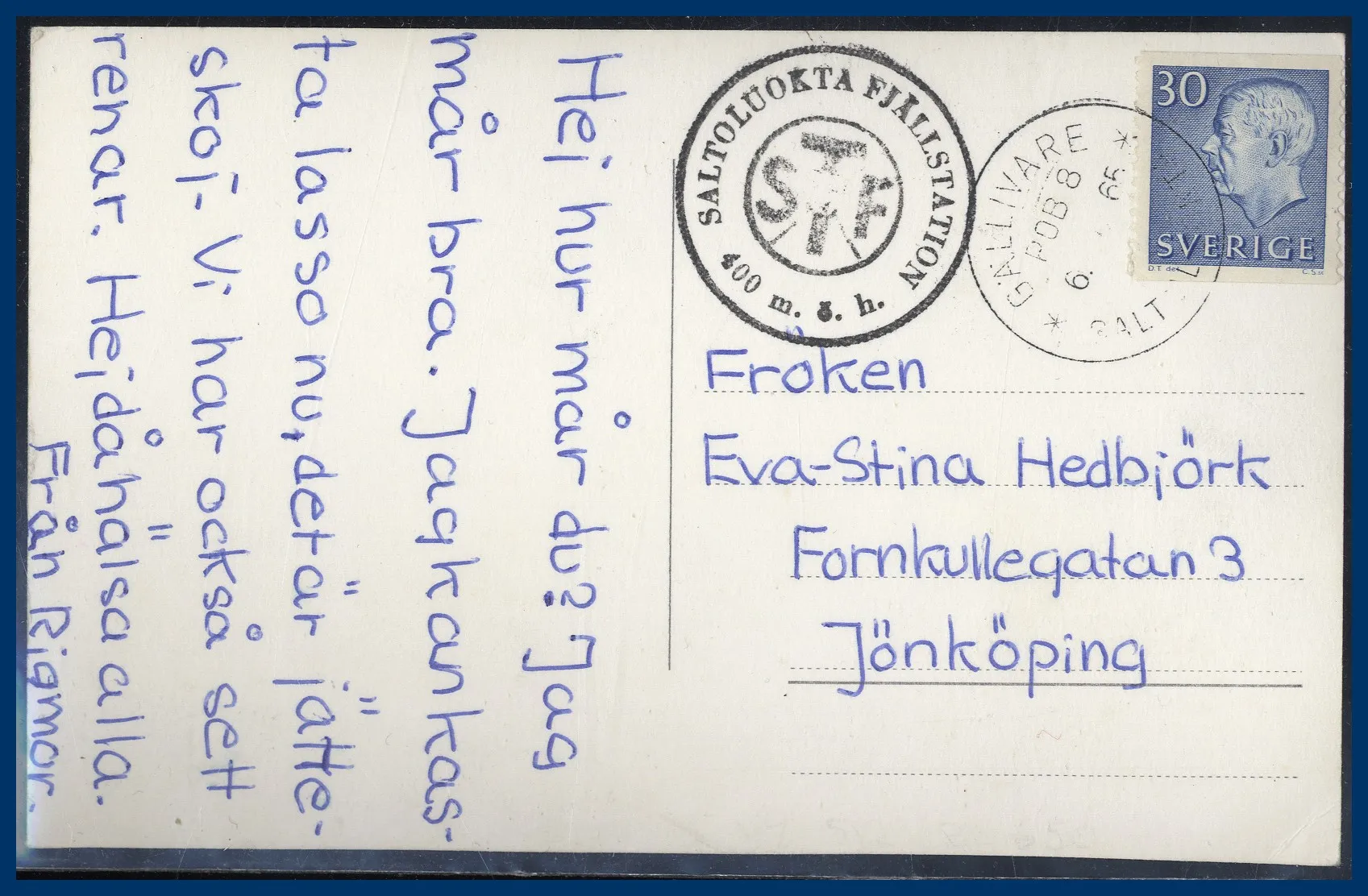 fjällstationer. På många av dessa fanns det postombud. 30 öre inrikes brevkort avstämplat "GÄLLIVARE POB 8 SALTOLUOKTA 6.x.1965" som var en aktiv fjällstation mellan perioden 20.6.1964-5.9.1965. Mycket ovanlig stämpel.