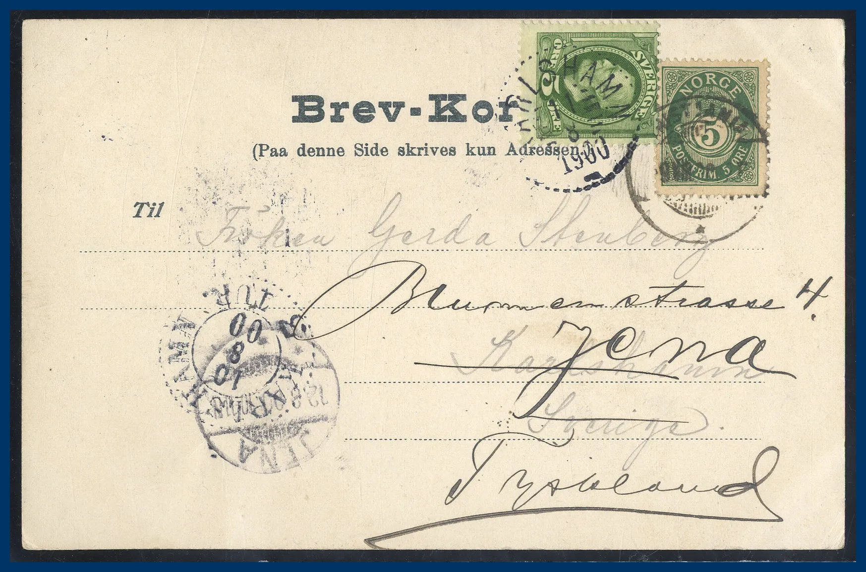278. (A) Studsbrev. 5 öre vykort "KRISTIANIA 9.VIII.1900" sänt