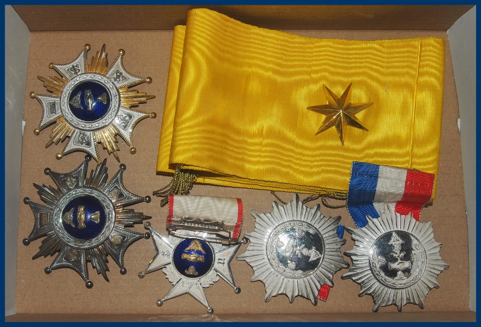 455. (B) 5 st Frimurarordnar i vitmetall/blå emalj och två st med