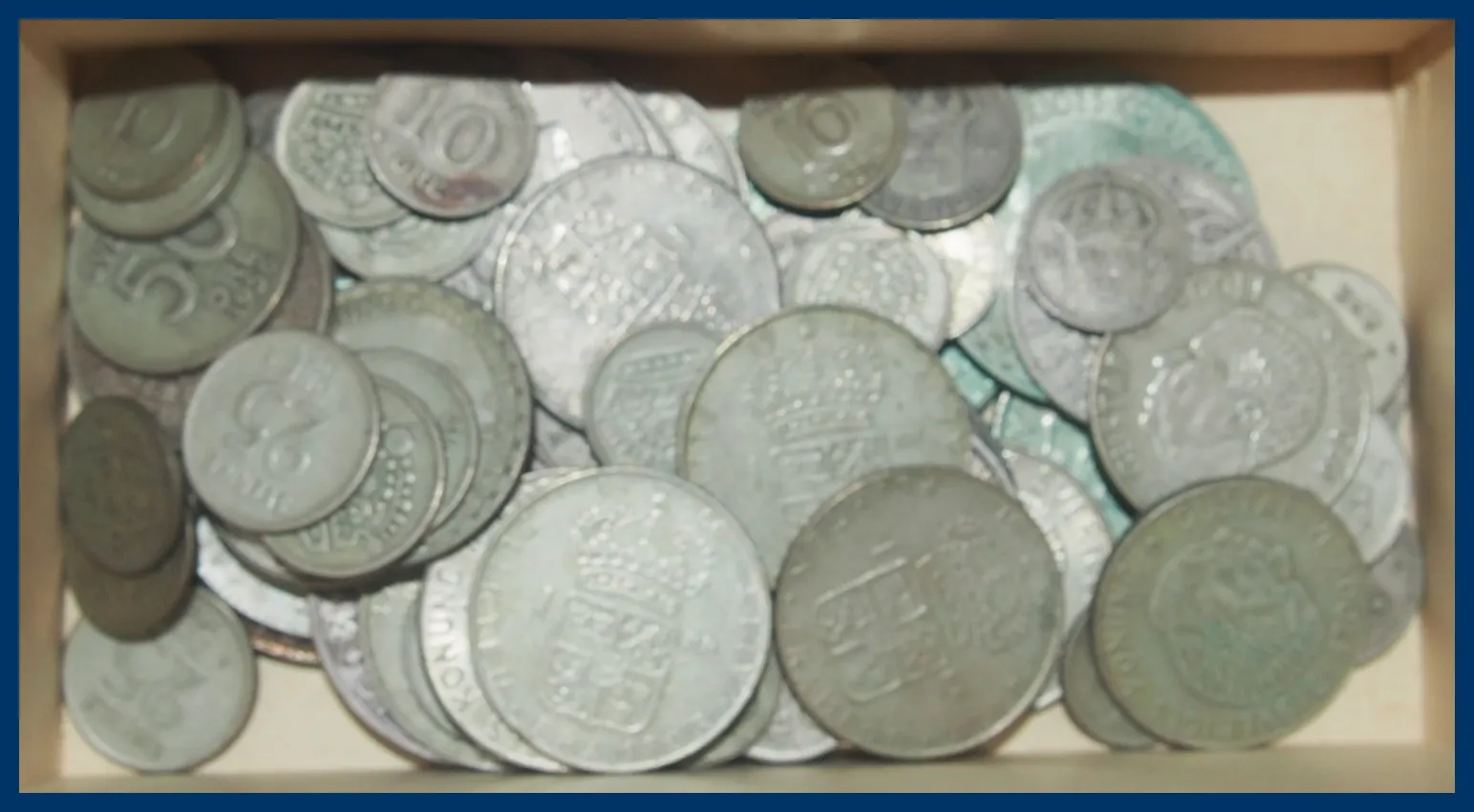 2 kr -1966 (2 st), 1 kr -1942 (5 st), 1 kr -1968 (11 st), 50 öre (1 st), 25 öre -1941 (5 st), 25 öre -1961 (12 st), 10 öre (21 st).