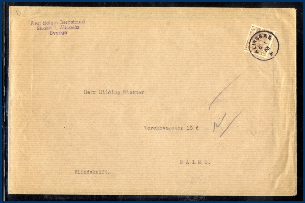68. (C) 3 öre (F.73) inrikes Blindskriftsbrev med Braille innehåll