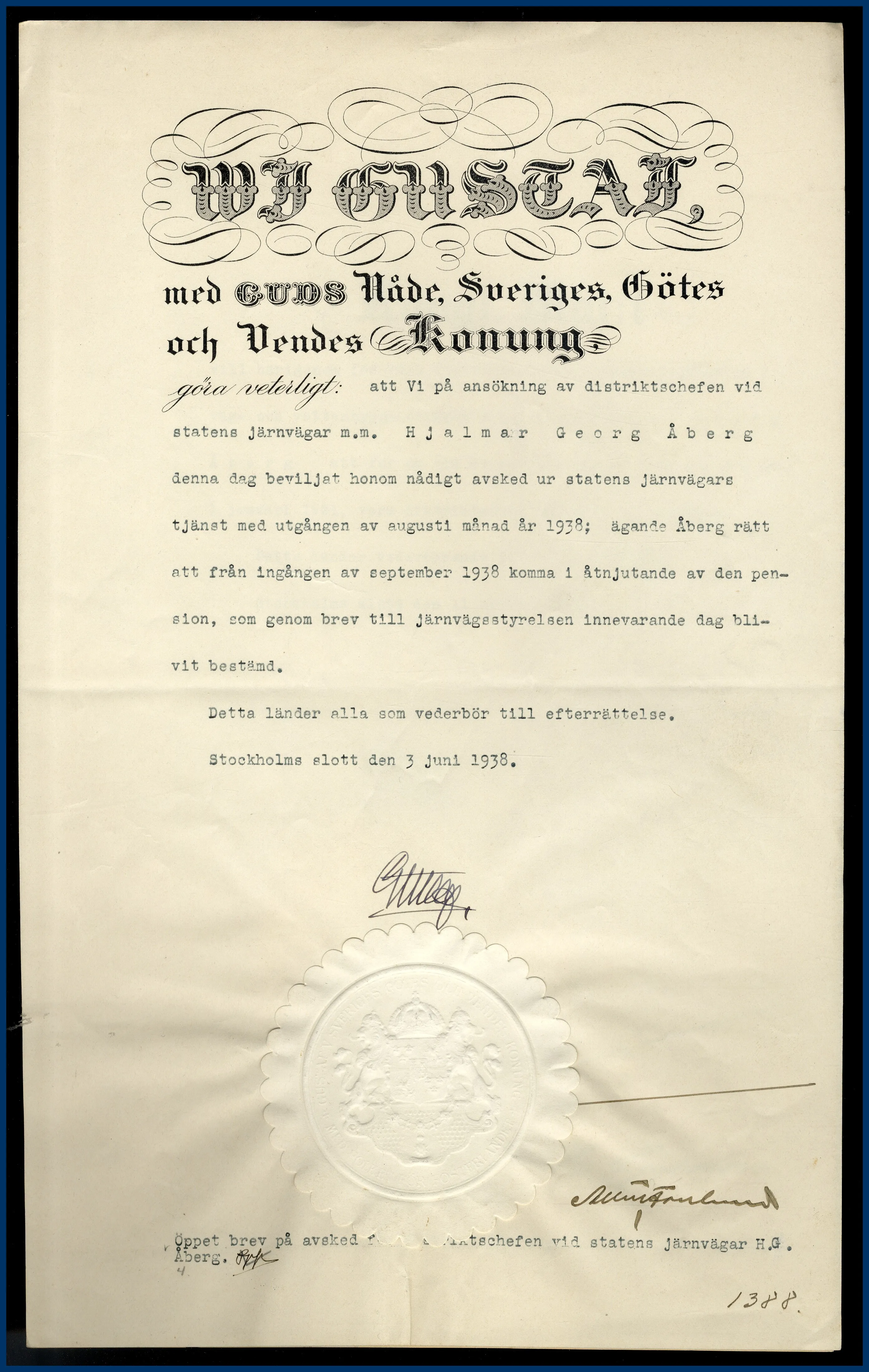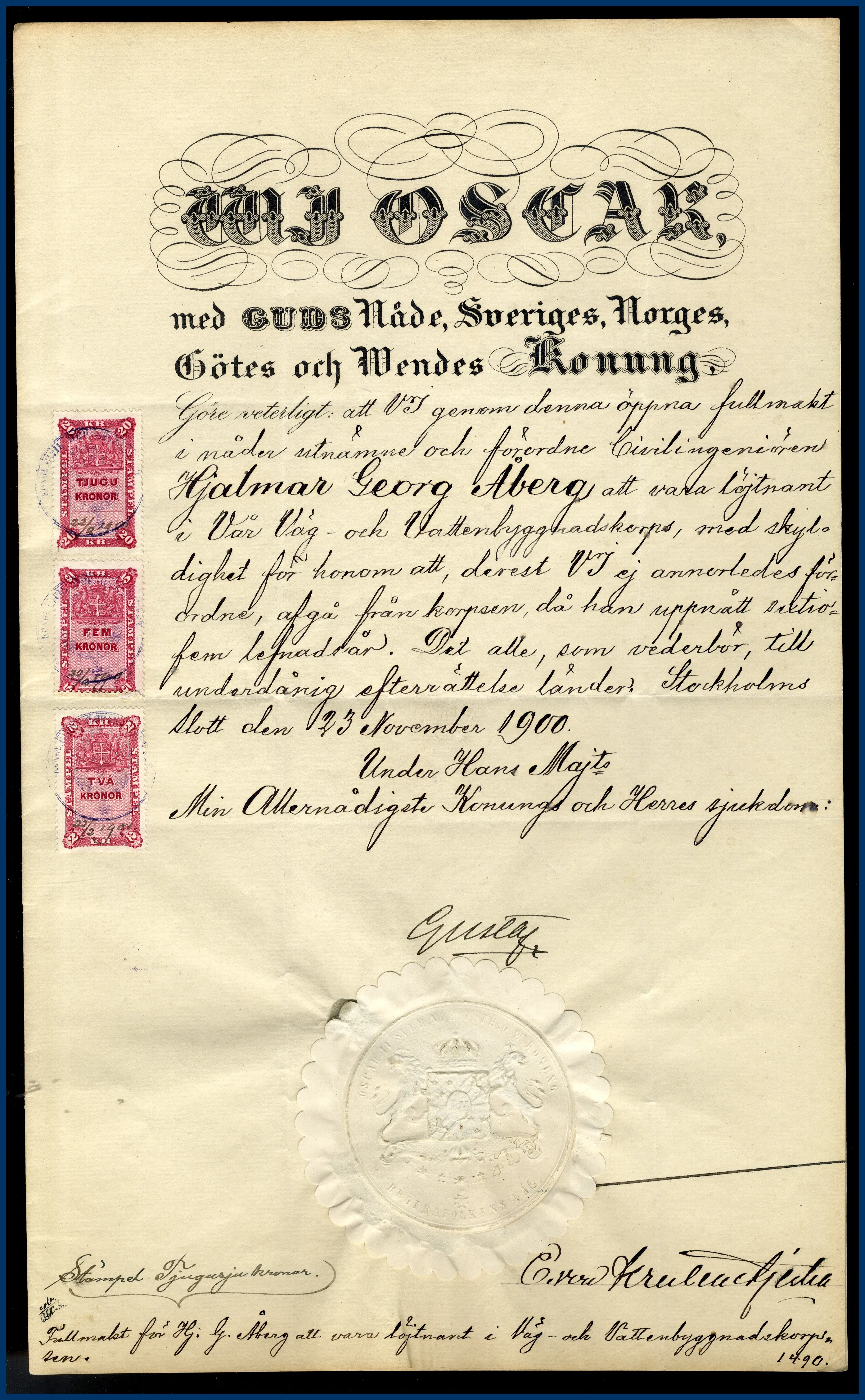 i original (med papperssigill) och ställda till Hjalmar Georg Åberg 1900-1938. Det första är en Löjtnantsfullmakt 1900 Underskrivet av Gustav (När Oscar II var sjuk), 1910 Kaptensfullmakt, 1911 utnämning Byråingenjör Statens Järnvägar, 1922 utnämning Överstelöjtnant Väg och Vattenbyggnadskåren, 1930 utnämning Distriktschef Statens Järnvägar, 1938 Pensionsbrev.