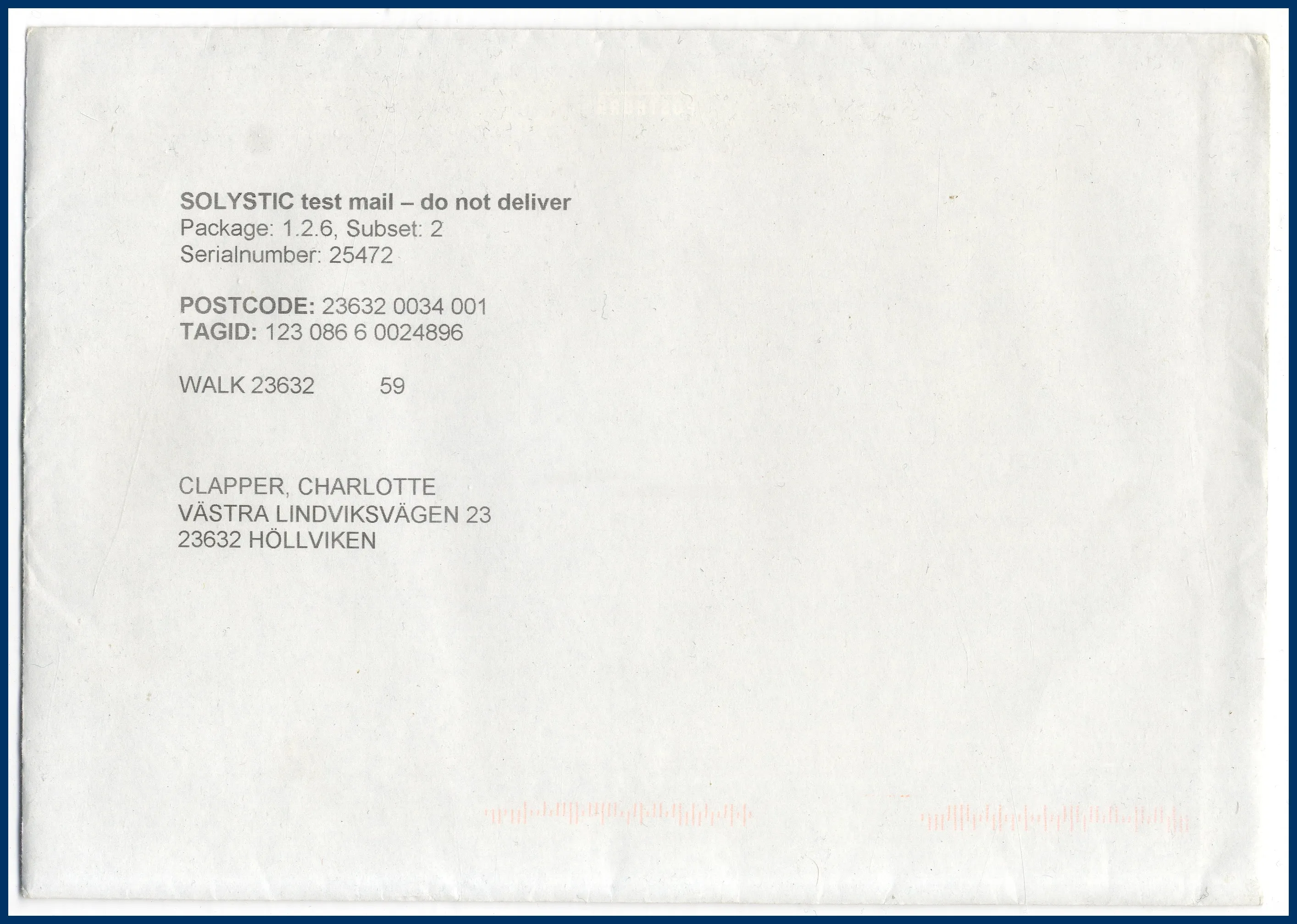 276. (C) SOLYSTIC test mail. Testbrev för Postens IRM-maskiner.