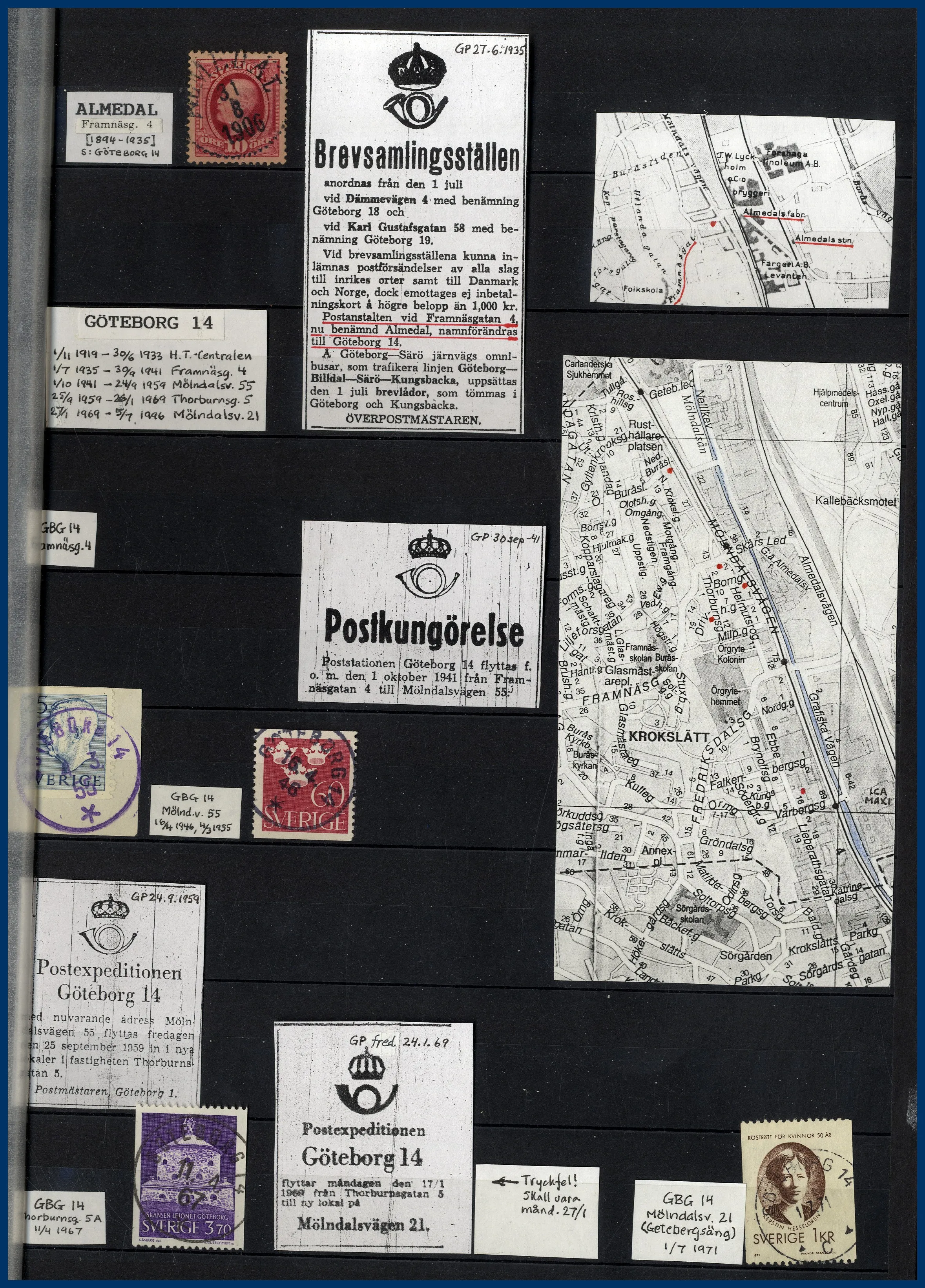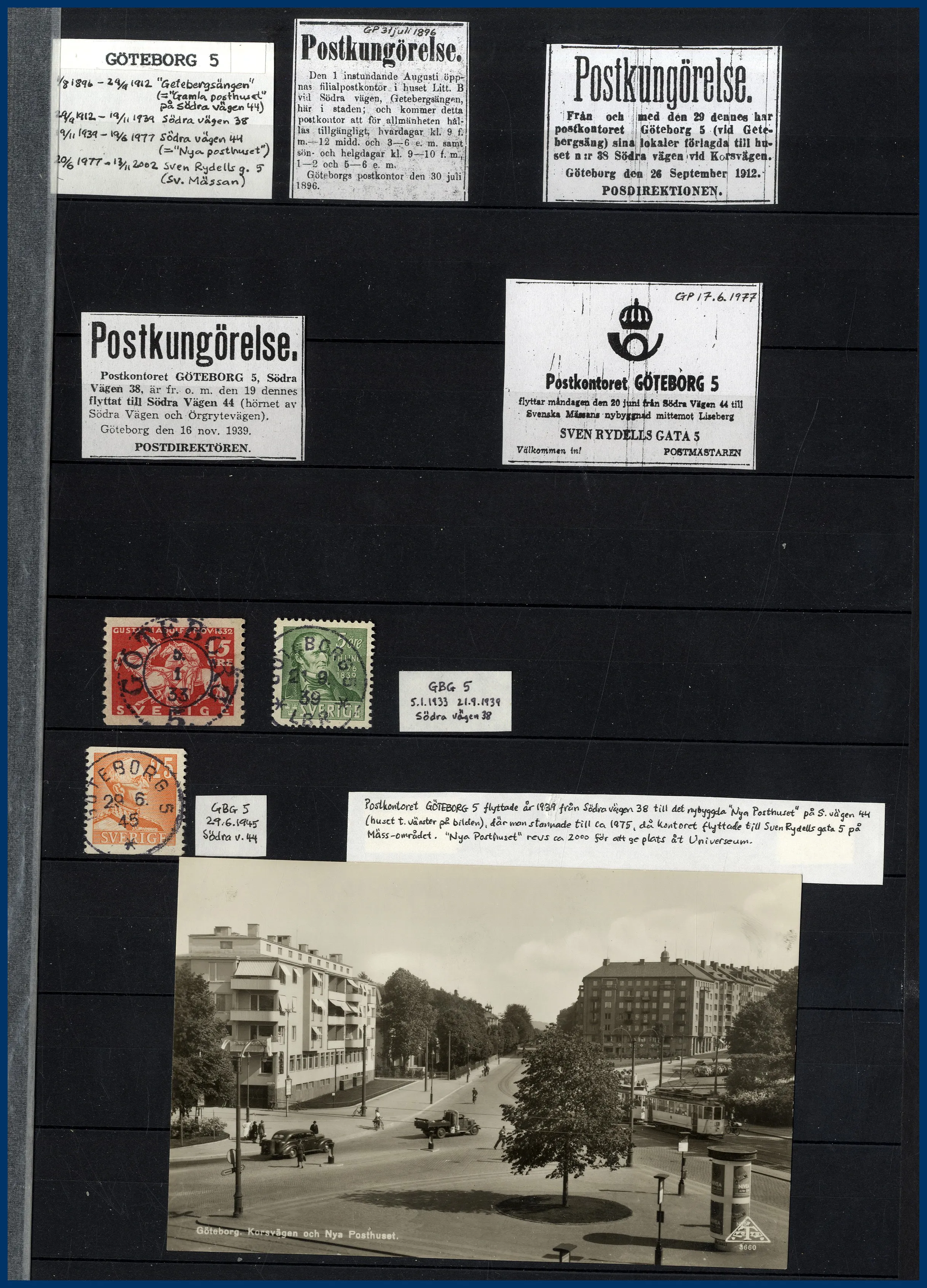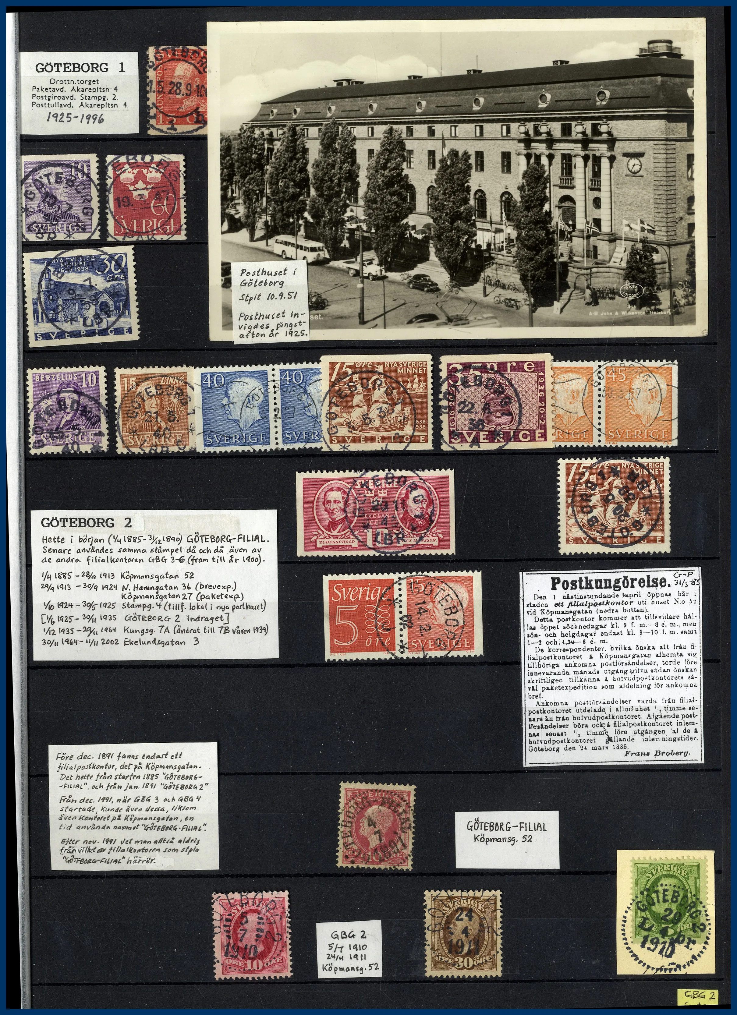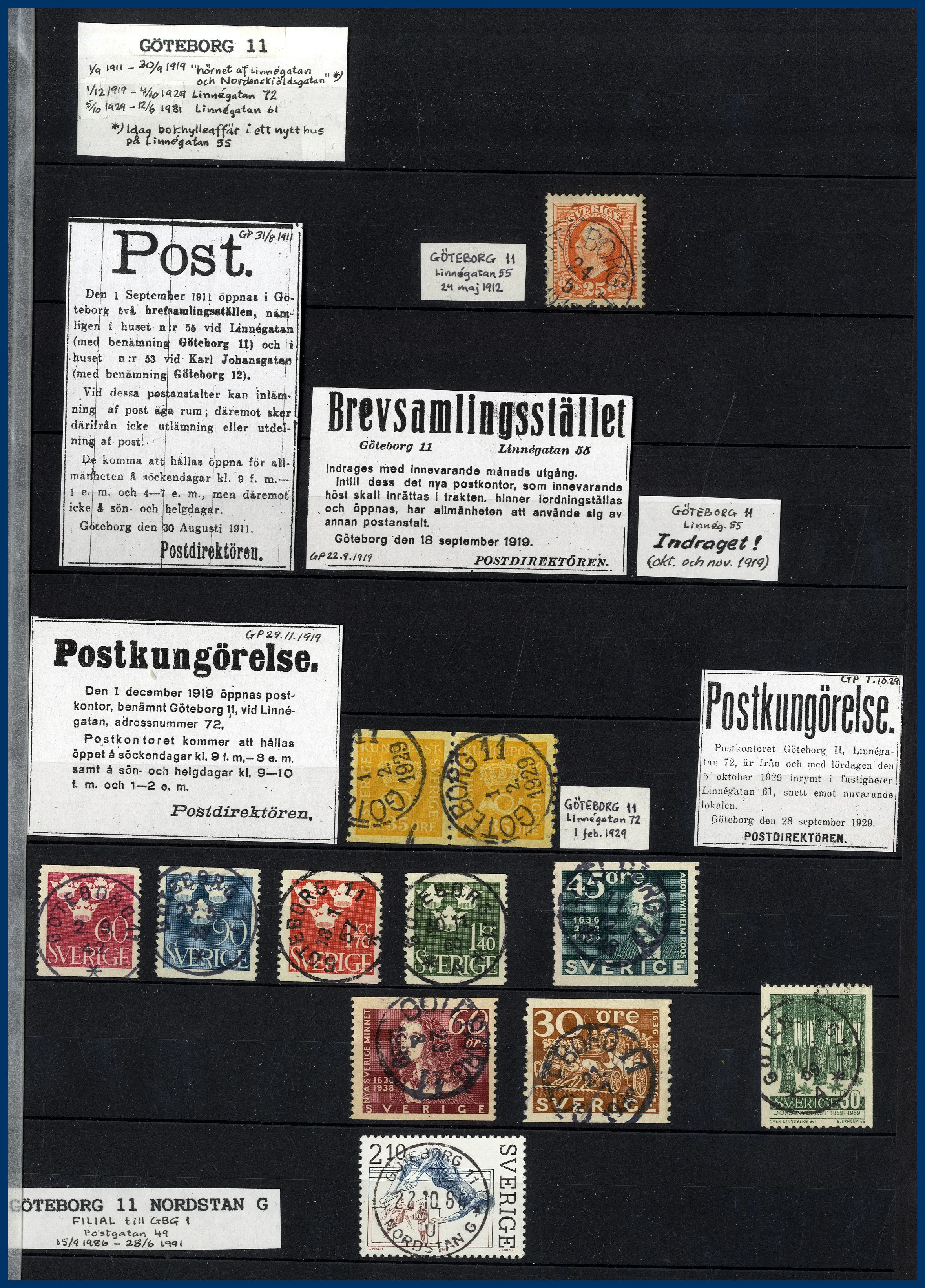 inriktning på stadens olika postkontor. Förutom en hel del vackert stämplade frimärken och enstaka vykort finns mängder med intressant information om de olika kontoren i form av kopierade tidningsartiklar och postkungörelser. Mycket trevlig post för den som är intresserad av historien kring vår stads olika postkontor.