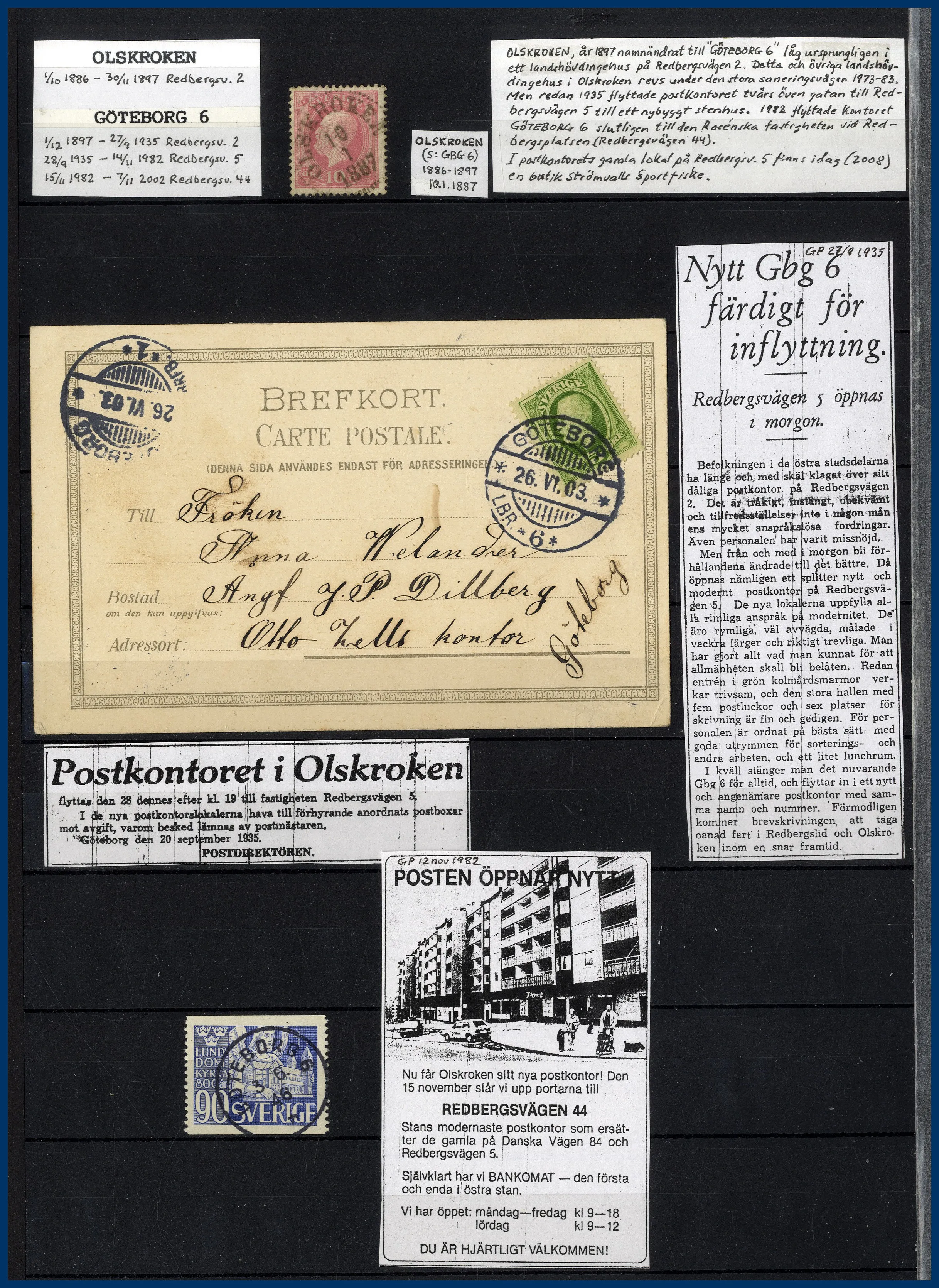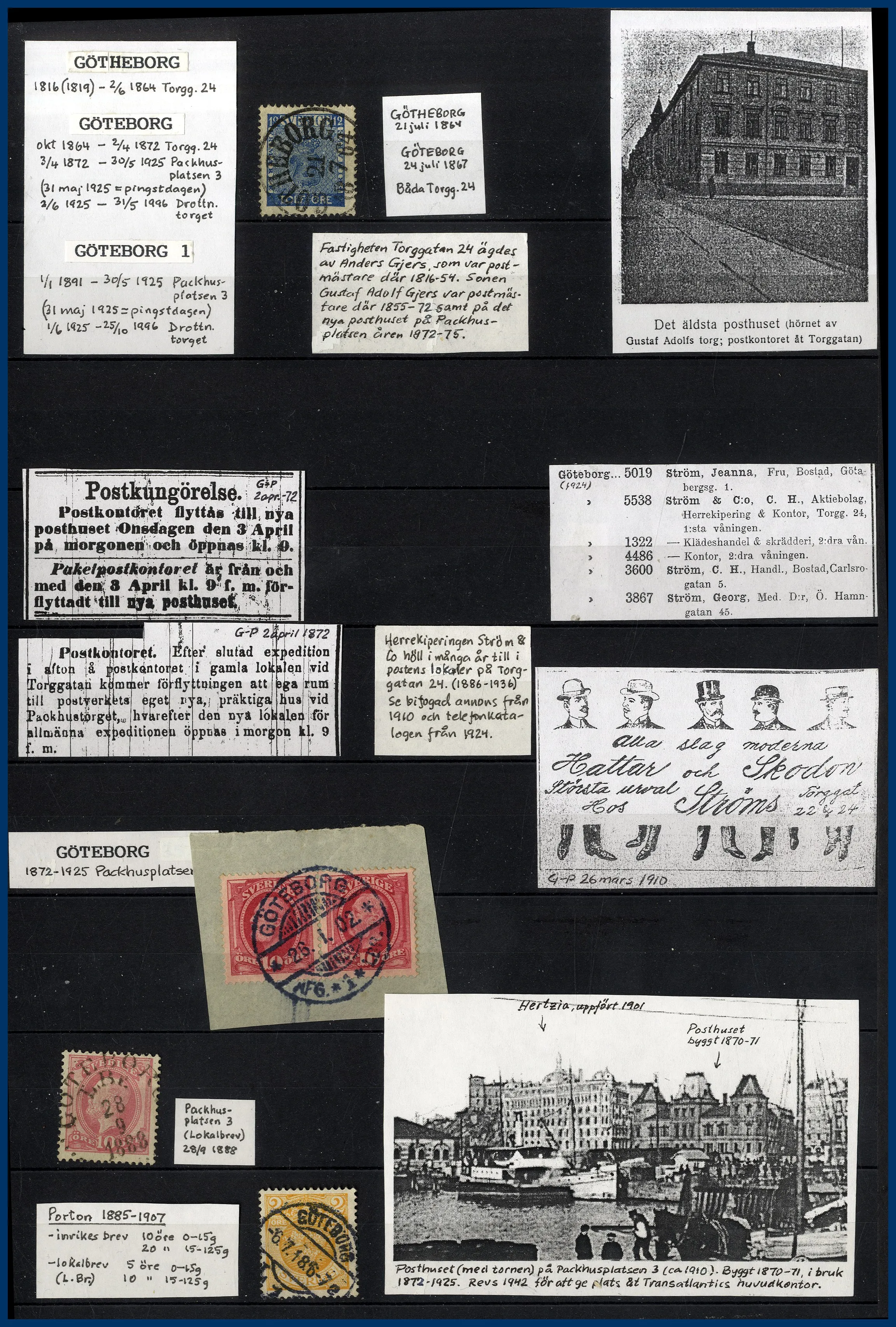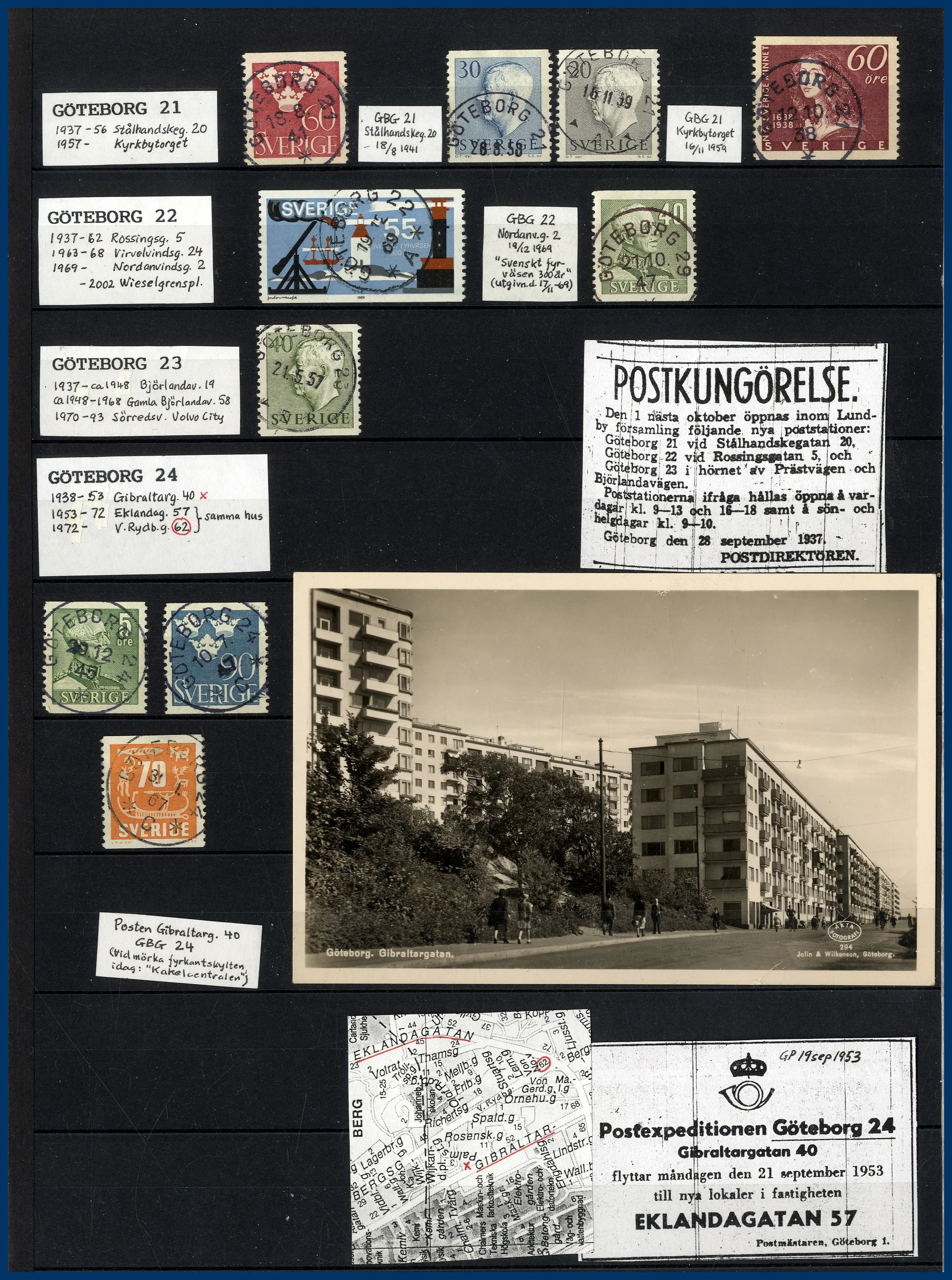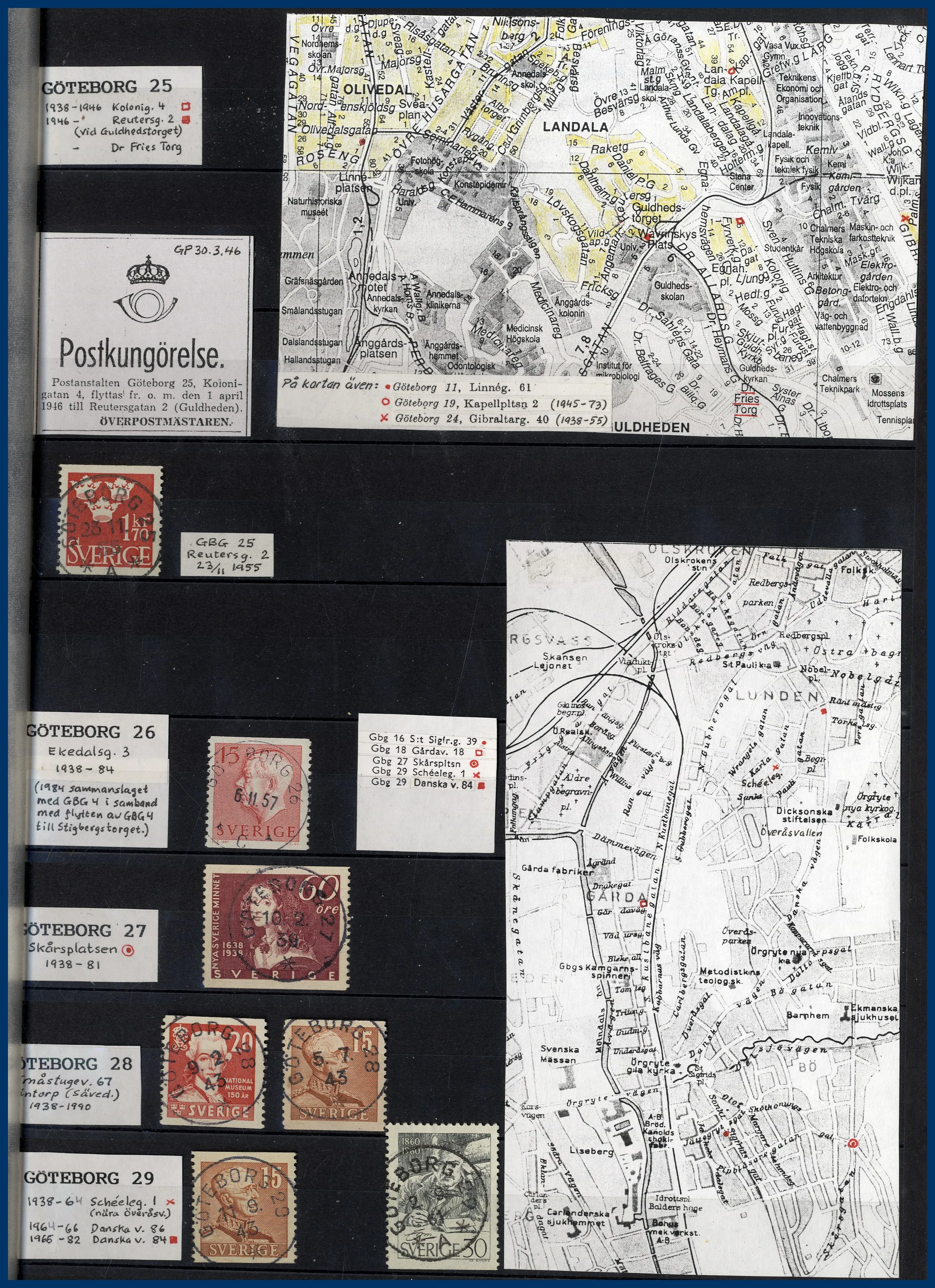 inriktning på stadens olika postkontor. Förutom en hel del vackert stämplade frimärken och enstaka vykort finns mängder med intressant information om de olika kontoren i form av kopierade tidningsartiklar och postkungörelser. Mycket trevlig post för den som är intresserad av historien kring vår stads olika postkontor.