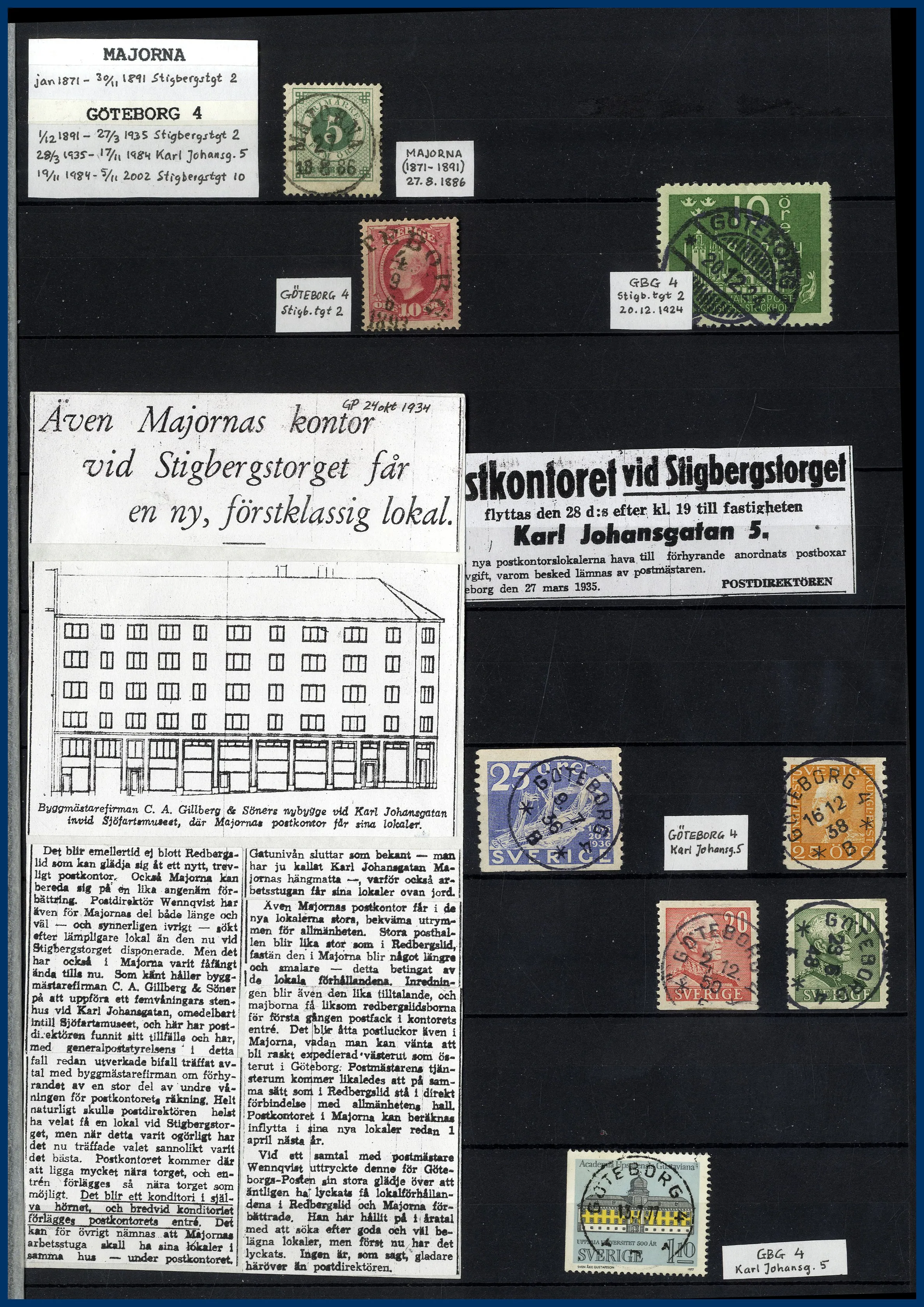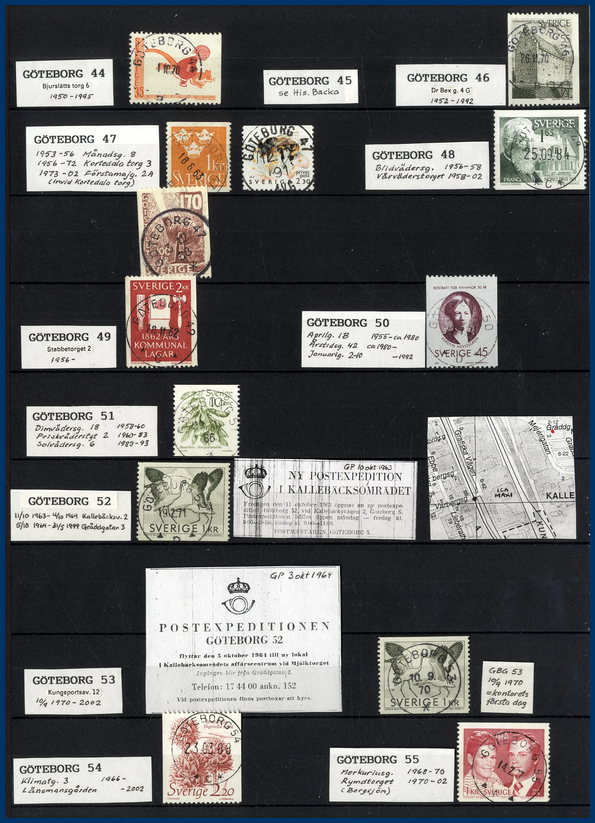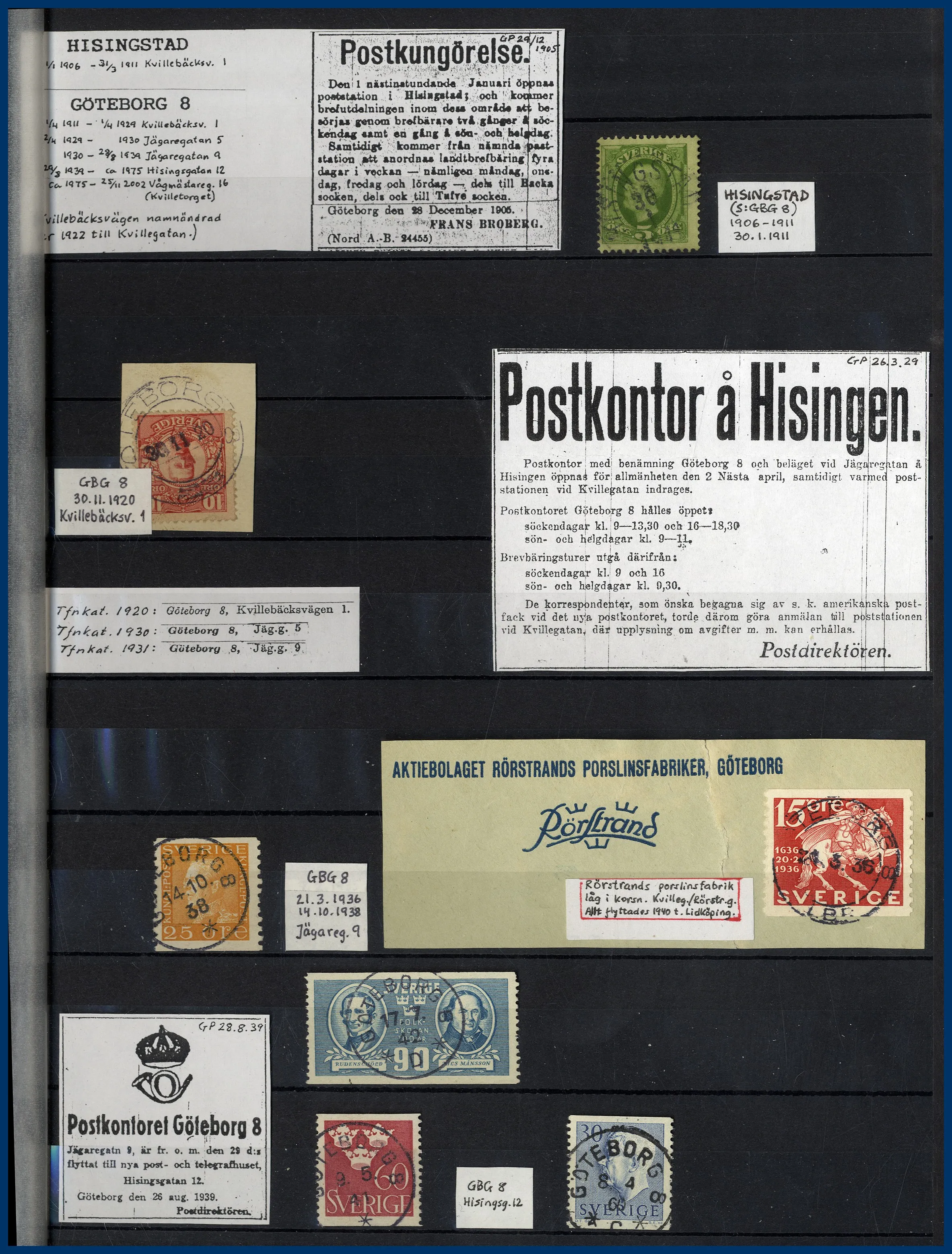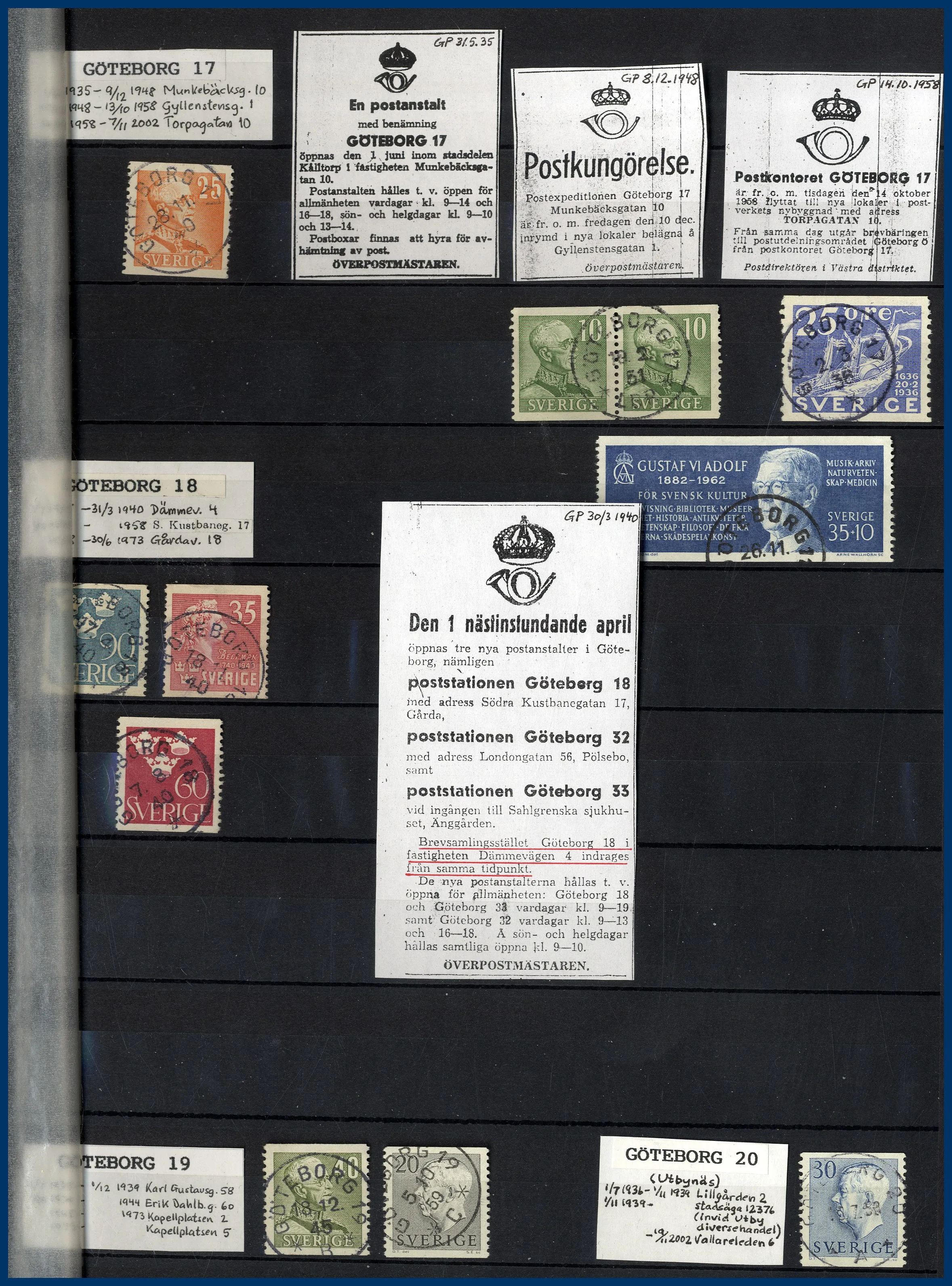 inriktning på stadens olika postkontor. Förutom en hel del vackert stämplade frimärken och enstaka vykort finns mängder med intressant information om de olika kontoren i form av kopierade tidningsartiklar och postkungörelser. Mycket trevlig post för den som är intresserad av historien kring vår stads olika postkontor.