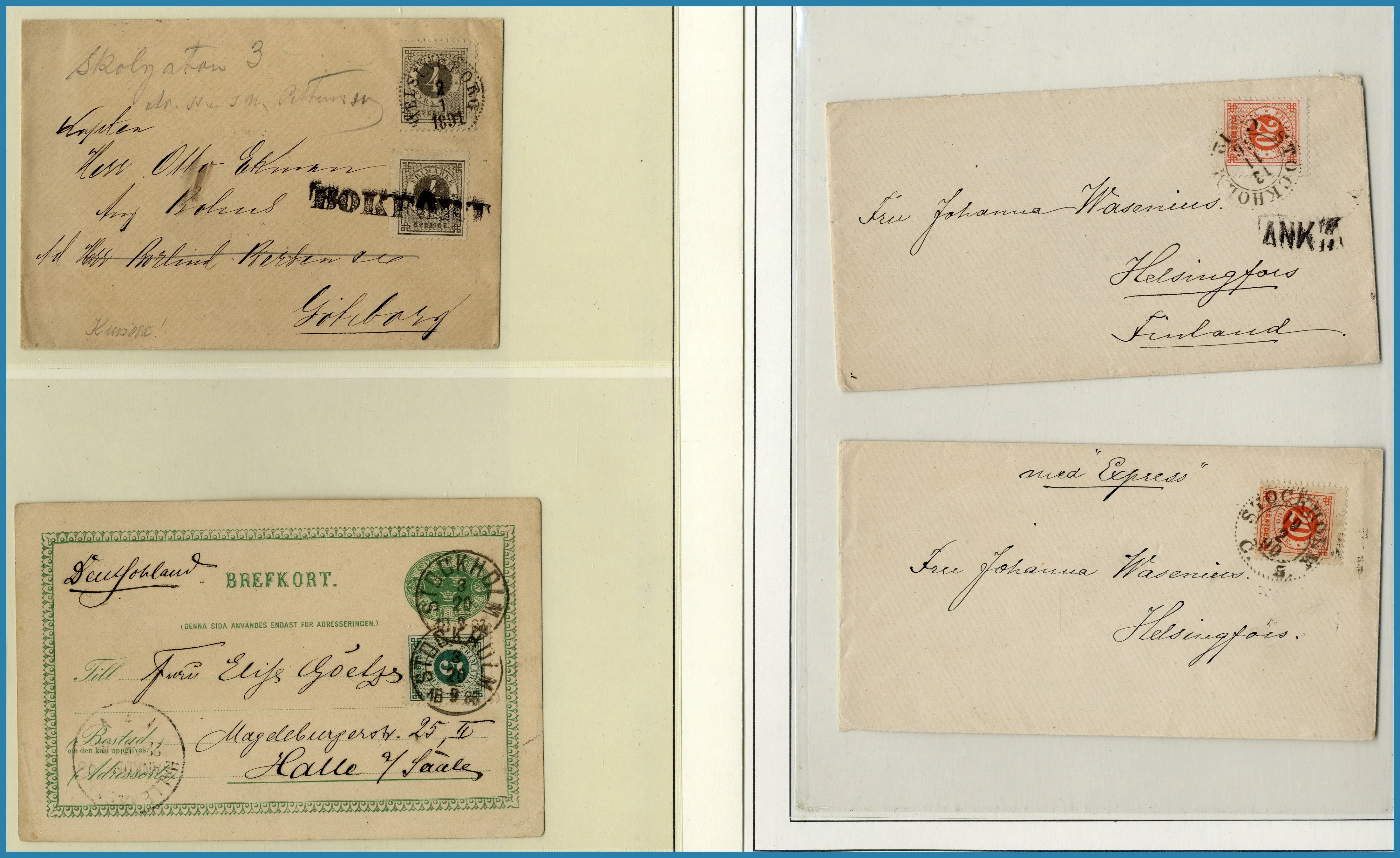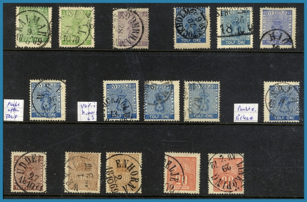 stämplade märken Vapentyp och Liggande lejon i blandad kvalitet samt 68 st vackert stämplade Ringtypsmärken. Därefter följer ett 4 Sk.-brev, 10 st brev frankerade med 12 öre Vapen samt 9 st Ringtypsförsändelser.