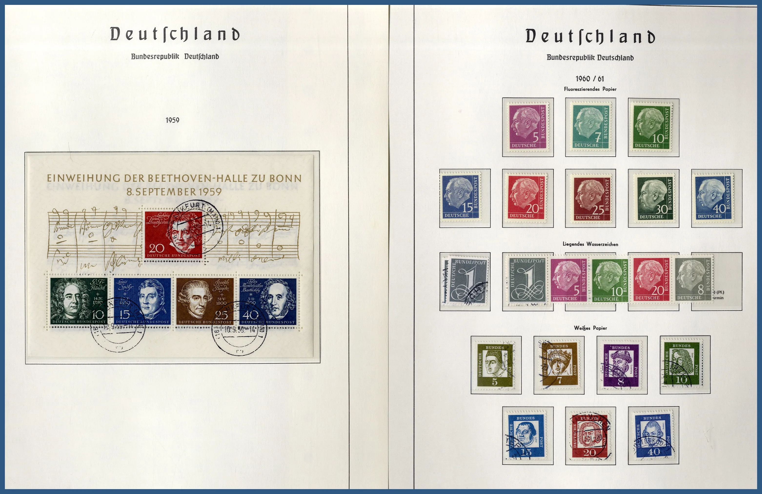 i 13-ringade pärmar. Omfattar åren 1949-1998 och stämplad i huvudnummer komplett, Heuss "lumogen" och liggande vm dock ostämplade. En mycket trevlig samling på egengjorda blad. En hel del fina läsbara stämplar på det lite modernare. Även lite sammantryck och annat extra.