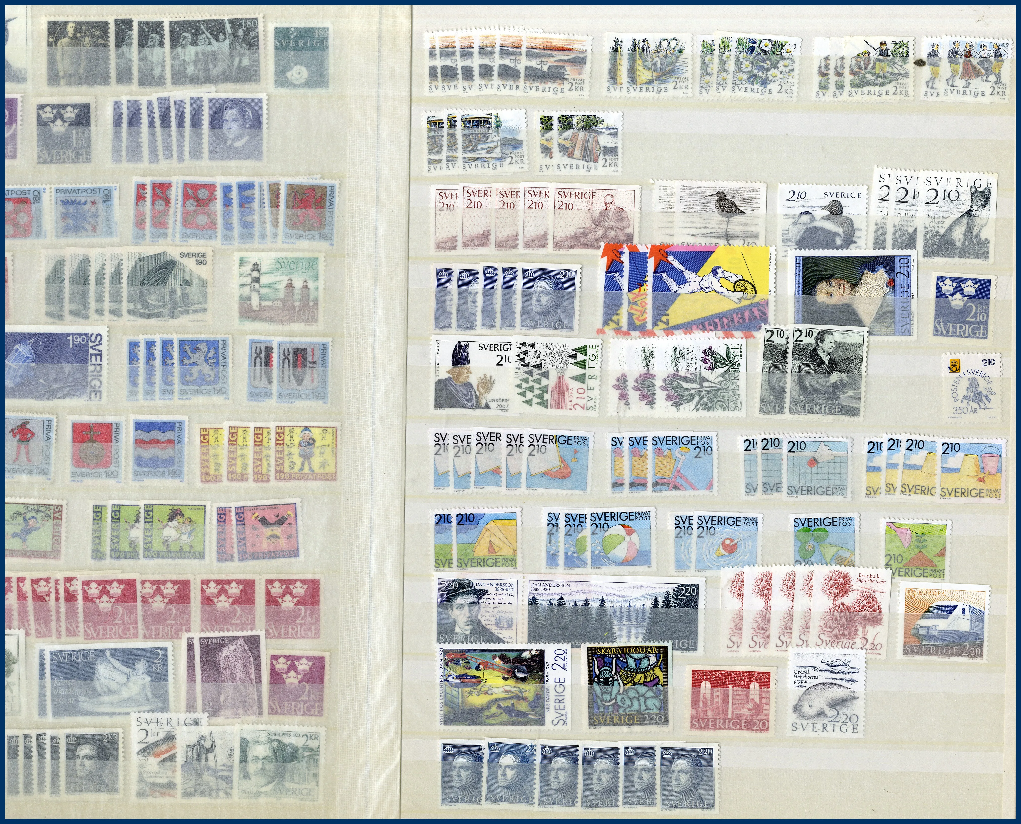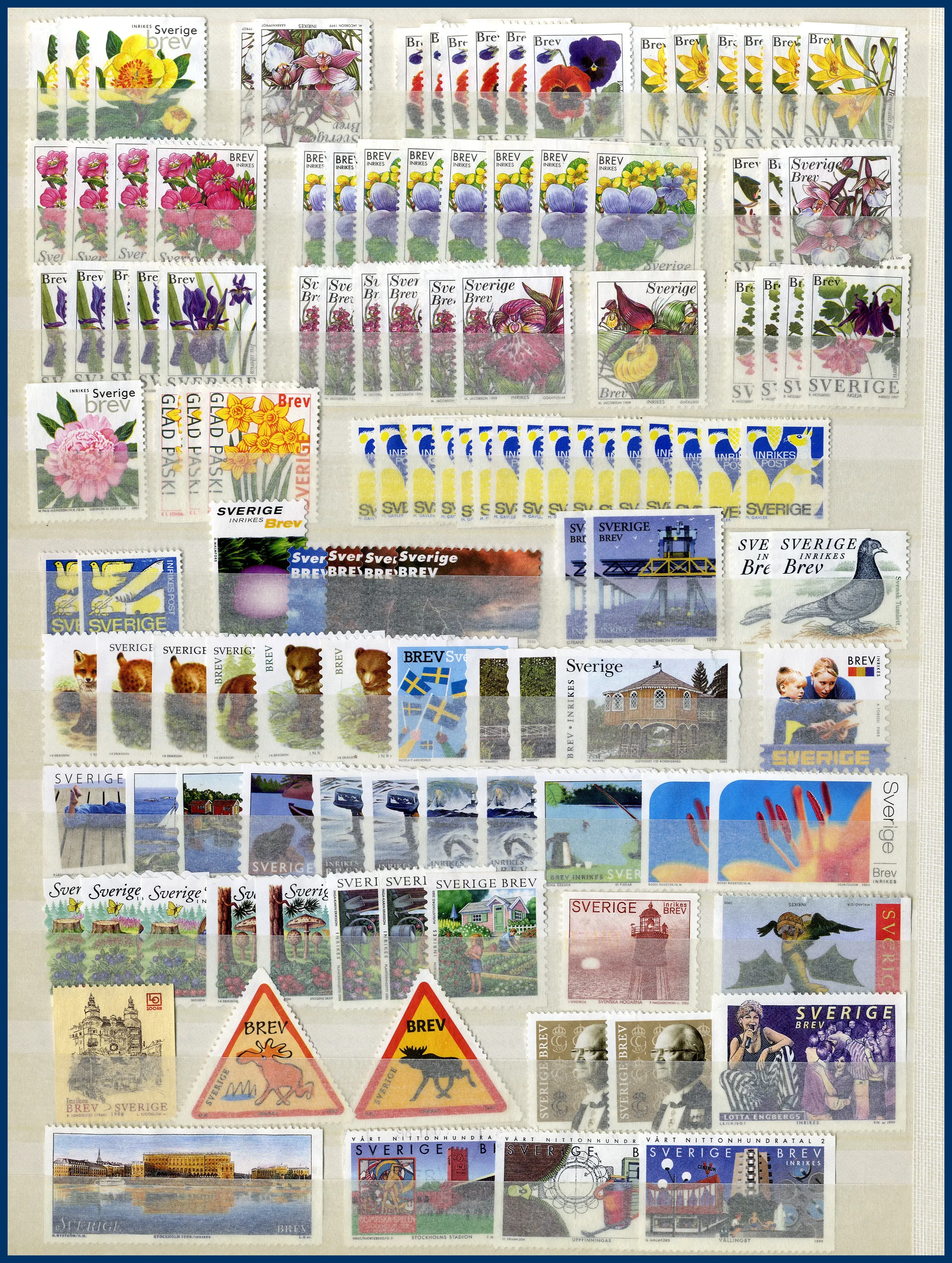 en mycket stor andel saknar gummering. Bl a ingår ca 150 rabattfrimärken, mer än 200 st Sverige Brev och även en hel del Julpost.
