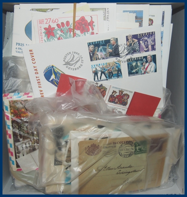 20.000 kr i form av främst årssatser, häftesårssatser och årsböcker med mycket stor andel Sverige Brev. Överst i lådan ligger lite annat filatelistiskt småkrafs utan något större värde.