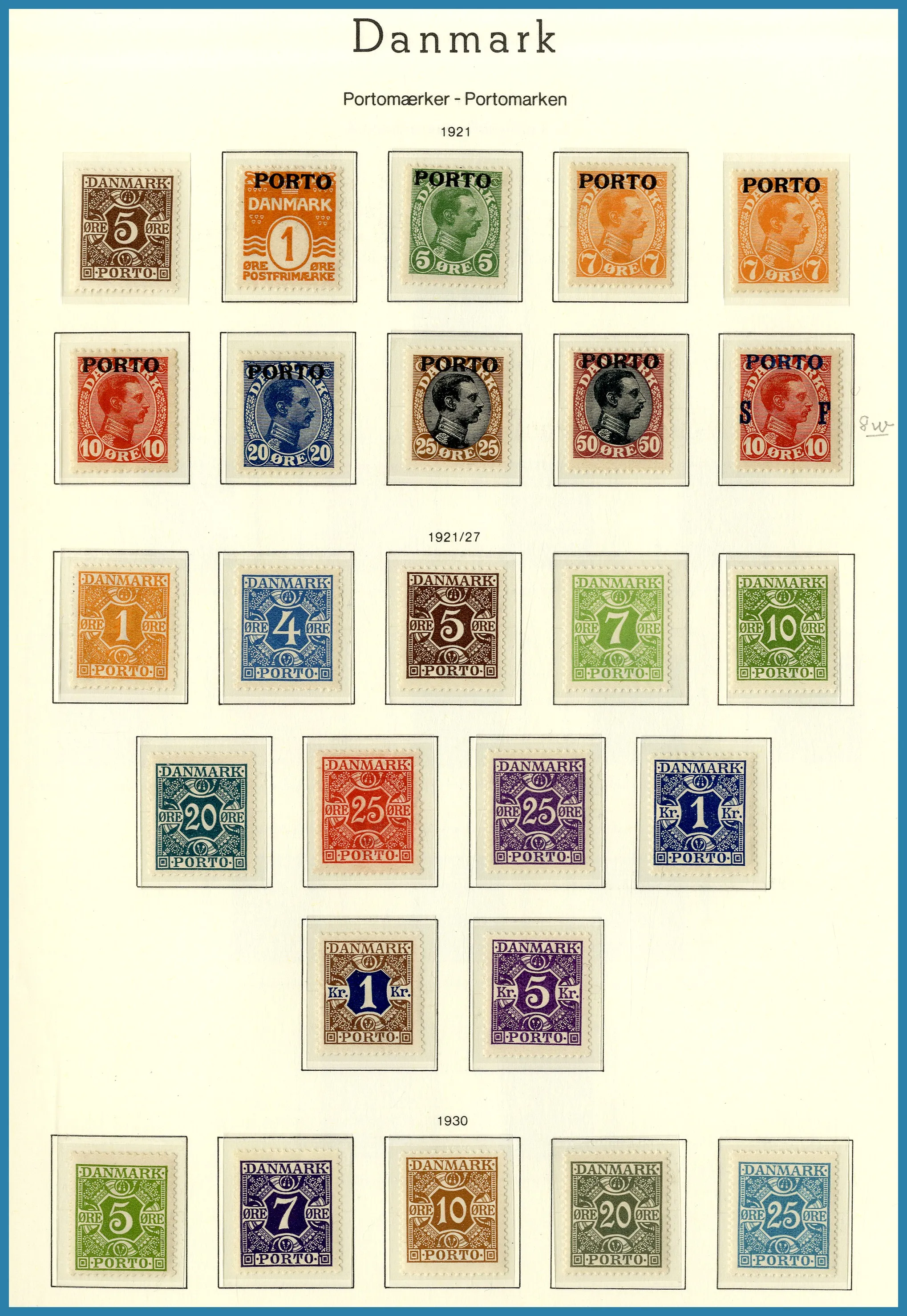Danmark 1854-2004 **/*/(*) i två gröna Leuchtturm-album med fickor. Bladen har även plats för färgnyanser etc., varför det på enstaka sidor kan se lite glest ut trots att samlingen efter huvudnummer är i det närmaste komplett. Mängder med bättre märken, varav ett flertal har intyg. Även t.ex. tjänste-, lösen-, tidnings- och postfärjemärken samt Slesvig (dock saknas CIS-påtrycken).