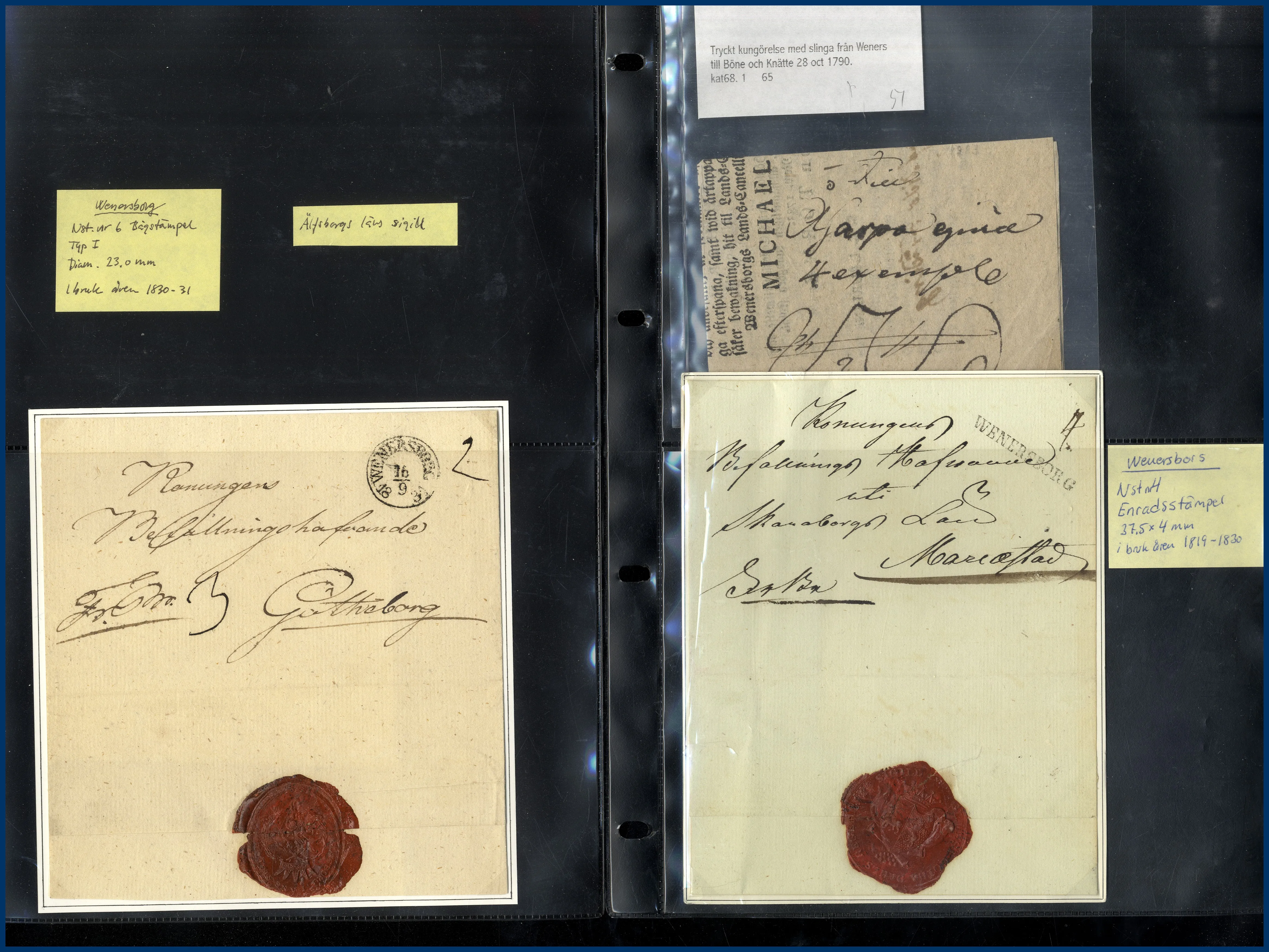1 kronopoststämpel, Meanderslinga på Kungörelse 1790, 3 st Rakstämplar, 7 st Bågstämplar, 10 st Fyrkantsstämplar, 4 st Cirkelstämplar inkl. BLÅ samt Wennersborg medd dubbel NN. De flesta typer finns med.