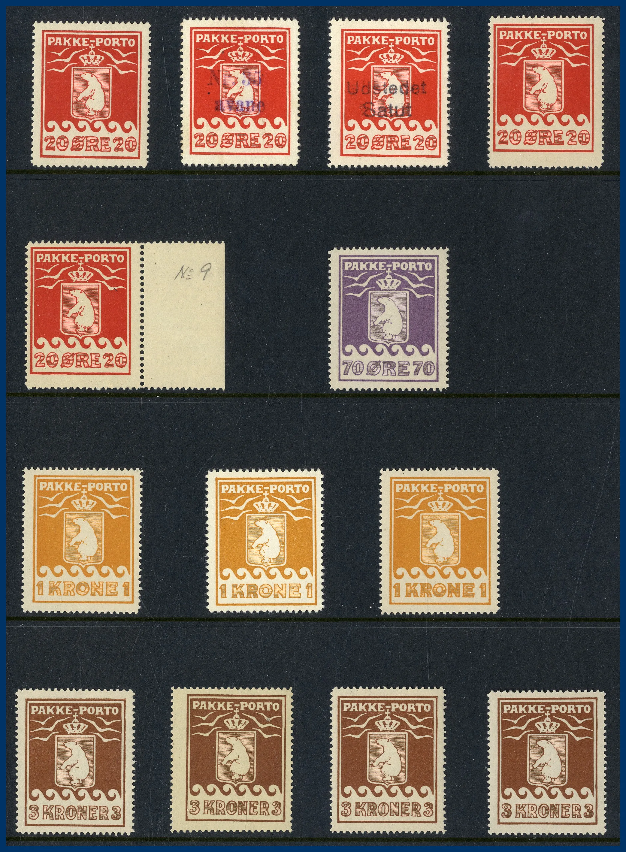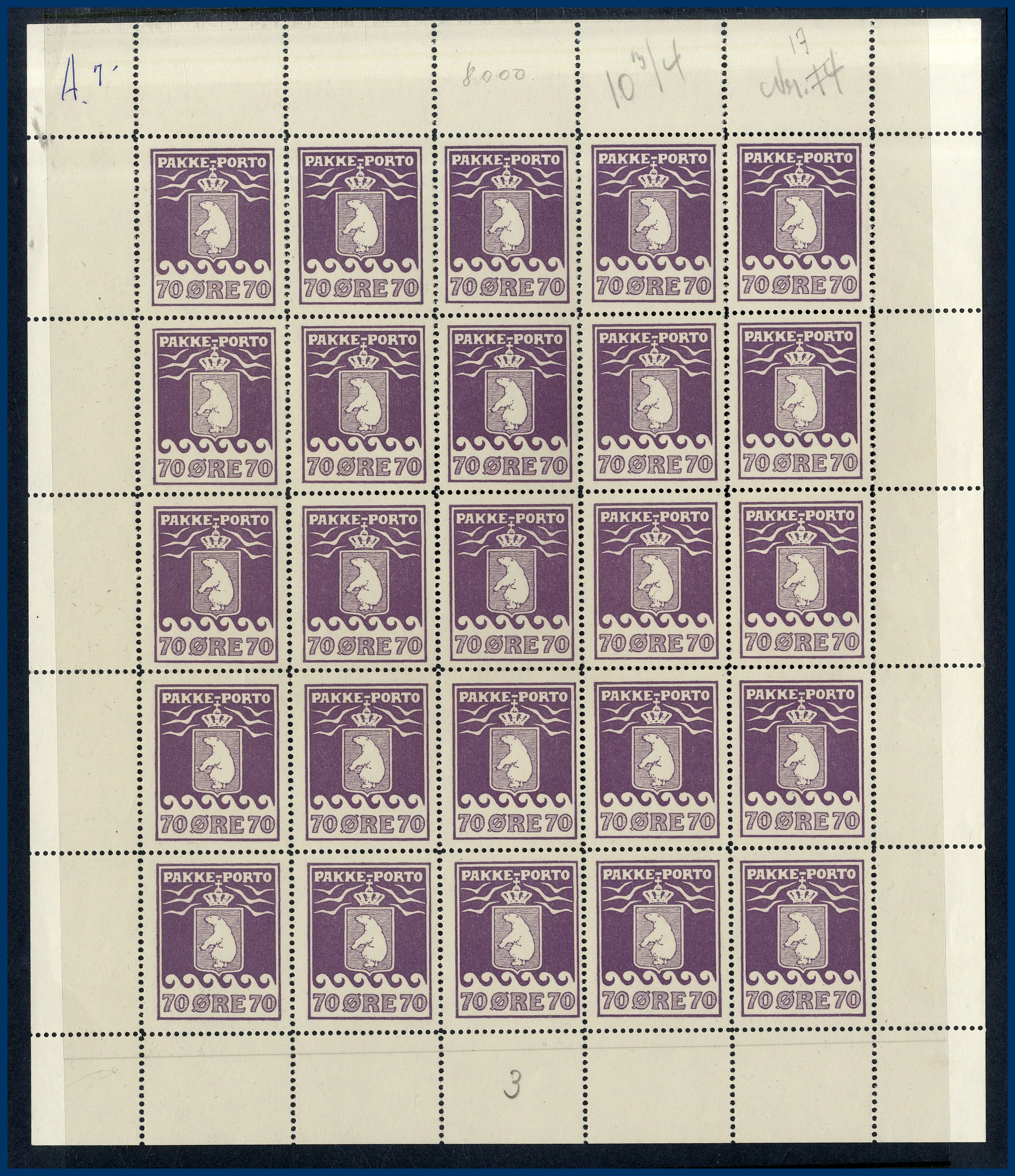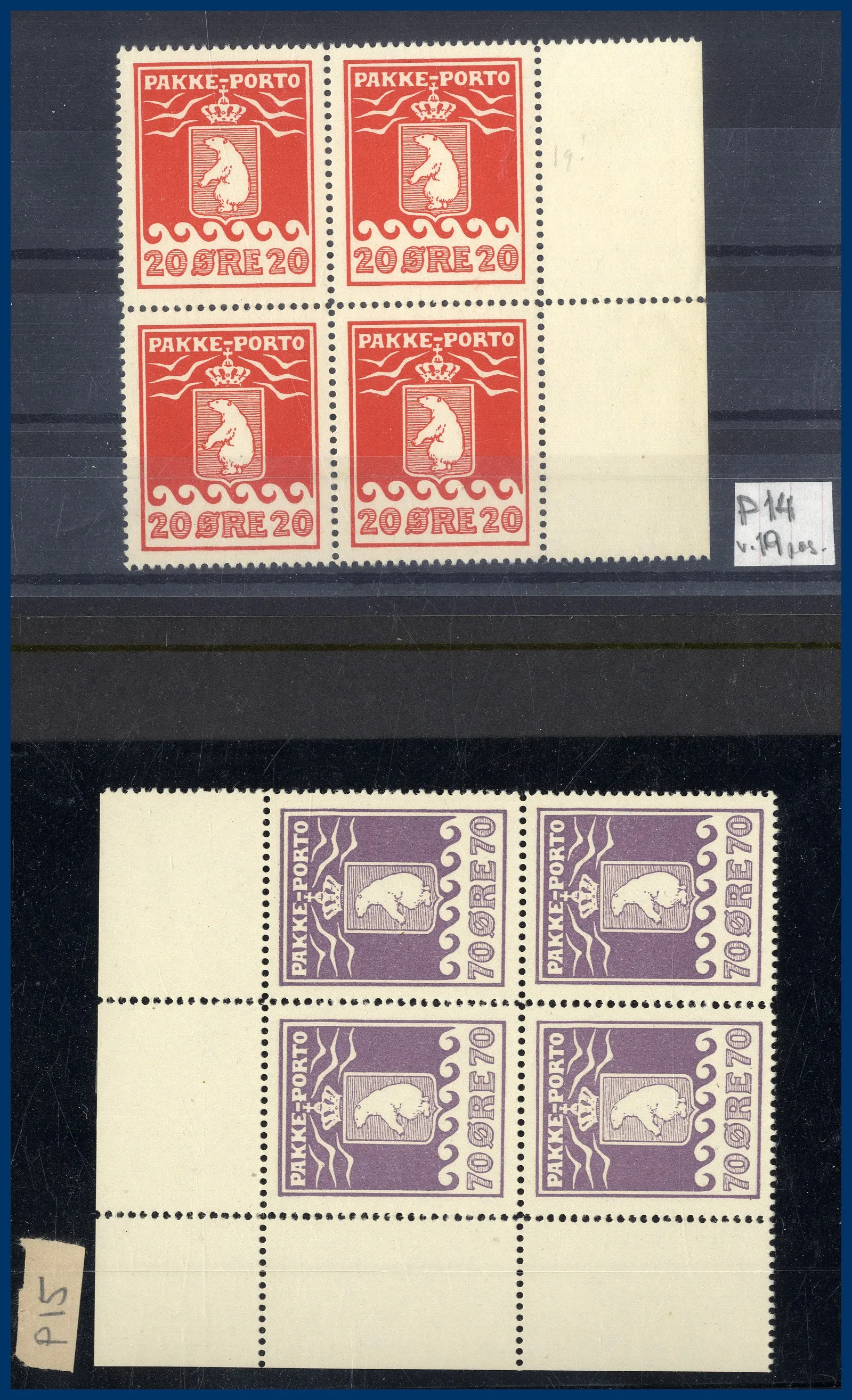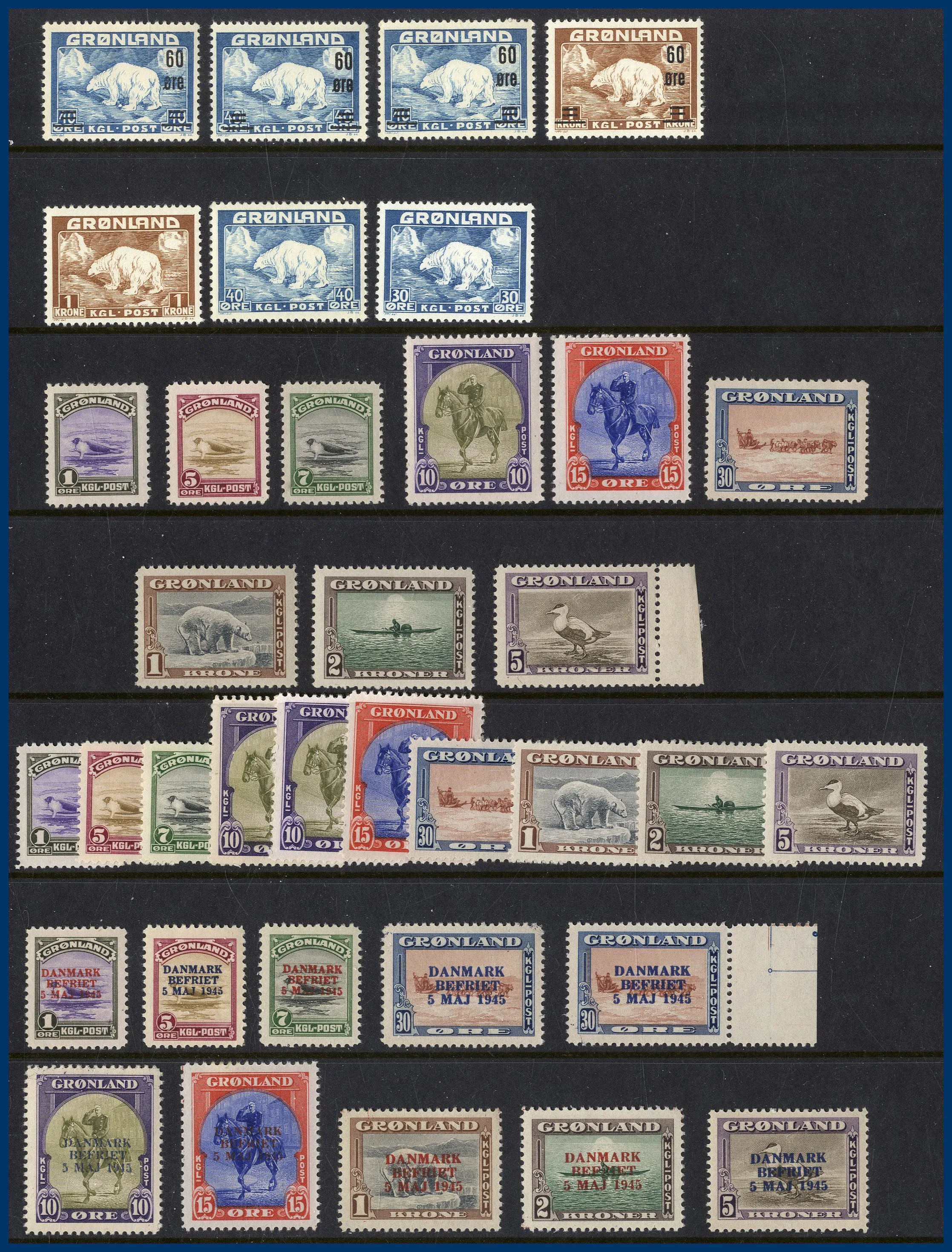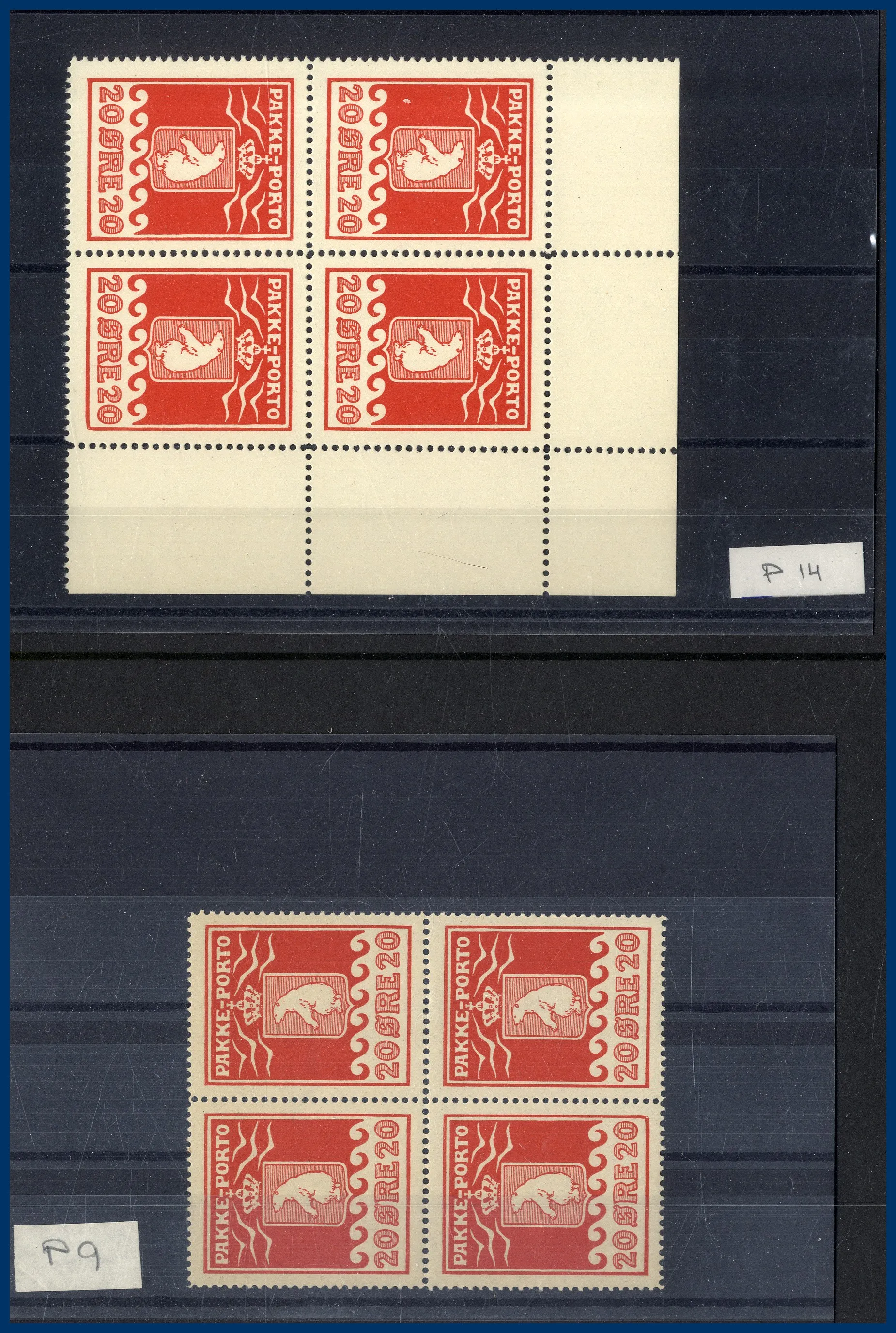 antingen i fräsch ** kvalitet eller stämplat (5 st) utvalda märken flera med varianter totalt 41 st singlar från P3 och framåt, 40 st i parkombinationer upp till 9-block och avslutningsvis ett P17 helark. Sista bladet i samlingen även några Isbjörnar, Olika motiv samt 10 st Danmark Befriet. Katalogvärde över 120.000 kr med plusvärde för varianter, utmärkta centreringar och fräsch kvalitet. En samling vi rekommenderar.