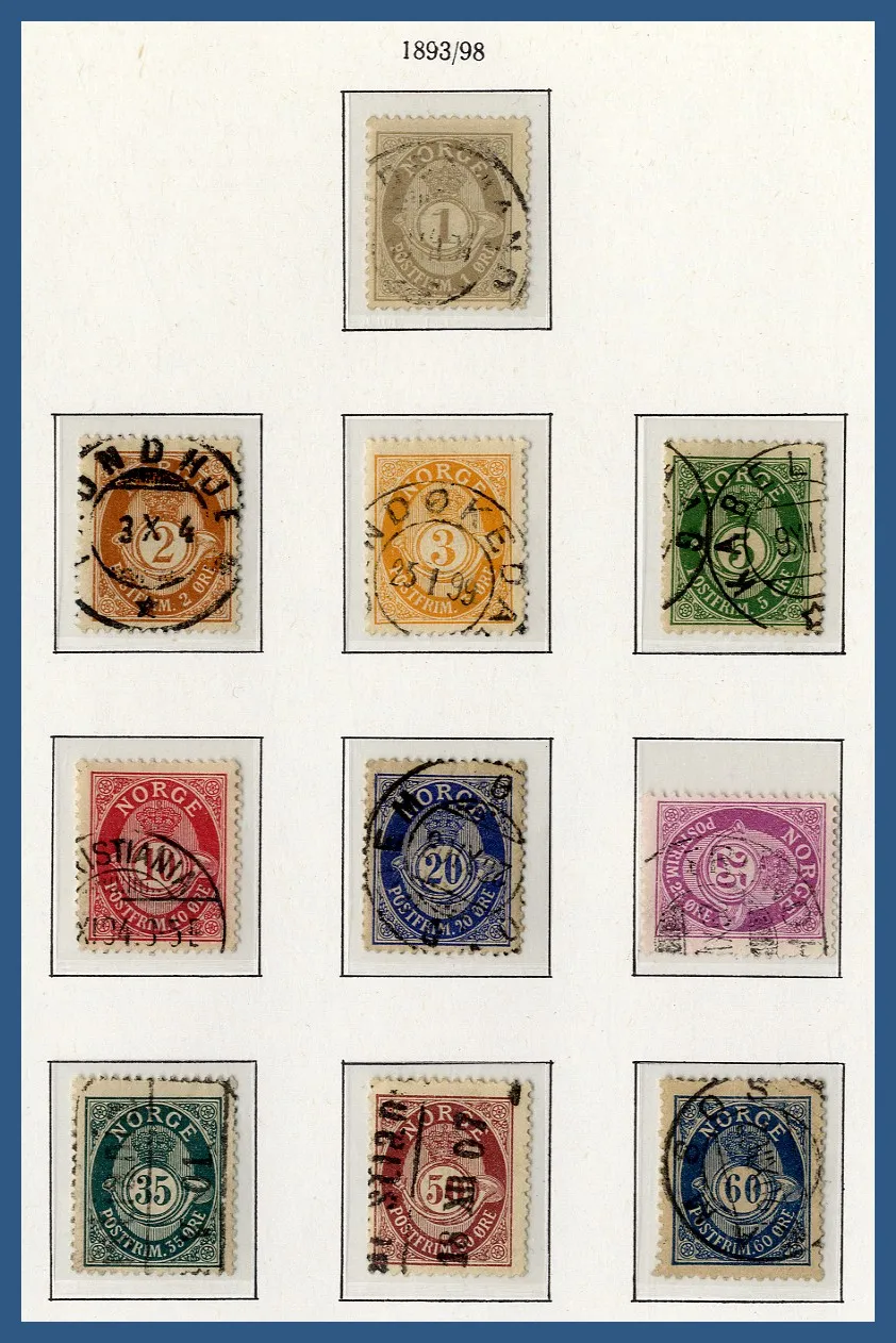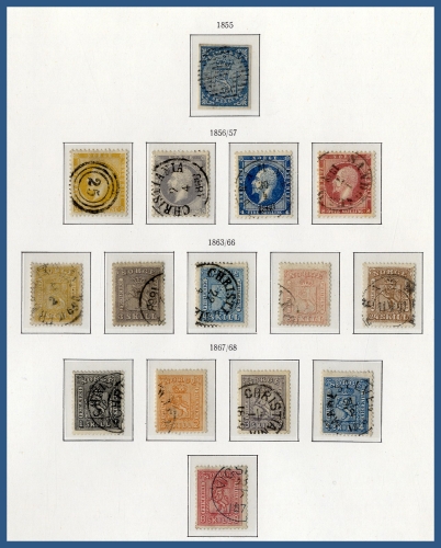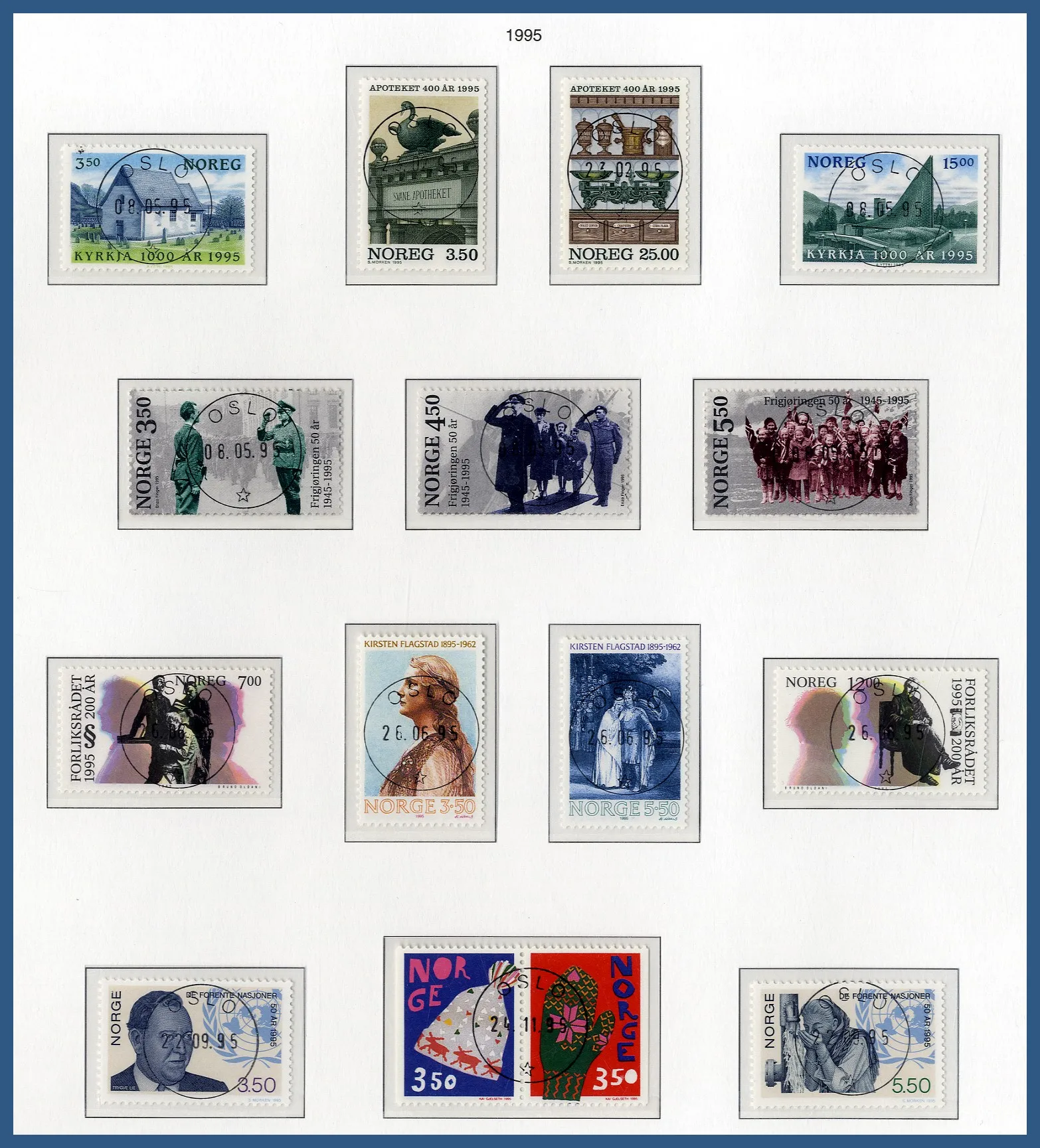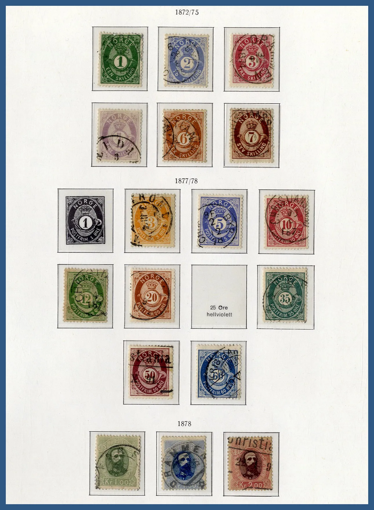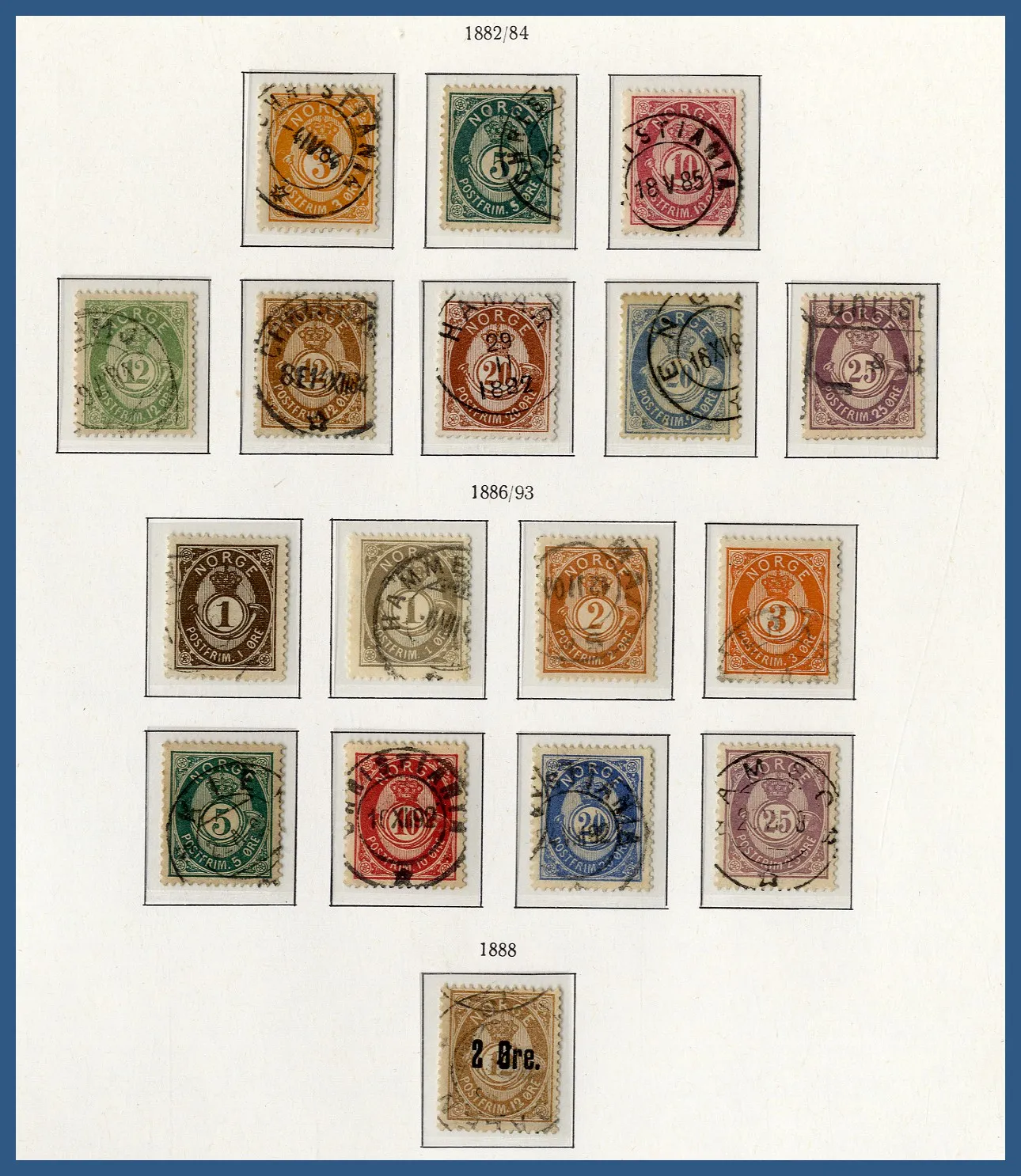 1855-1999 på KABE-blad i 3 album. Börjar starkt med samtliga skillingvalörer (F 1-21), därefter fortsatt relativt välbesatt men ofta med luckor för de lite bättre märkena. Från 1983 och hela vägen fram till 1999 mycket välbesatt och nästan allt lyxstämplat OSLO.