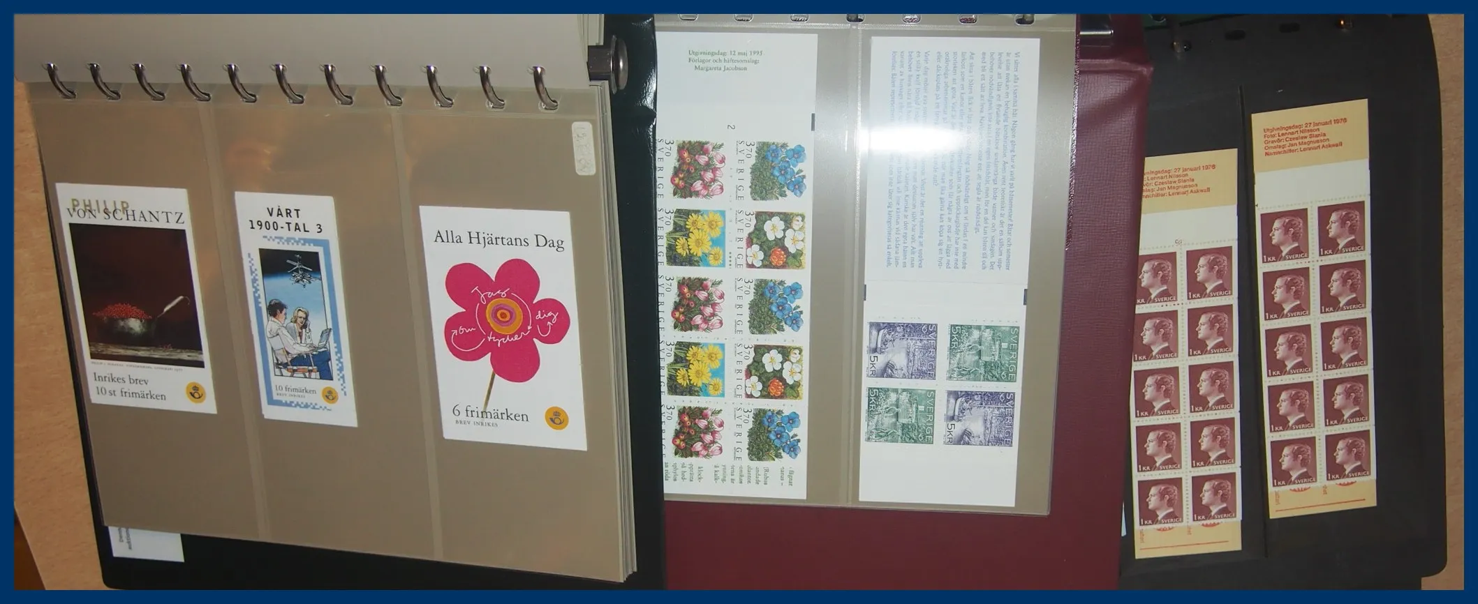 markeringar. Nominal drygt 12.300 kr. Ett flertal häften Sverige Brev, däremot inga rabatthäften (säljs separat). I ett av albumen finns även lite frankeringsetiketter.