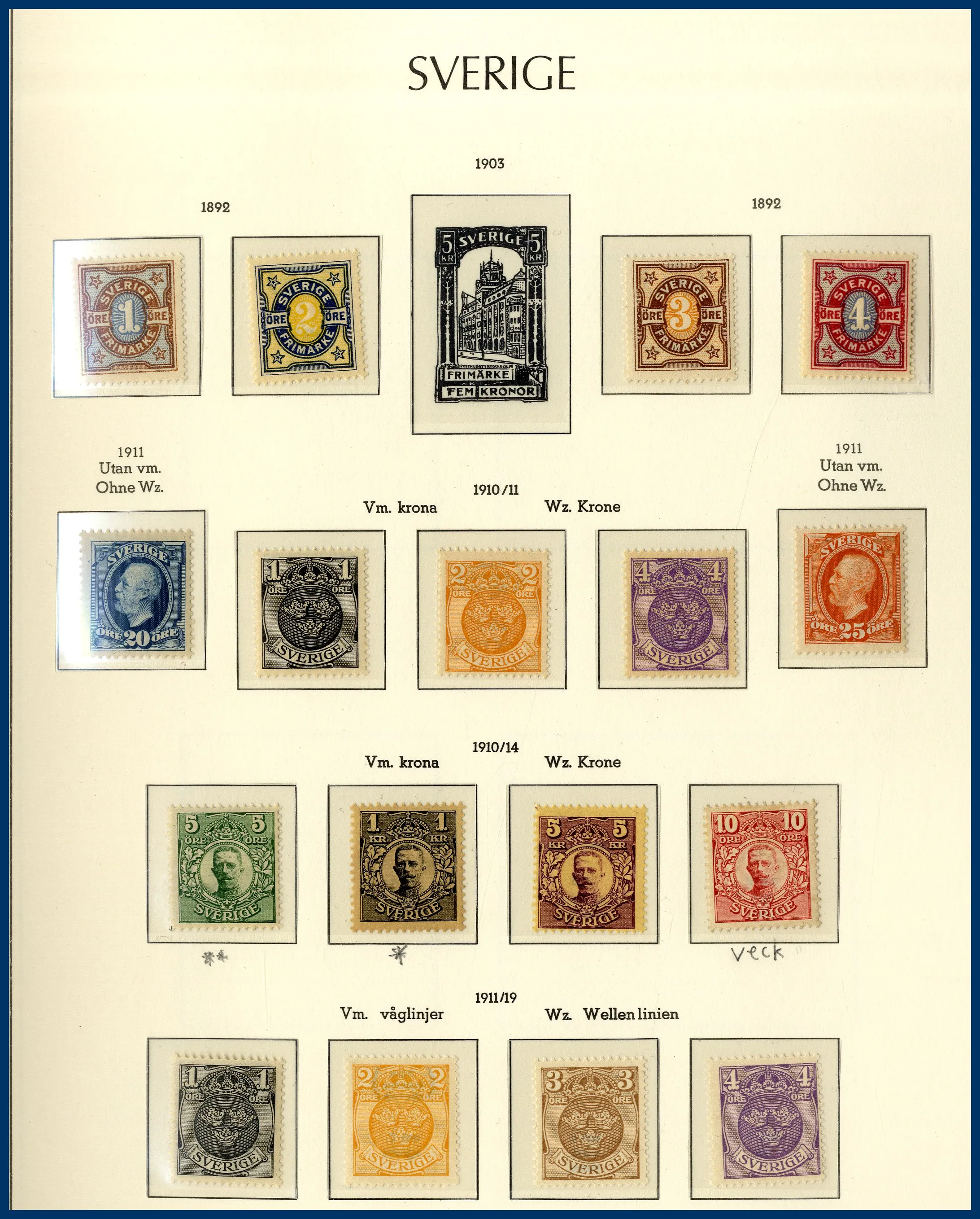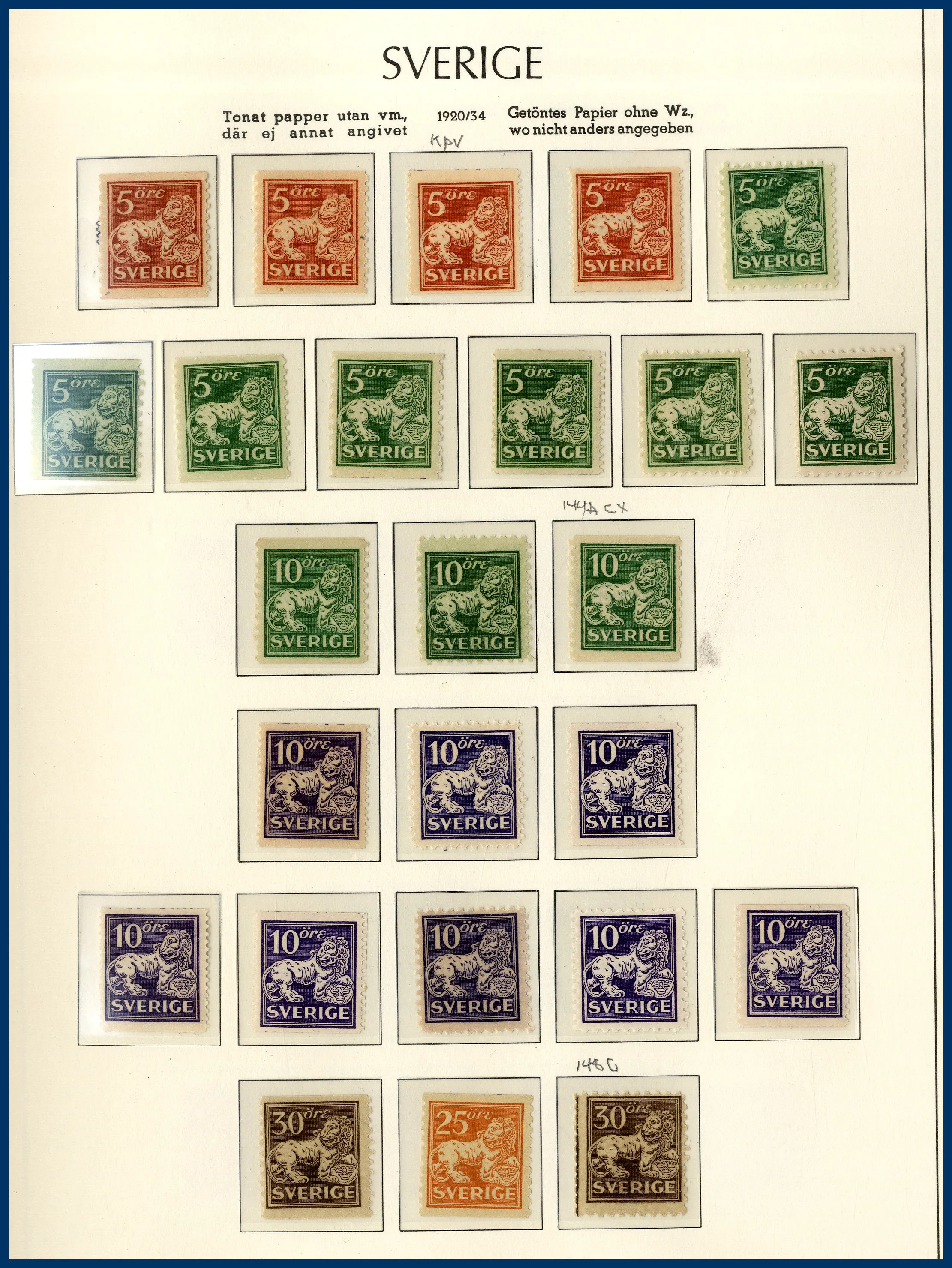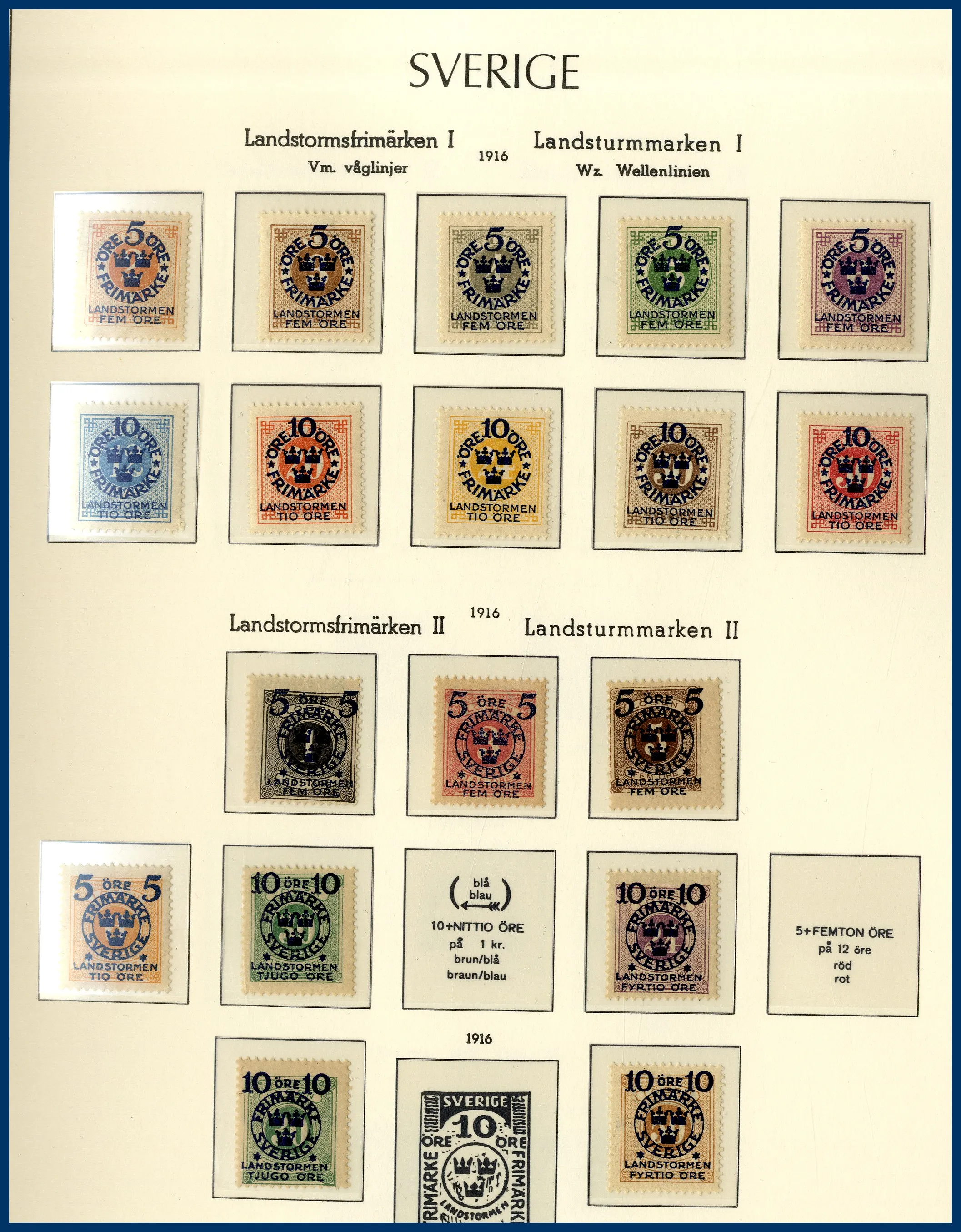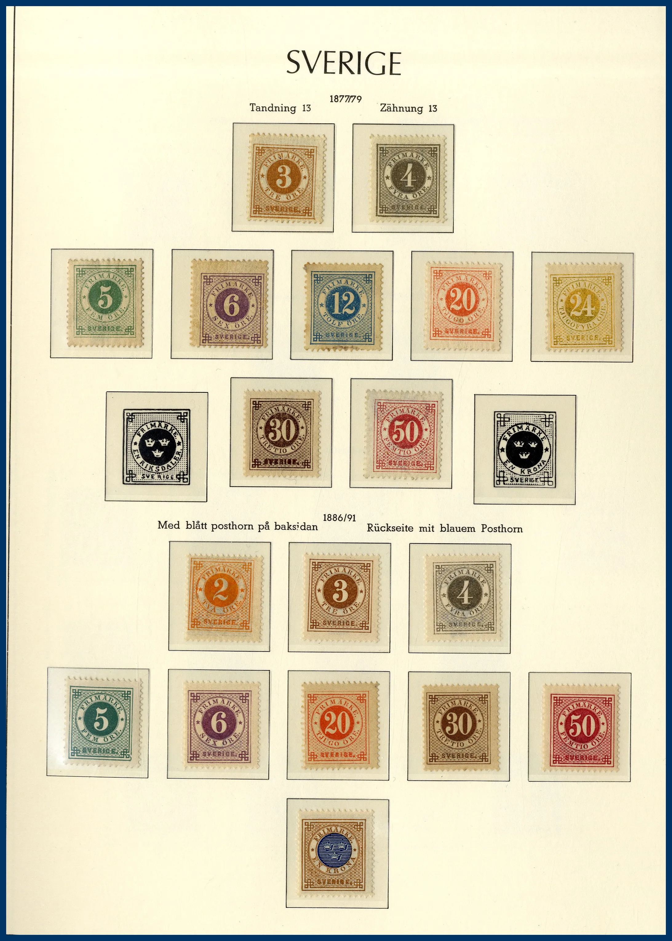 Ringtyp t.13 utom 1 kr och Riksdalern, Ringtyp ph komplett, Oscar med några luckor, Medaljong utom Värnamo, Landstorm välbesatt men de svåraste märkena på Landstorm II saknas, välbesatt bandmärkesavsnitt, Kongressen komplett, Föreningen upp till 1 kr, gröna slottet två ex med tonat papper, många BC-/CB-par (saknas bara 4 st), fyrsidig svanar, några stora tjänste, små tjänste komplett liksom Lösen t.13.