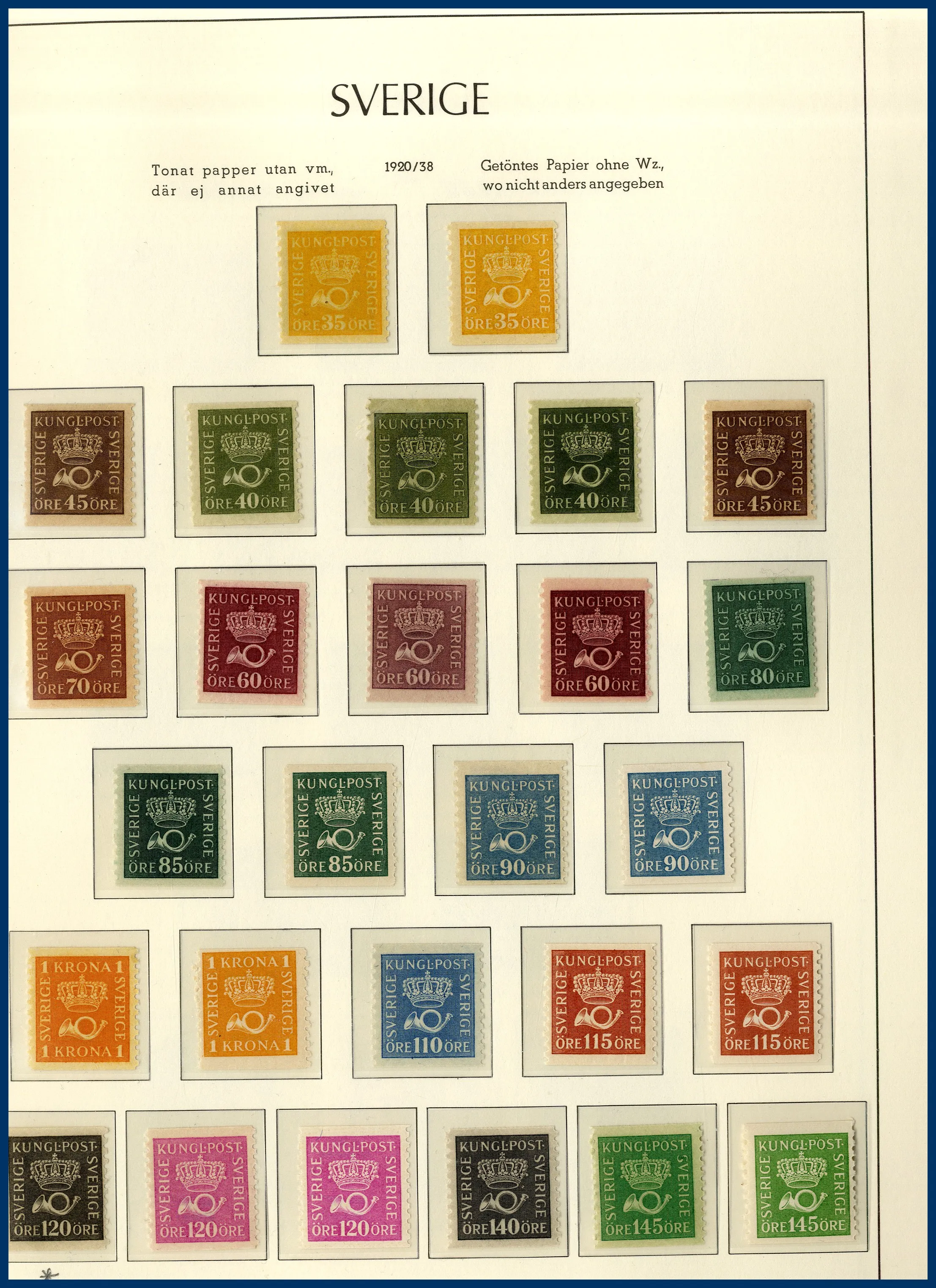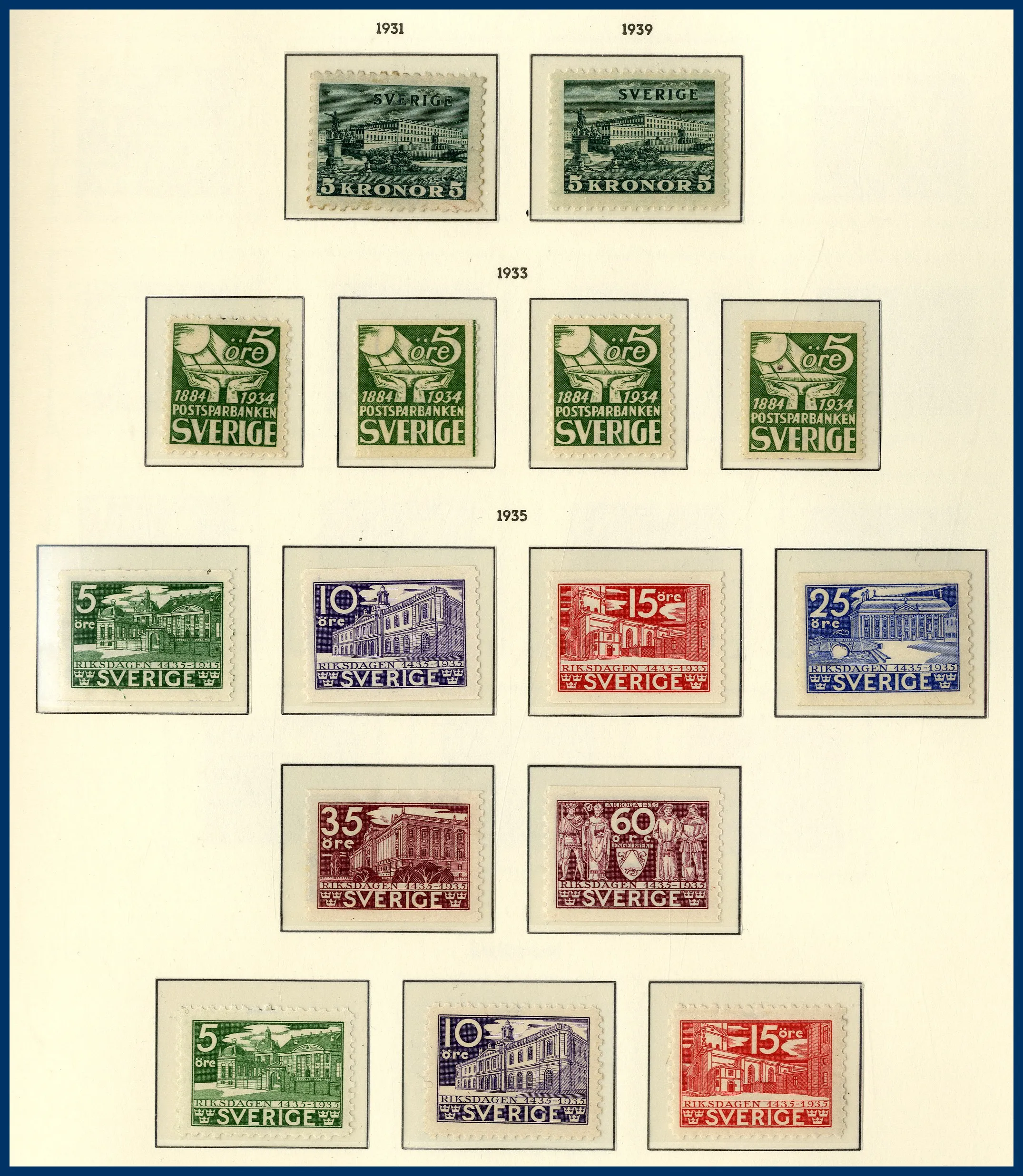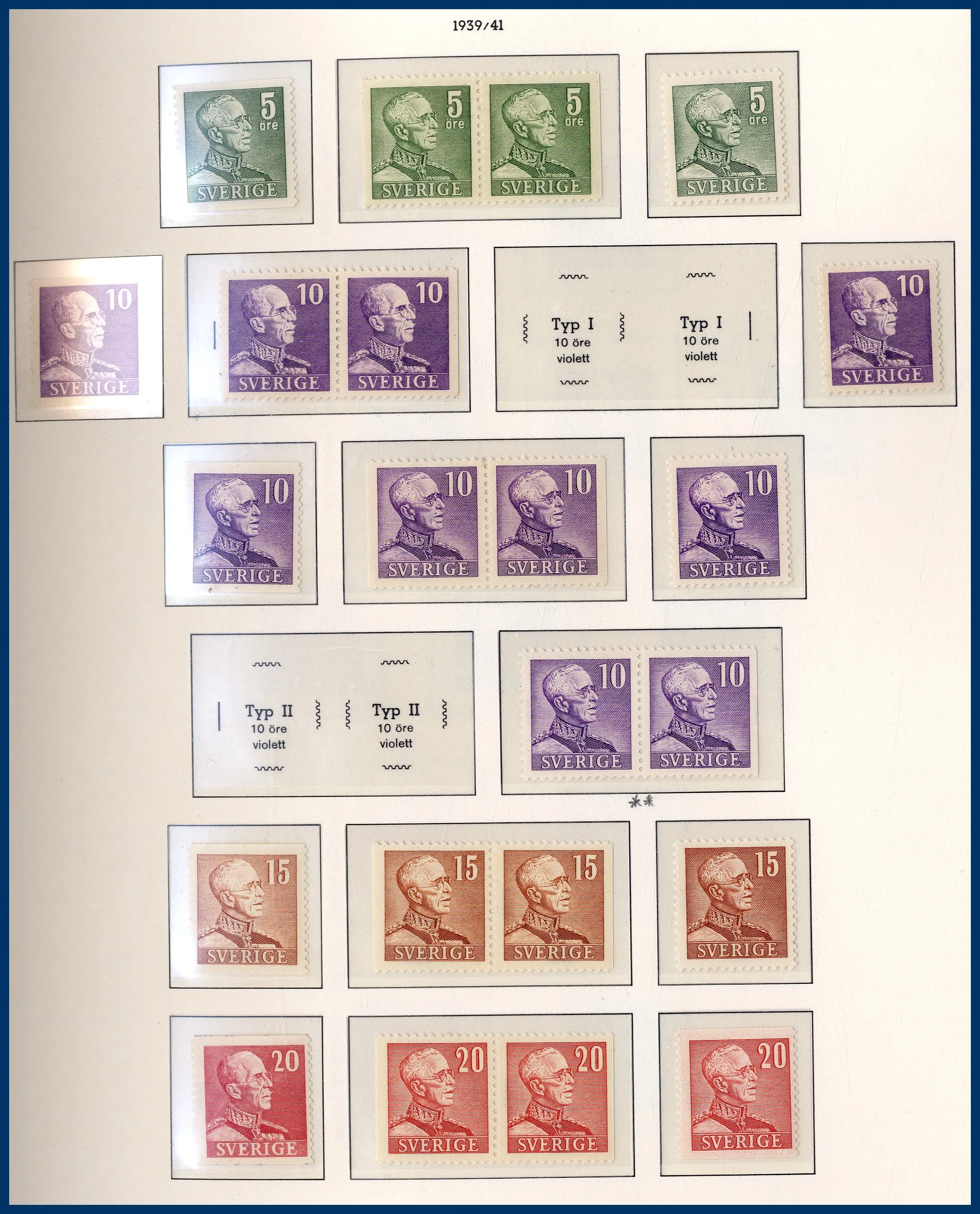 Ringtyp t.13 utom 1 kr och Riksdalern, Ringtyp ph komplett, Oscar med några luckor, Medaljong utom Värnamo, Landstorm välbesatt men de svåraste märkena på Landstorm II saknas, välbesatt bandmärkesavsnitt, Kongressen komplett, Föreningen upp till 1 kr, gröna slottet två ex med tonat papper, många BC-/CB-par (saknas bara 4 st), fyrsidig svanar, några stora tjänste, små tjänste komplett liksom Lösen t.13.