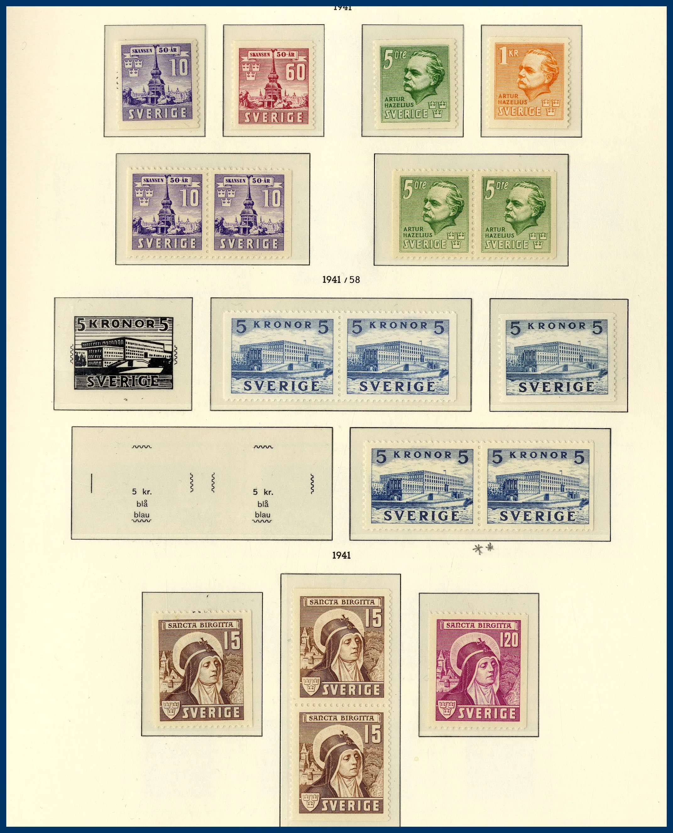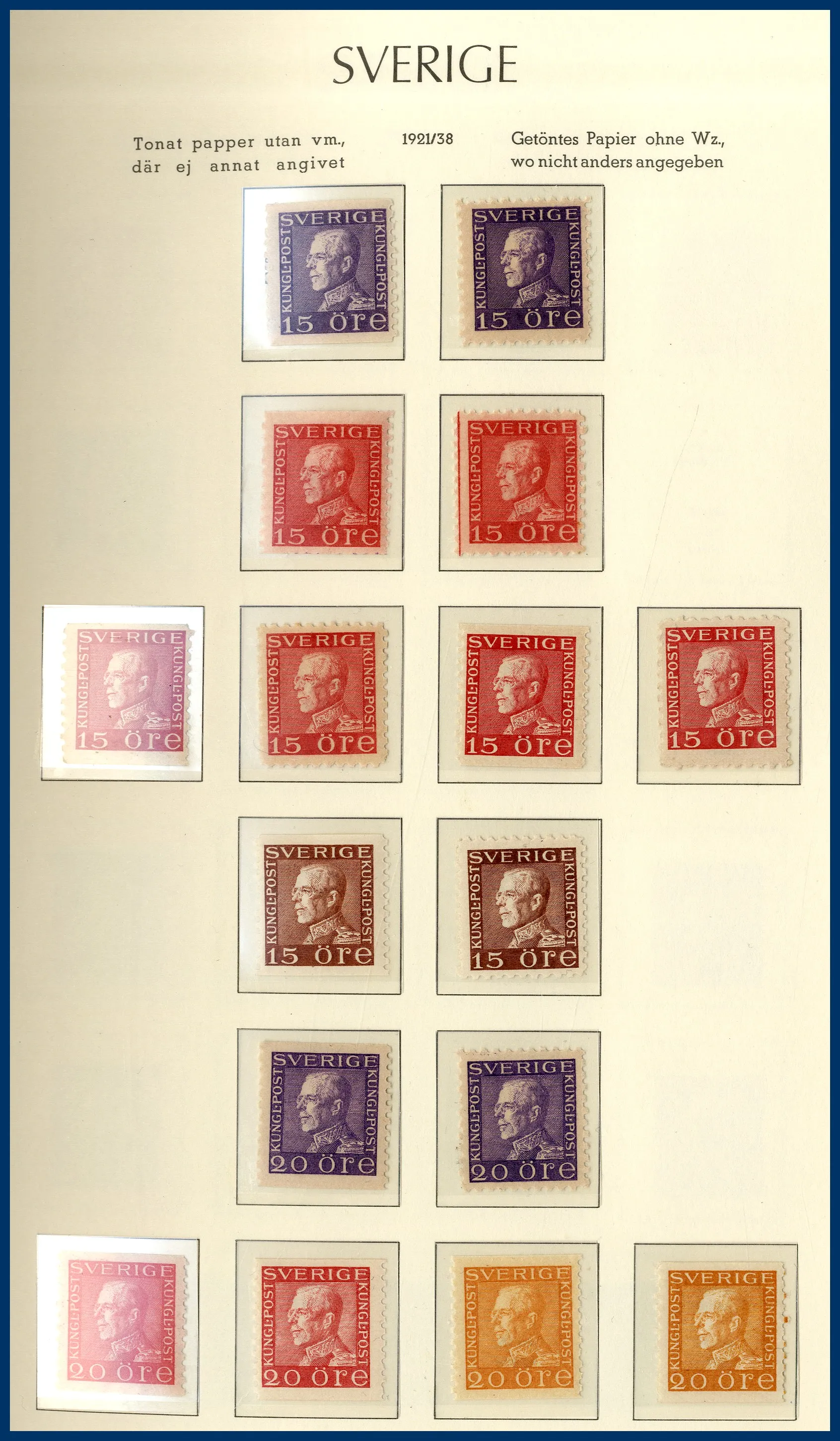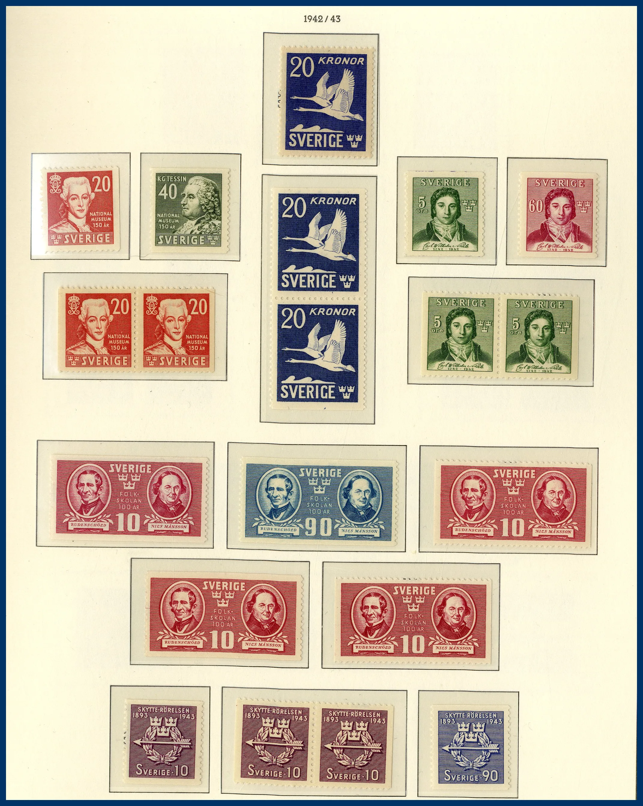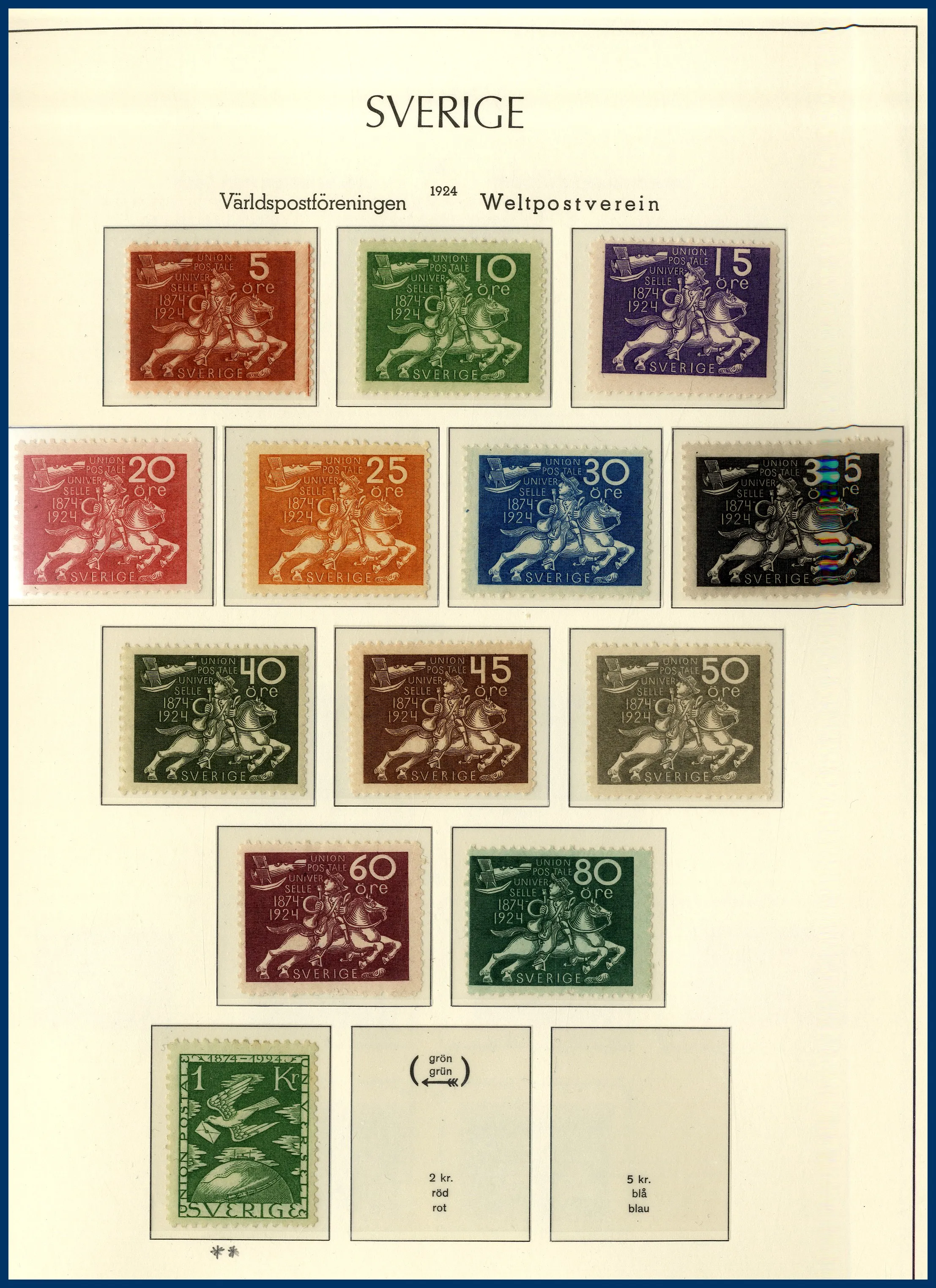 Ringtyp t.13 utom 1 kr och Riksdalern, Ringtyp ph komplett, Oscar med några luckor, Medaljong utom Värnamo, Landstorm välbesatt men de svåraste märkena på Landstorm II saknas, välbesatt bandmärkesavsnitt, Kongressen komplett, Föreningen upp till 1 kr, gröna slottet två ex med tonat papper, många BC-/CB-par (saknas bara 4 st), fyrsidig svanar, några stora tjänste, små tjänste komplett liksom Lösen t.13.