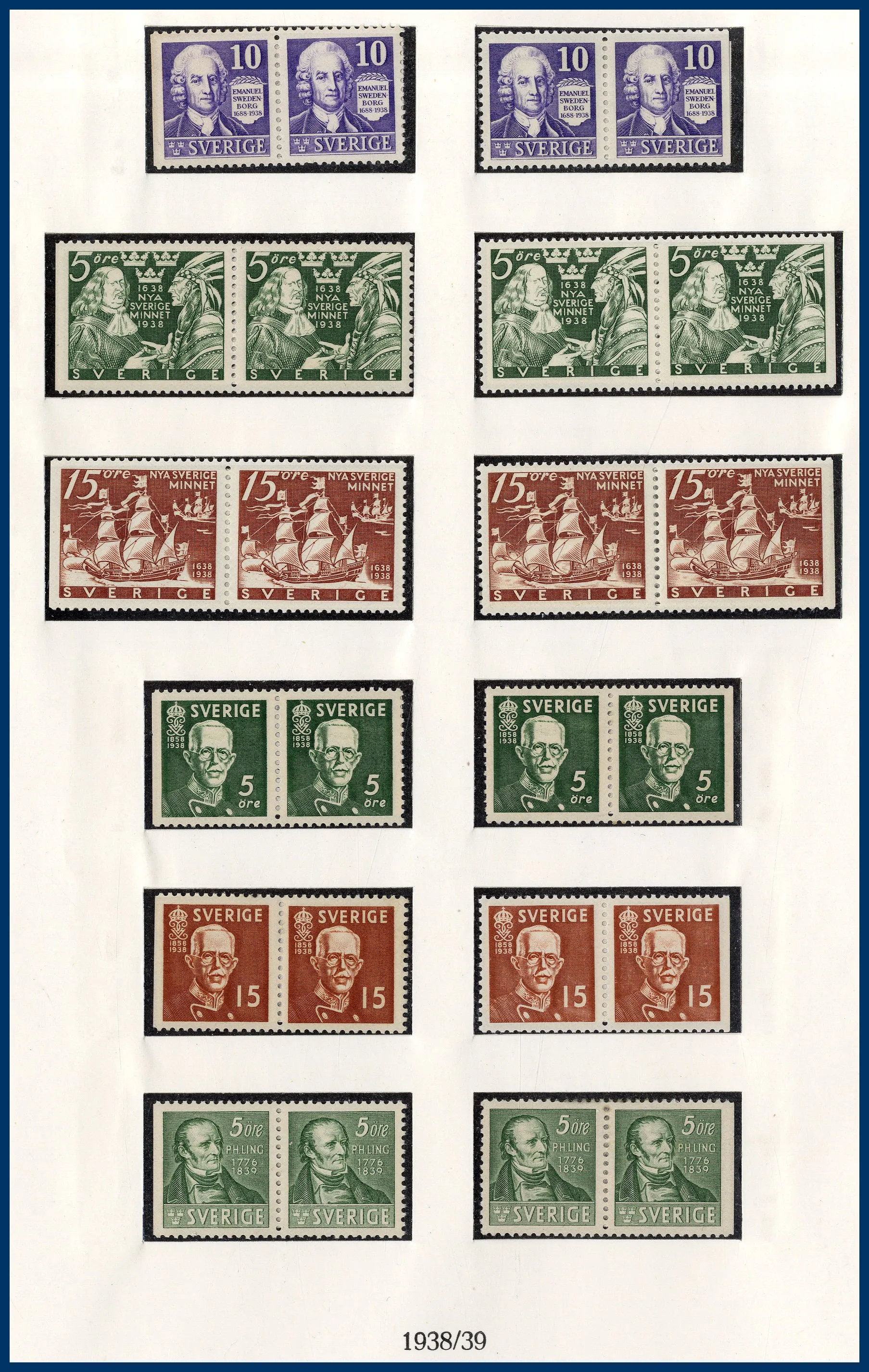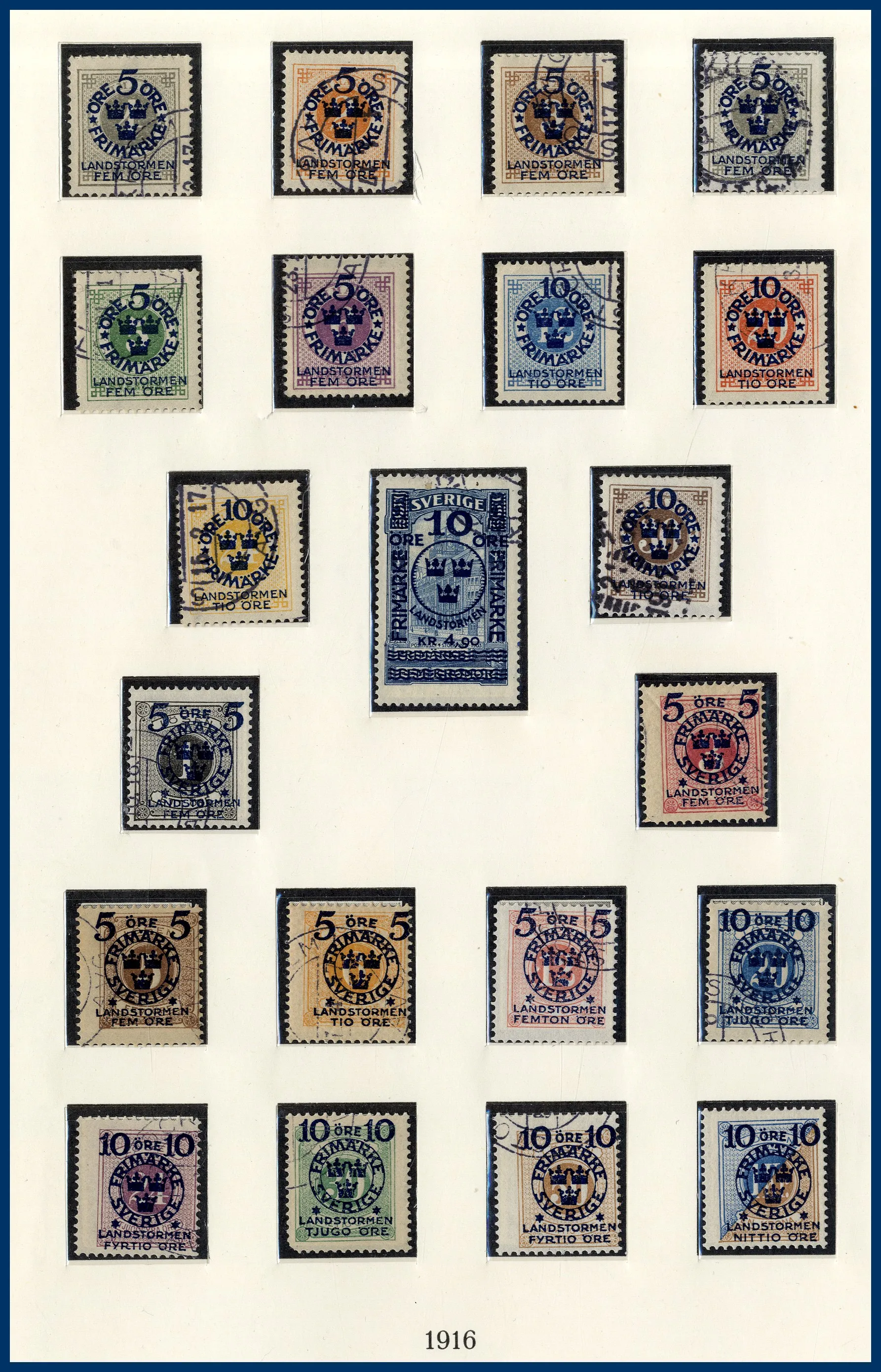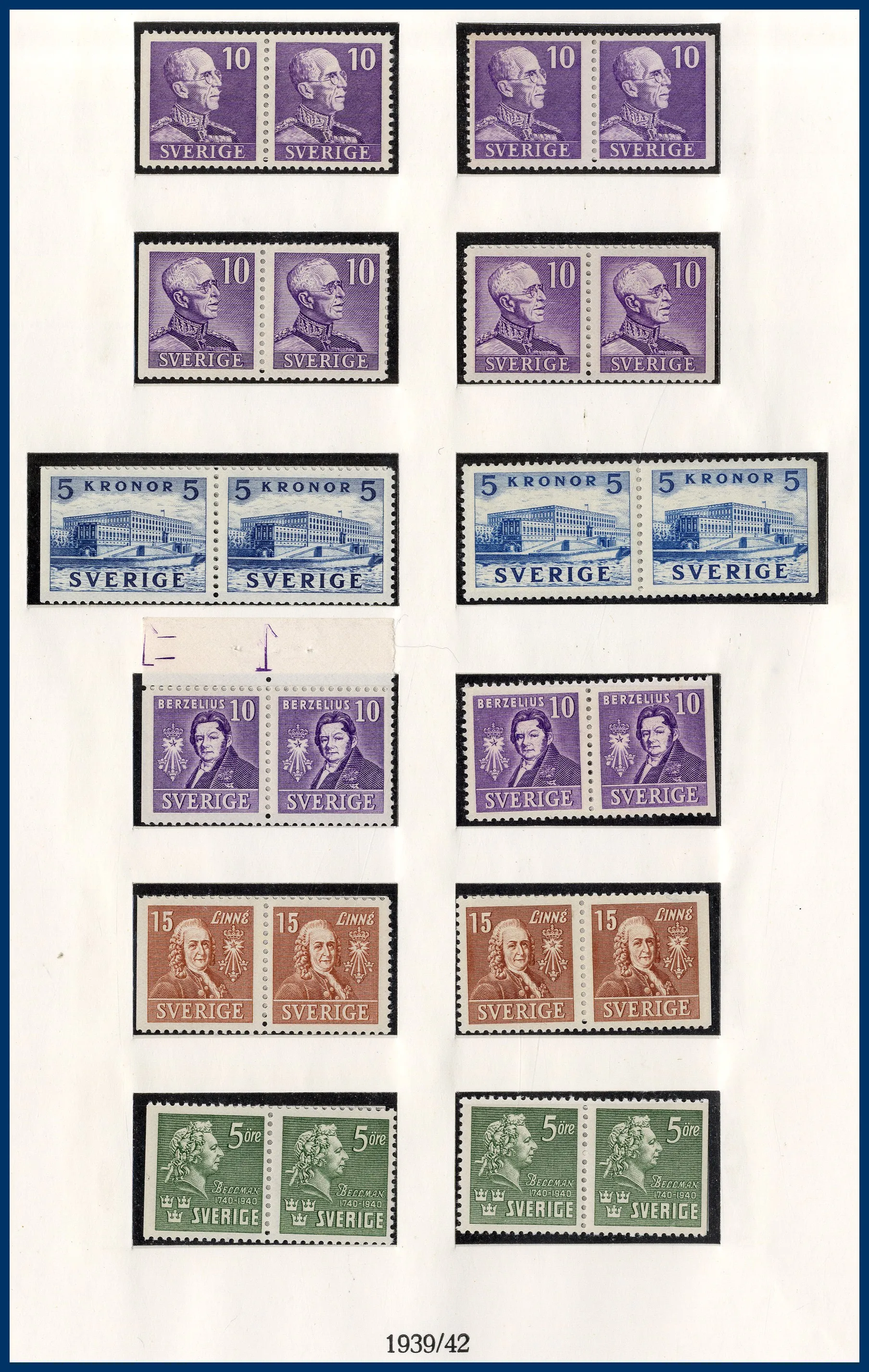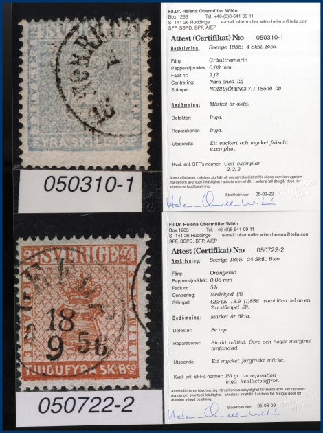 luckor i ett Lindner hingeless-album. Fram t.o.m. 1936 stämplat, från 1938 **/*. 3-skilling, två st 4-Skillingar, varav en med intyg (F.2j2) HOW (2005) "Ett vackert och mycket fräscht exemplar 2,2,2", en 6-skilling, en 8-skilling, 24 Sk. med intyg HOW (2005) "Starkt tvättat. Övre och höger marginal omtandad. Ett mycket färgfriskt märke.", Vapentyp överkomplett, båda lokalmärkena, Liggande lejon överkomplett liksom samtliga Ringtypsserier, Tjänste och Lösen, Landstorm I-III komplett (men F.124 ** i stället för stämplad), välbesatt bandmärkesavsnitt med mängder av olika vm (dock inte de allra svåraste), Kongress/Förening komplett. Från 1938 (**/*) i det närmaste komplett med samtliga BC-/CB-par och även 3-sidiga märken monterade separat. Även t.ex. alla 9-block från Stockholmia 1955. Sammantaget en mycket stark samling i mestadels bra kvalitet. Även en hel del vackra stämplar.