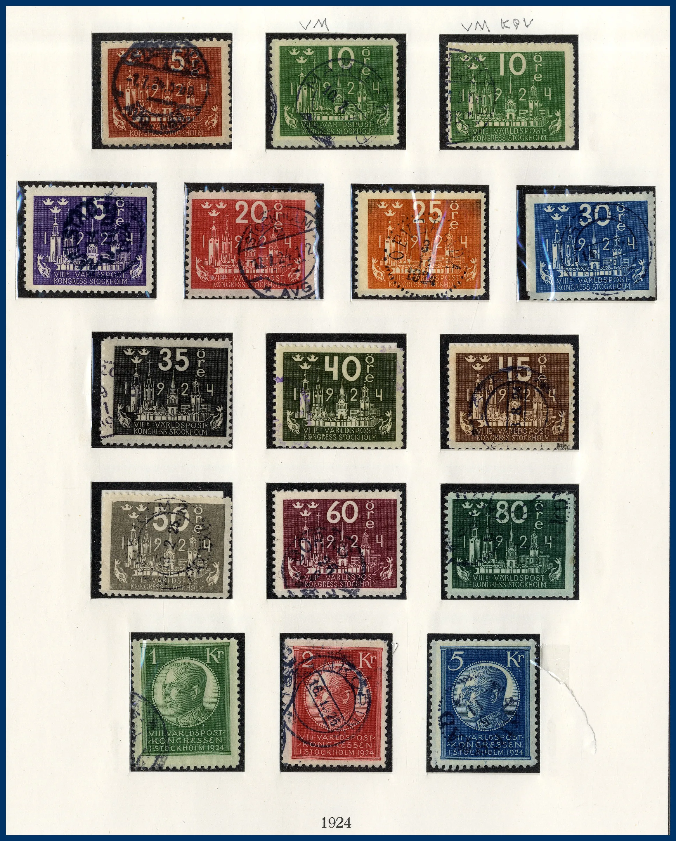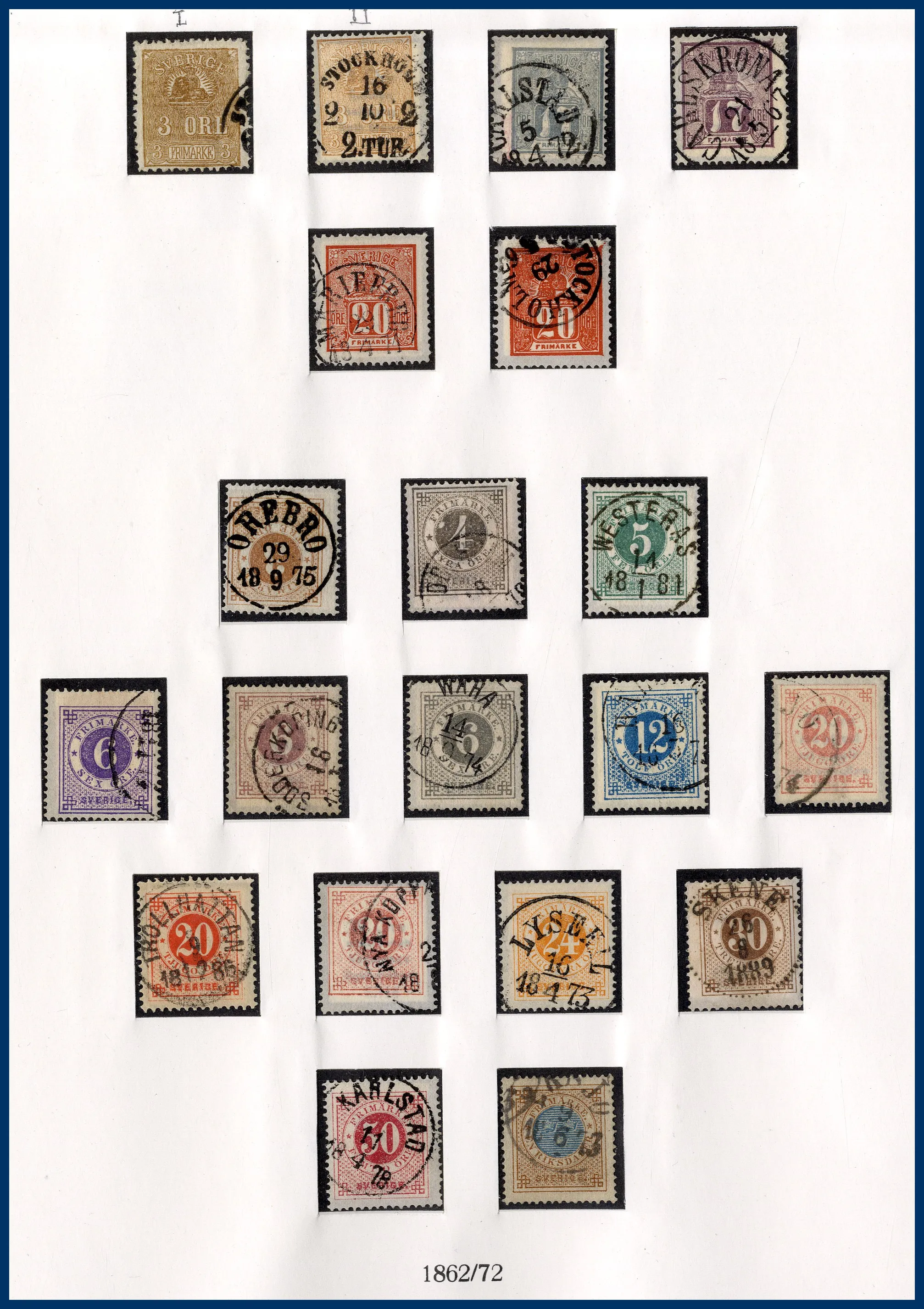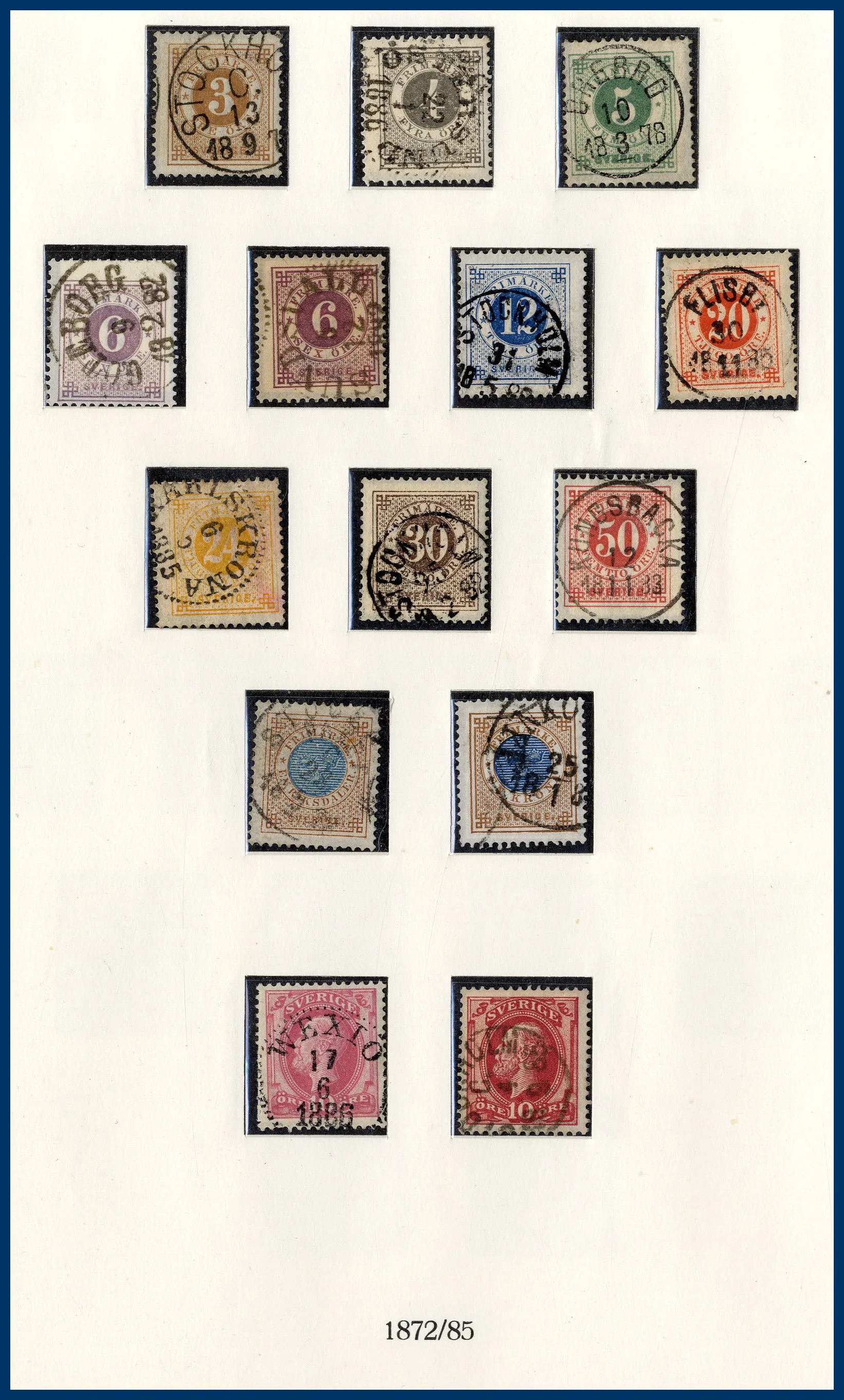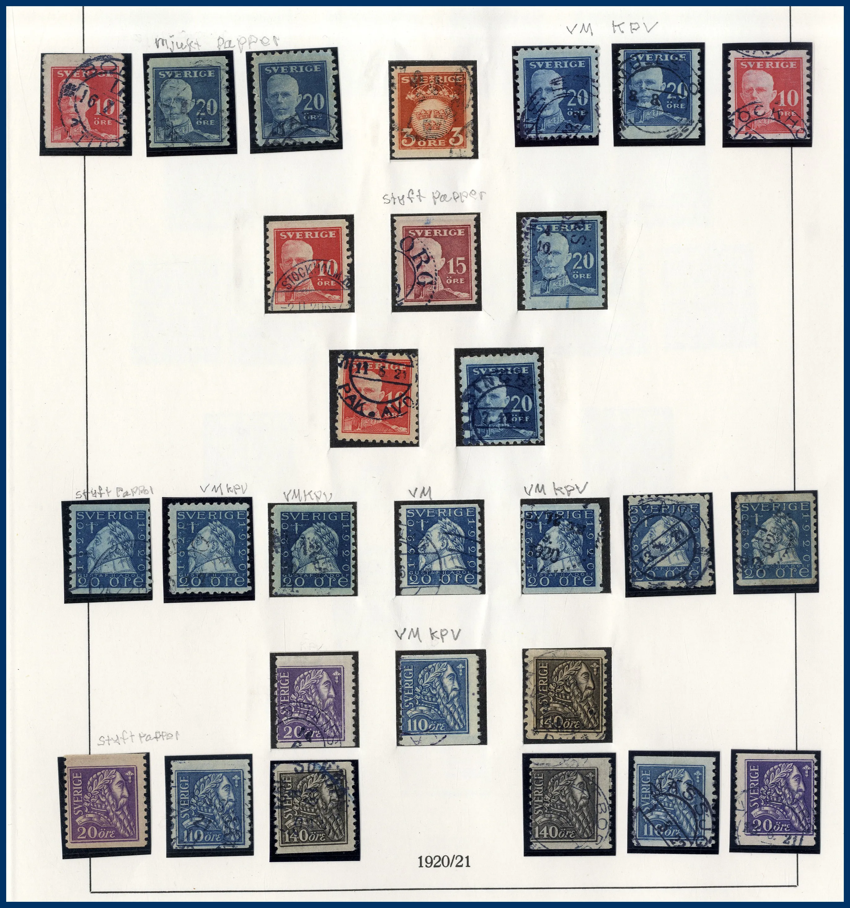 luckor i ett Lindner hingeless-album. Fram t.o.m. 1936 stämplat, från 1938 **/*. 3-skilling, två st 4-Skillingar, varav en med intyg (F.2j2) HOW (2005) "Ett vackert och mycket fräscht exemplar 2,2,2", en 6-skilling, en 8-skilling, 24 Sk. med intyg HOW (2005) "Starkt tvättat. Övre och höger marginal omtandad. Ett mycket färgfriskt märke.", Vapentyp överkomplett, båda lokalmärkena, Liggande lejon överkomplett liksom samtliga Ringtypsserier, Tjänste och Lösen, Landstorm I-III komplett (men F.124 ** i stället för stämplad), välbesatt bandmärkesavsnitt med mängder av olika vm (dock inte de allra svåraste), Kongress/Förening komplett. Från 1938 (**/*) i det närmaste komplett med samtliga BC-/CB-par och även 3-sidiga märken monterade separat. Även t.ex. alla 9-block från Stockholmia 1955. Sammantaget en mycket stark samling i mestadels bra kvalitet. Även en hel del vackra stämplar.