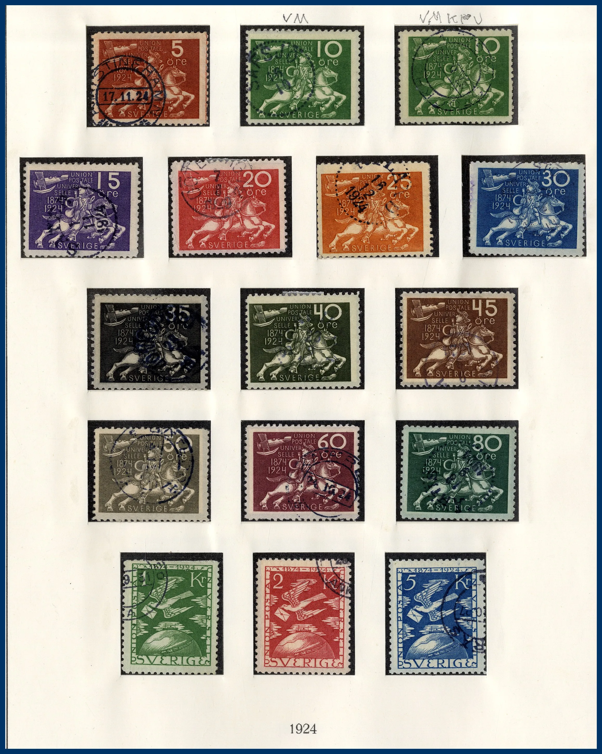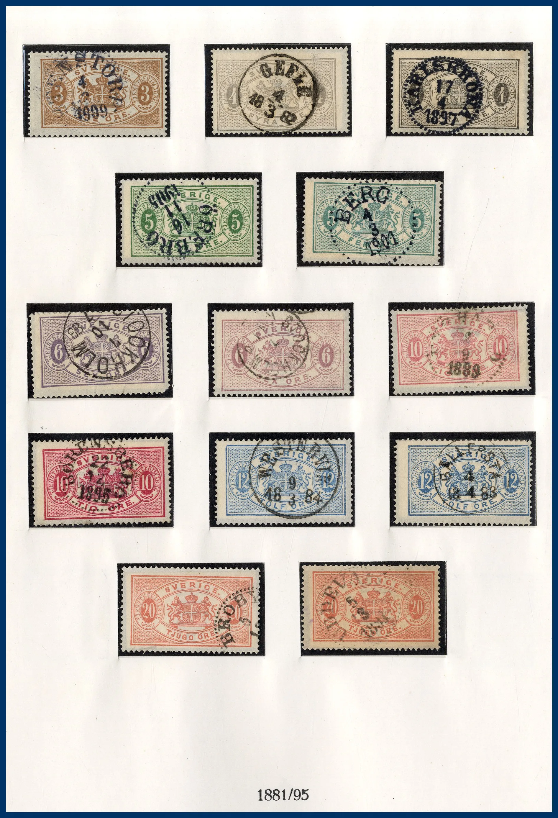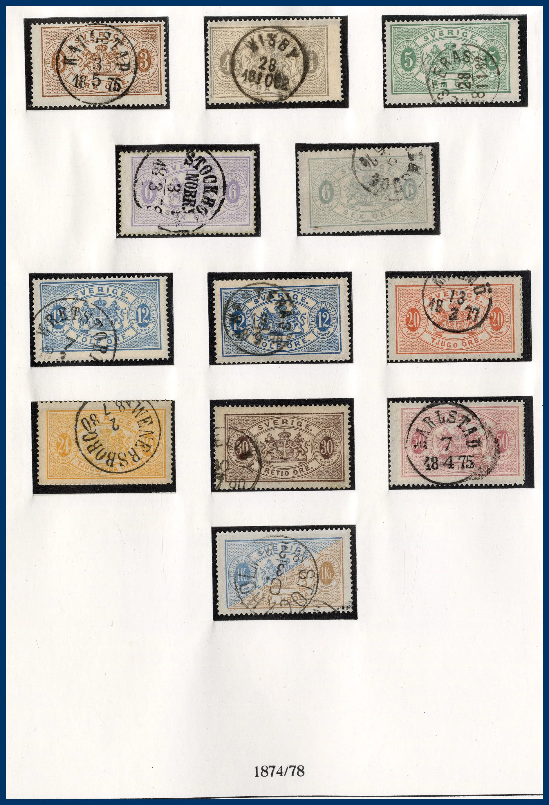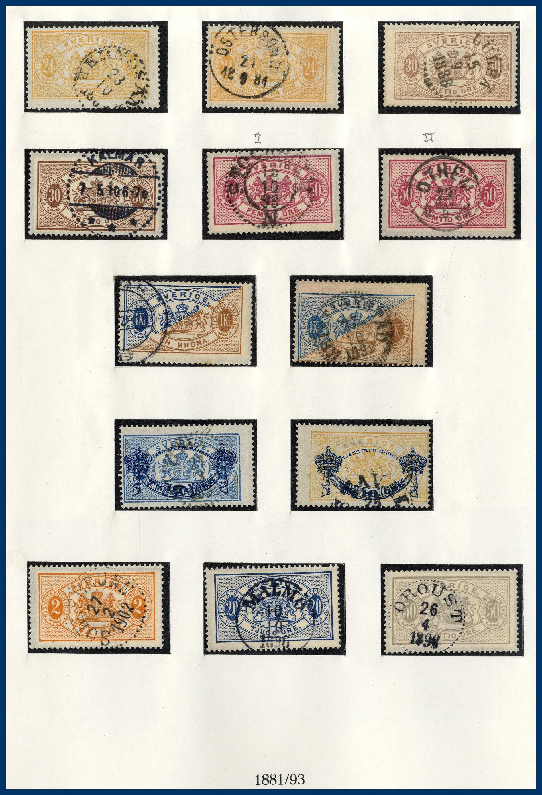luckor i ett Lindner hingeless-album. Fram t.o.m. 1936 stämplat, från 1938 **/*. 3-skilling, två st 4-Skillingar, varav en med intyg (F.2j2) HOW (2005) "Ett vackert och mycket fräscht exemplar 2,2,2", en 6-skilling, en 8-skilling, 24 Sk. med intyg HOW (2005) "Starkt tvättat. Övre och höger marginal omtandad. Ett mycket färgfriskt märke.", Vapentyp överkomplett, båda lokalmärkena, Liggande lejon överkomplett liksom samtliga Ringtypsserier, Tjänste och Lösen, Landstorm I-III komplett (men F.124 ** i stället för stämplad), välbesatt bandmärkesavsnitt med mängder av olika vm (dock inte de allra svåraste), Kongress/Förening komplett. Från 1938 (**/*) i det närmaste komplett med samtliga BC-/CB-par och även 3-sidiga märken monterade separat. Även t.ex. alla 9-block från Stockholmia 1955. Sammantaget en mycket stark samling i mestadels bra kvalitet. Även en hel del vackra stämplar.