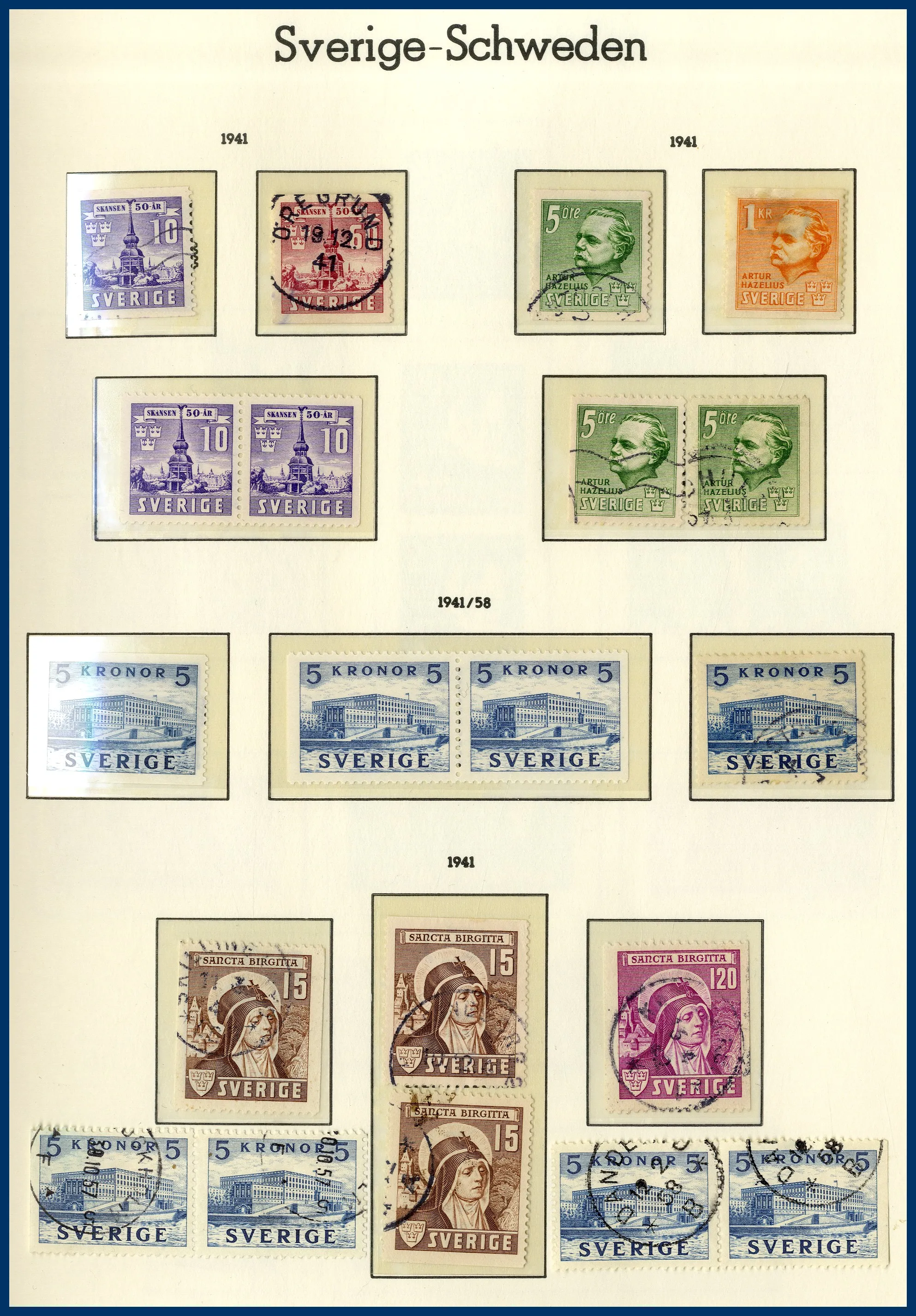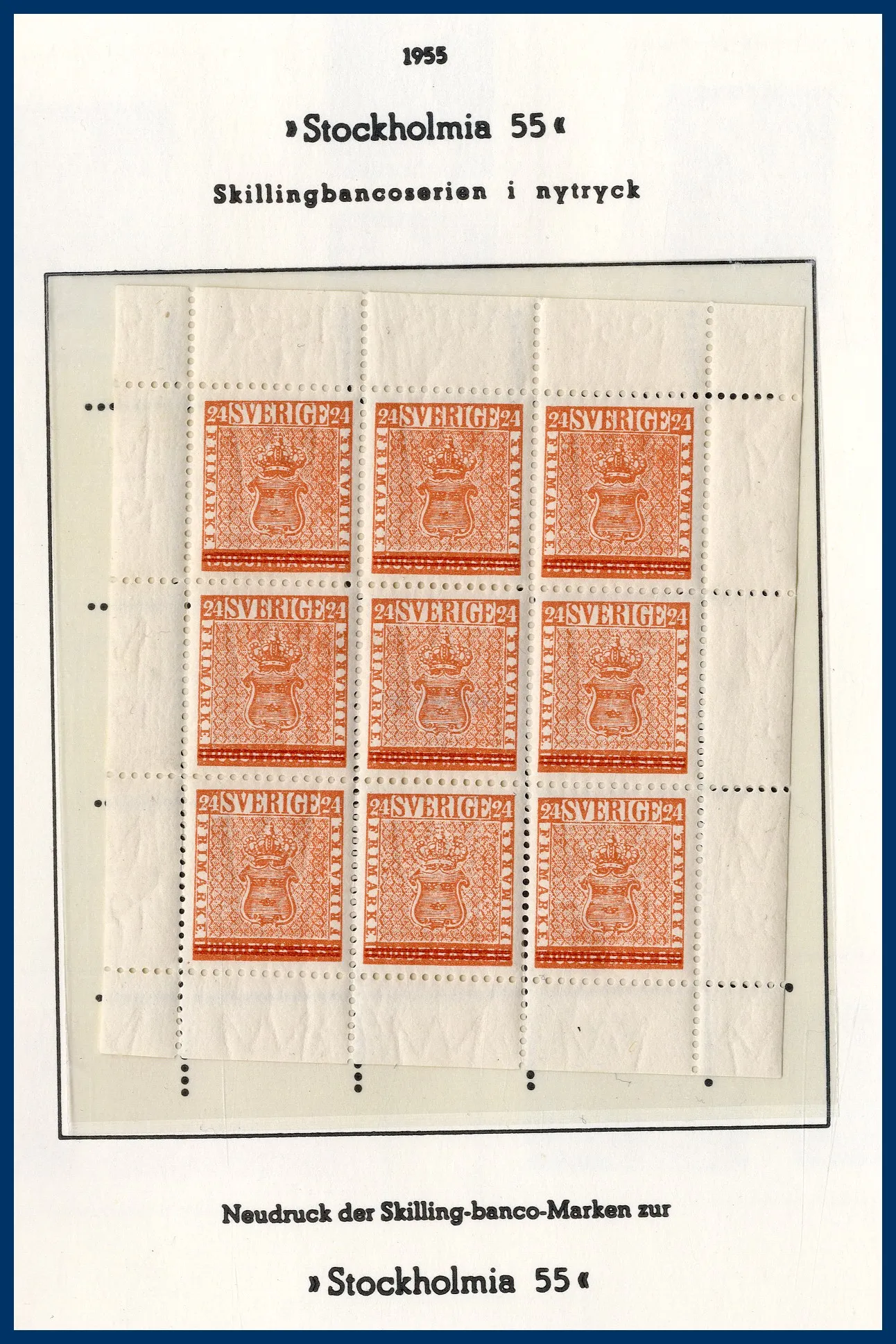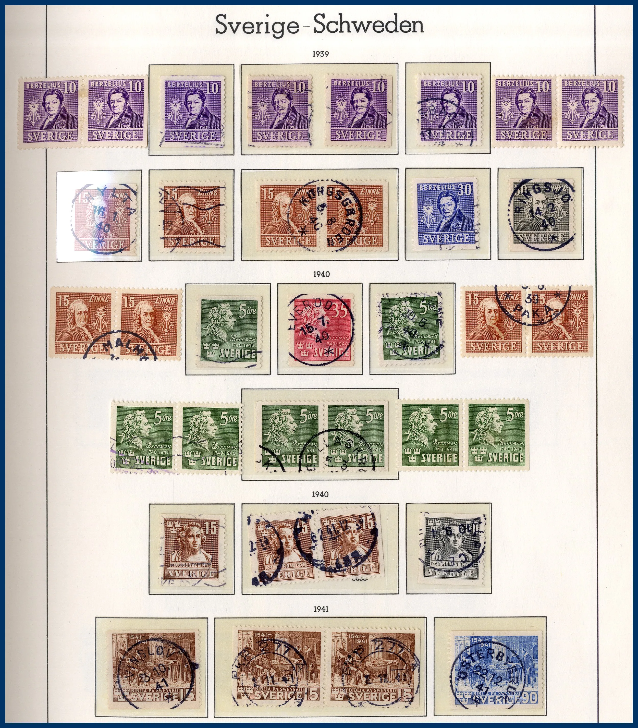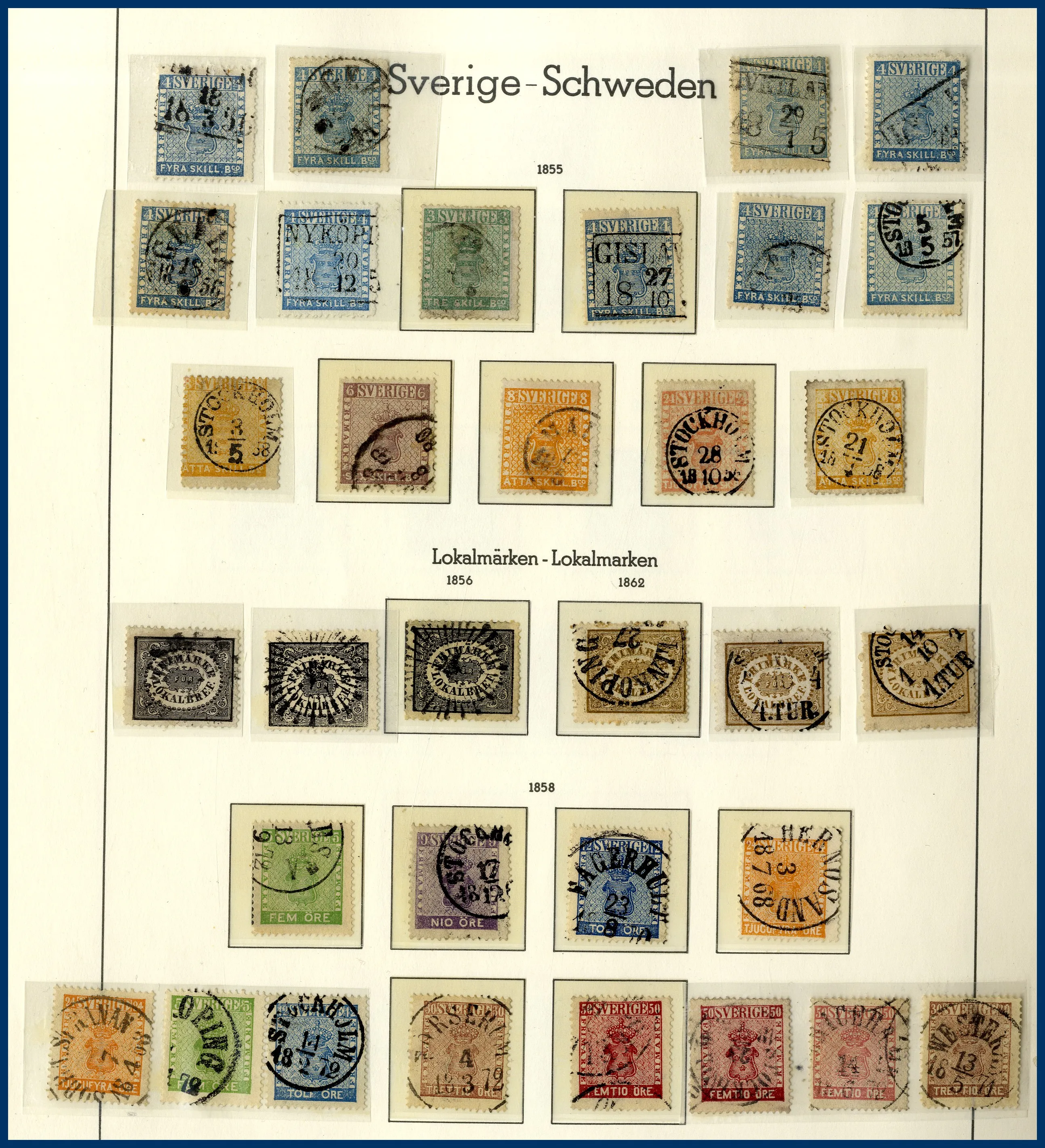 stämplat, från 1950-talet och framåt mer och mer **/*. Börjar med ett luckfyllarex av 3 Sk. Bco, 9 st 4-skillingar, ett luckfyllarex av 6 Sk. Bco, 3 st 8-skillingar varav en med intyg Franz Obermüller (1975) "Mycket god kvalitet utan reparationer eller förbättringar" och en med utlåtande Mats G. Nilsson (2025) av vilket det framgår att märket har diverse reparationer, 24 Sk. Bco med utlåtande Strandell (1951) diverse reparationer, 3 st svarta och 3 st bruna lokalmärken i blandad kvalitet, Vapen överkomplett (9-öringen med riss), Liggande lejon komplett, Ringtyp komplett förutom riksdalern t.13, ett par vackra stämplar på Oscar, Landstorm I-III komplett (både F.124 och F.125 *), Kongress/Förening komplett, samtliga BC-/CB-par, Bra Tjänste och Lösen. Från 1940-talet välbesatt med bl a alla 9-blocken i Stockholmia 55. Blandad kvalitet.