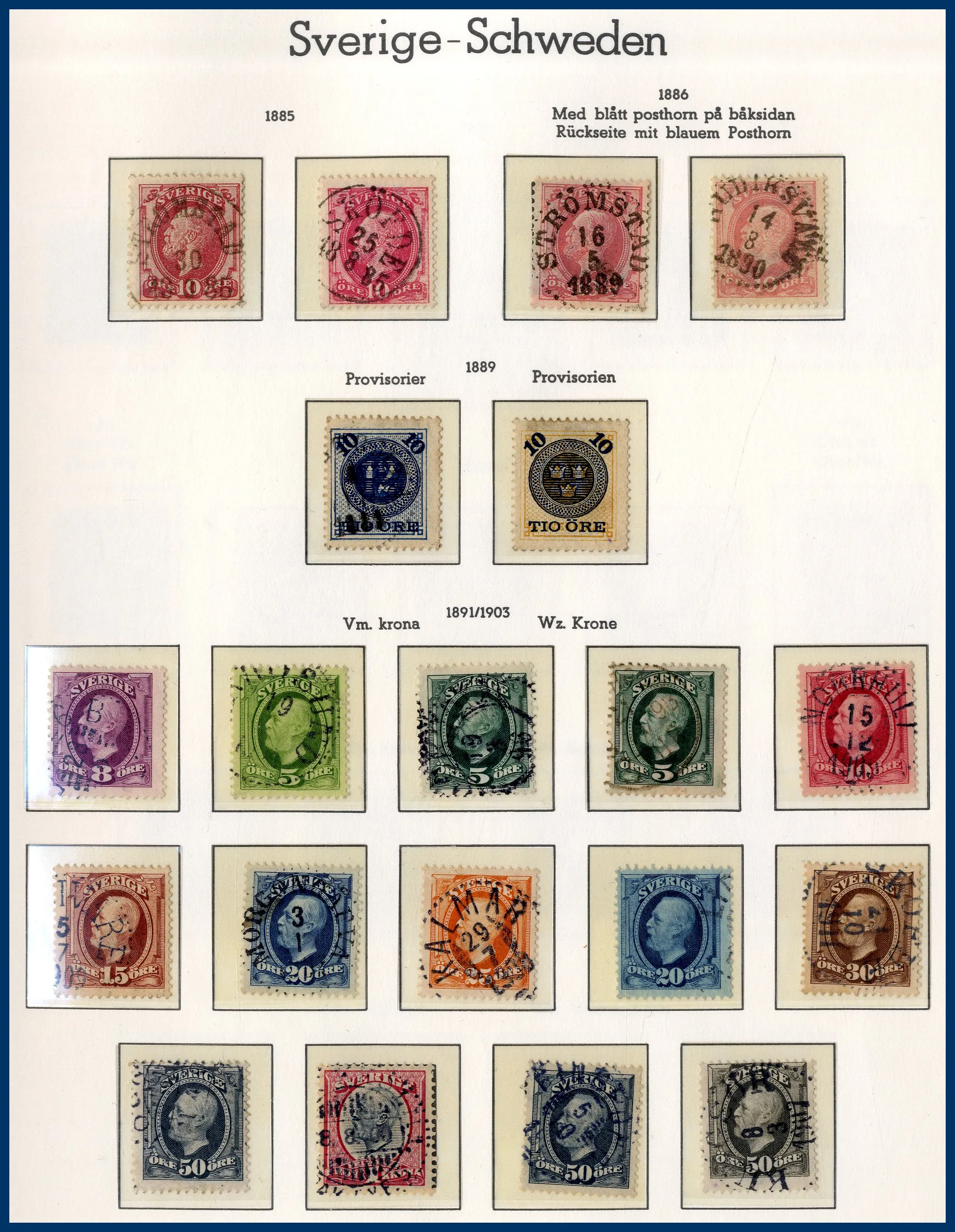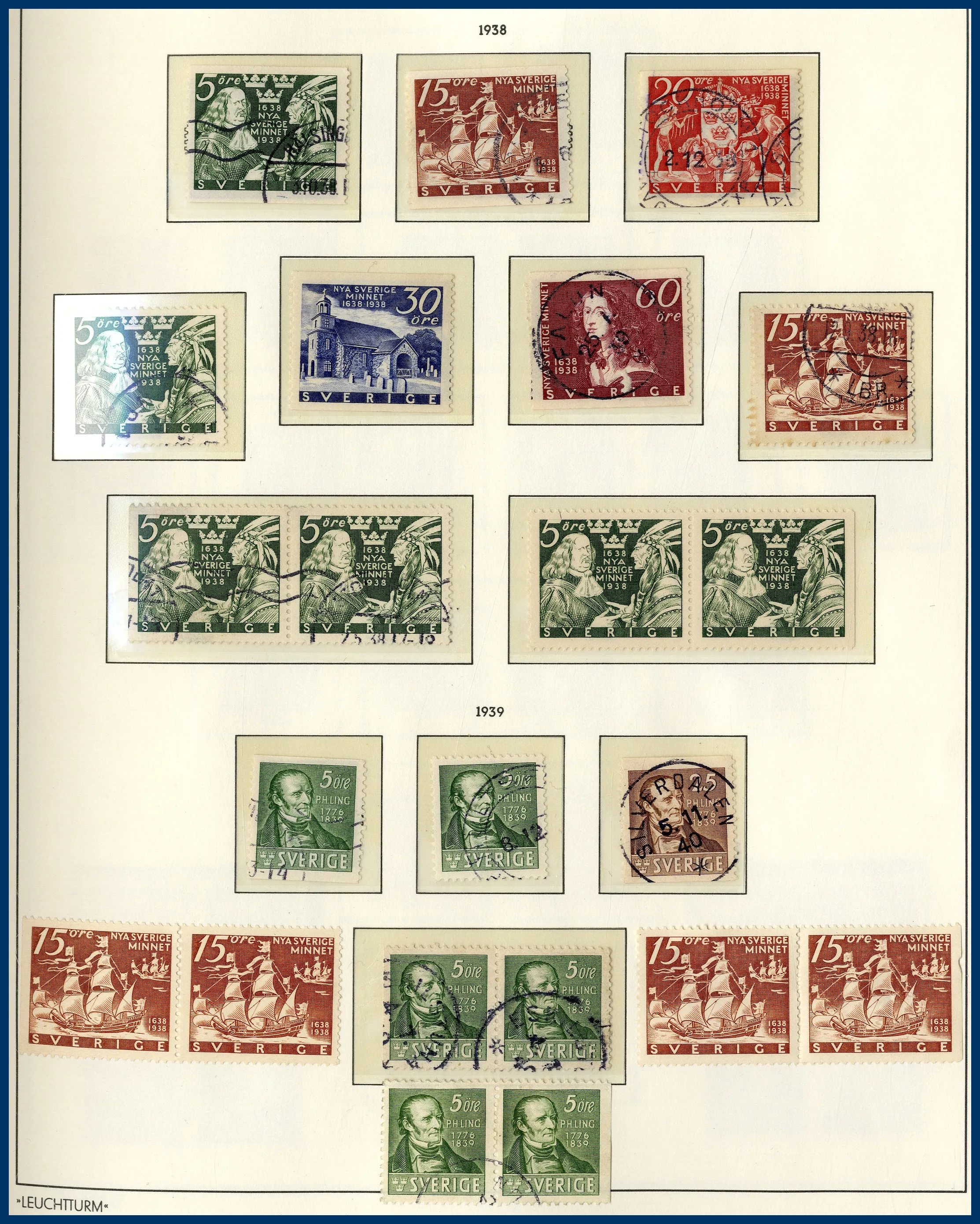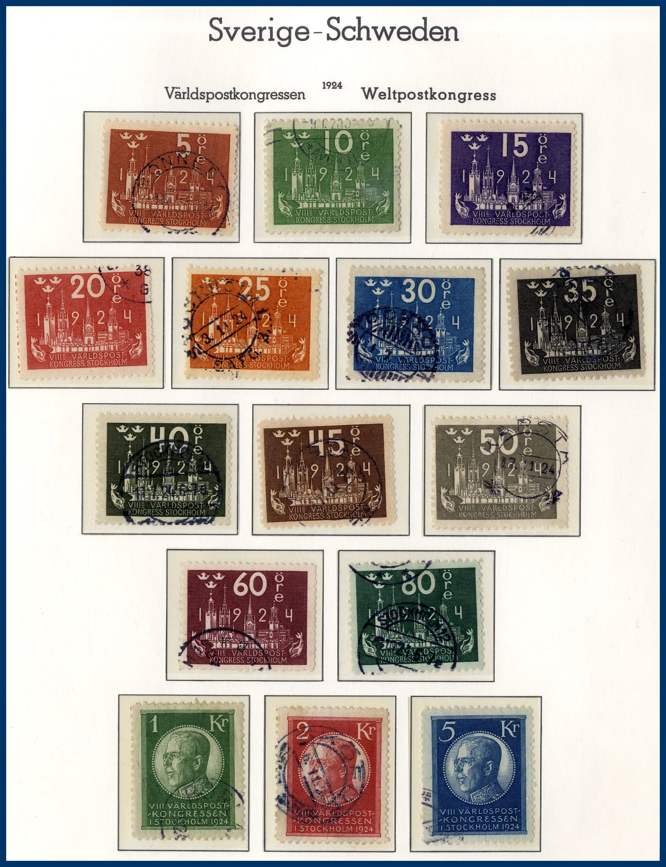 stämplat, från 1950-talet och framåt mer och mer **/*. Börjar med ett luckfyllarex av 3 Sk. Bco, 9 st 4-skillingar, ett luckfyllarex av 6 Sk. Bco, 3 st 8-skillingar varav en med intyg Franz Obermüller (1975) "Mycket god kvalitet utan reparationer eller förbättringar" och en med utlåtande Mats G. Nilsson (2025) av vilket det framgår att märket har diverse reparationer, 24 Sk. Bco med utlåtande Strandell (1951) diverse reparationer, 3 st svarta och 3 st bruna lokalmärken i blandad kvalitet, Vapen överkomplett (9-öringen med riss), Liggande lejon komplett, Ringtyp komplett förutom riksdalern t.13, ett par vackra stämplar på Oscar, Landstorm I-III komplett (både F.124 och F.125 *), Kongress/Förening komplett, samtliga BC-/CB-par, Bra Tjänste och Lösen. Från 1940-talet välbesatt med bl a alla 9-blocken i Stockholmia 55. Blandad kvalitet.