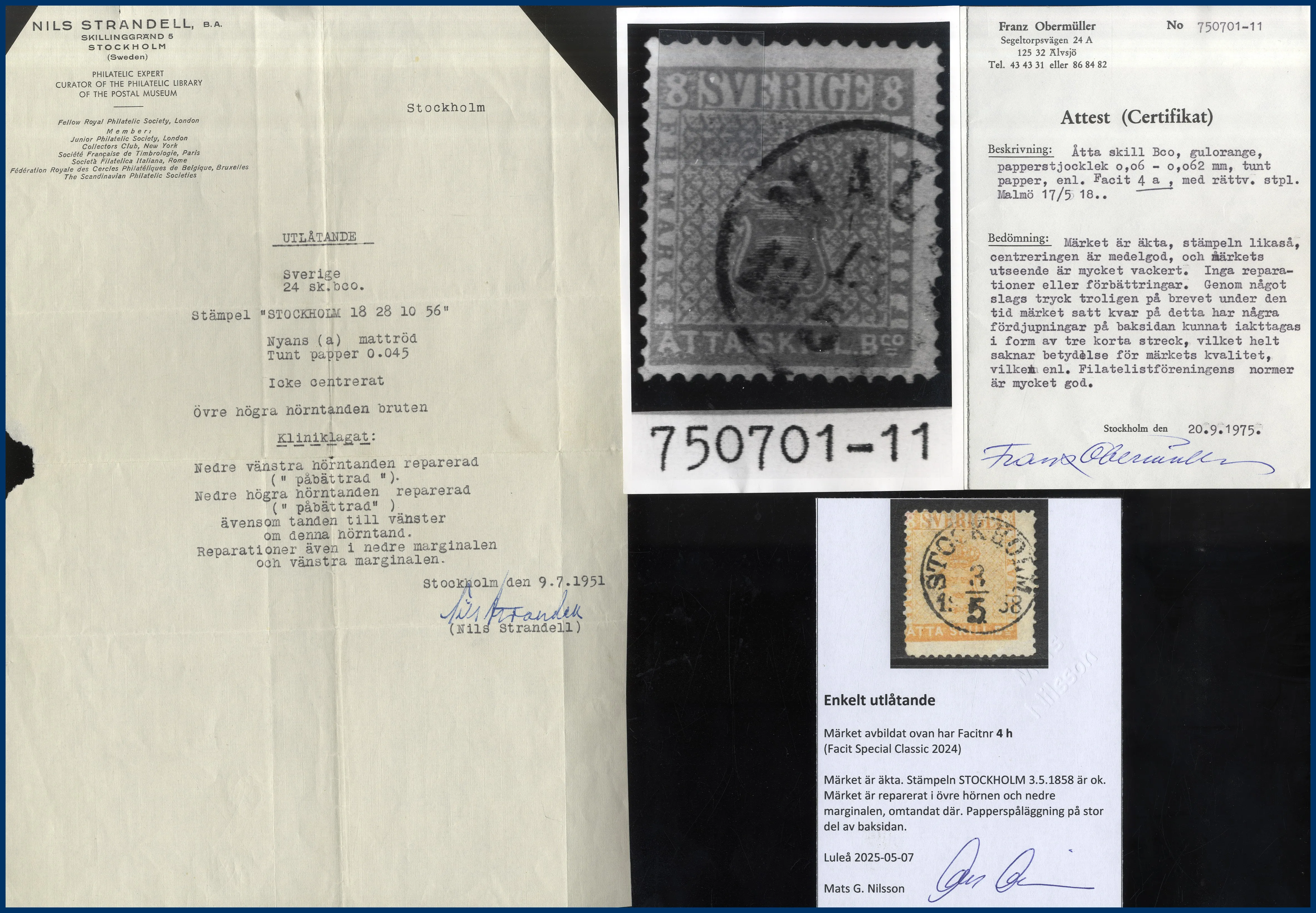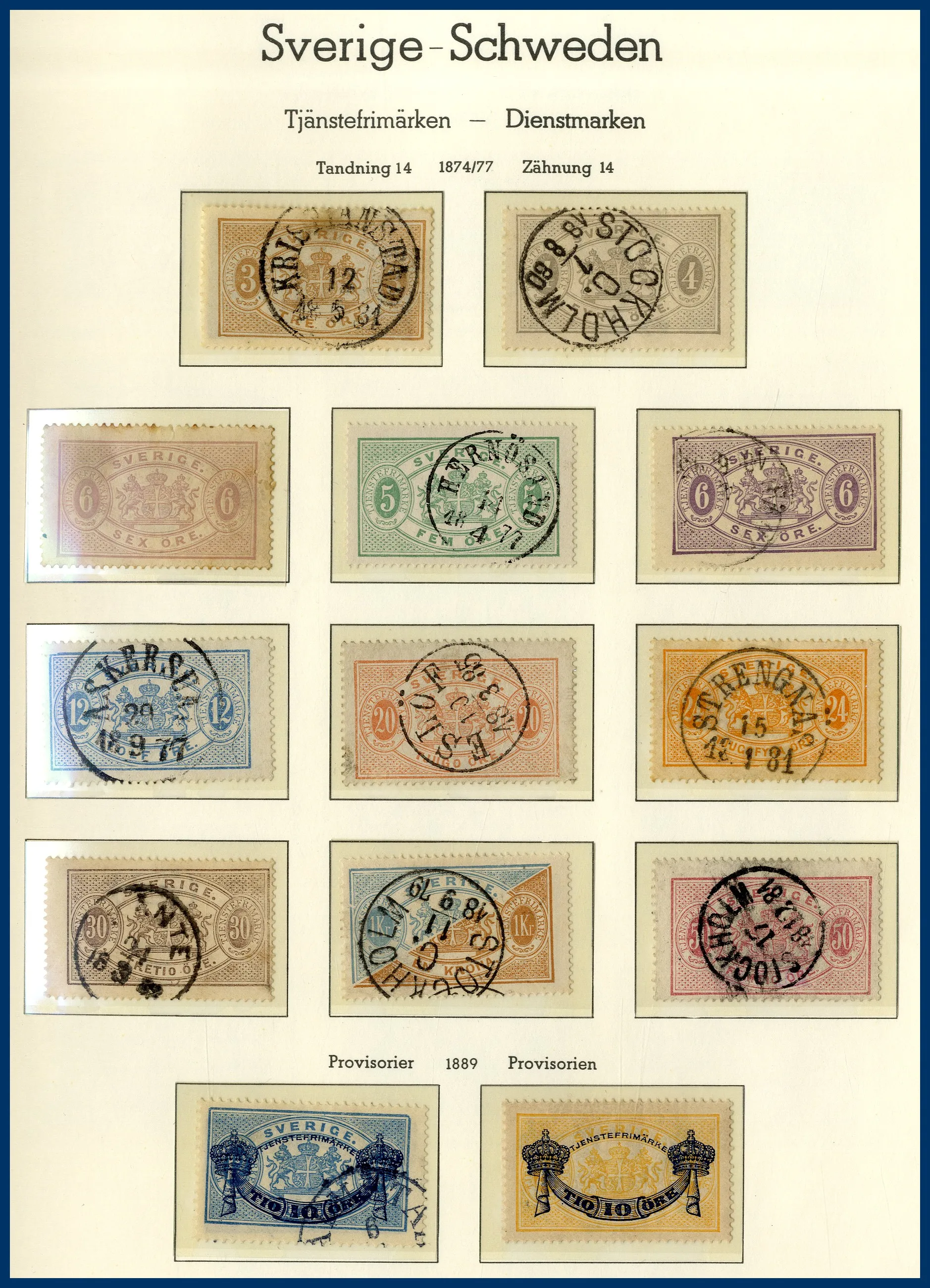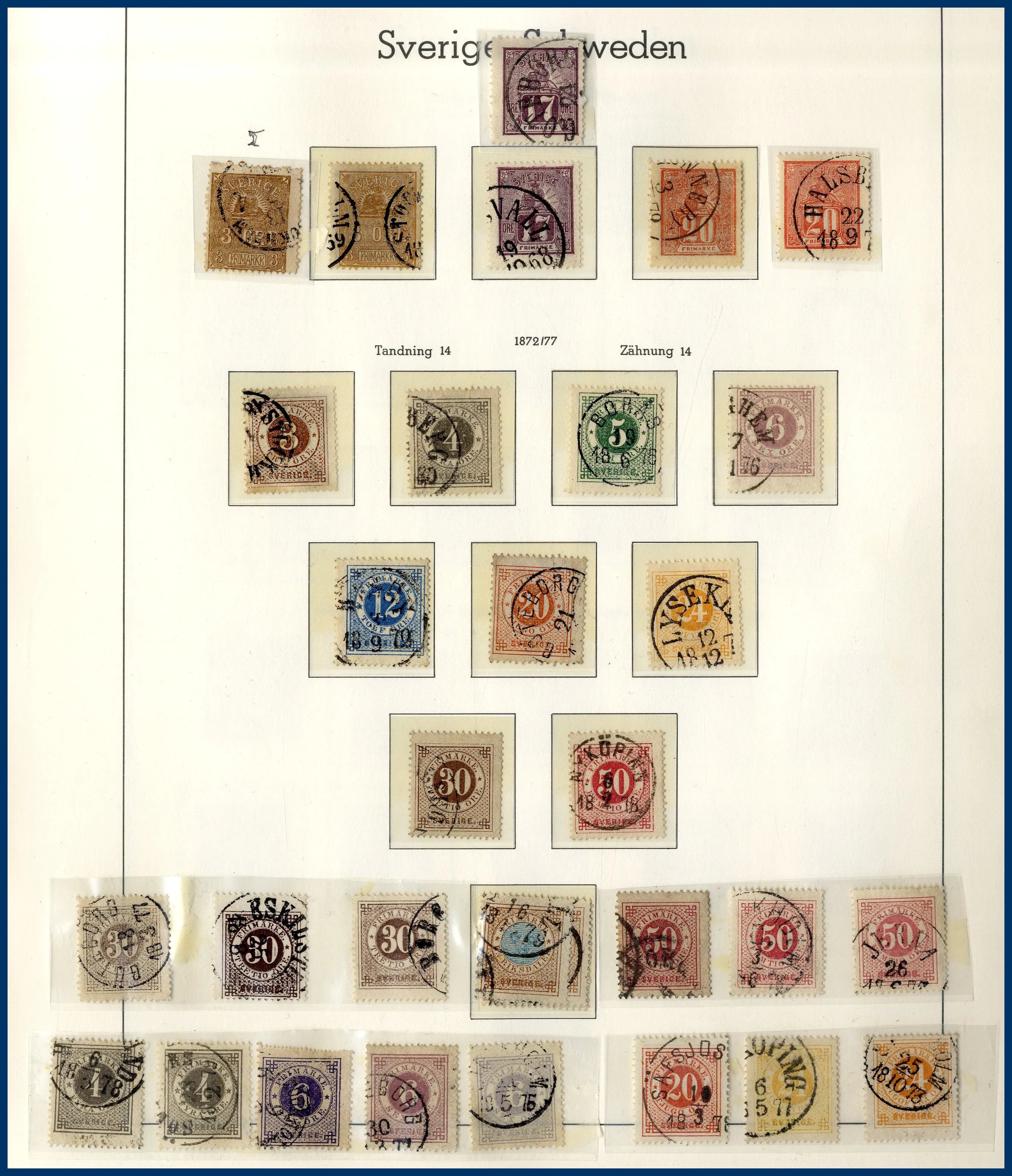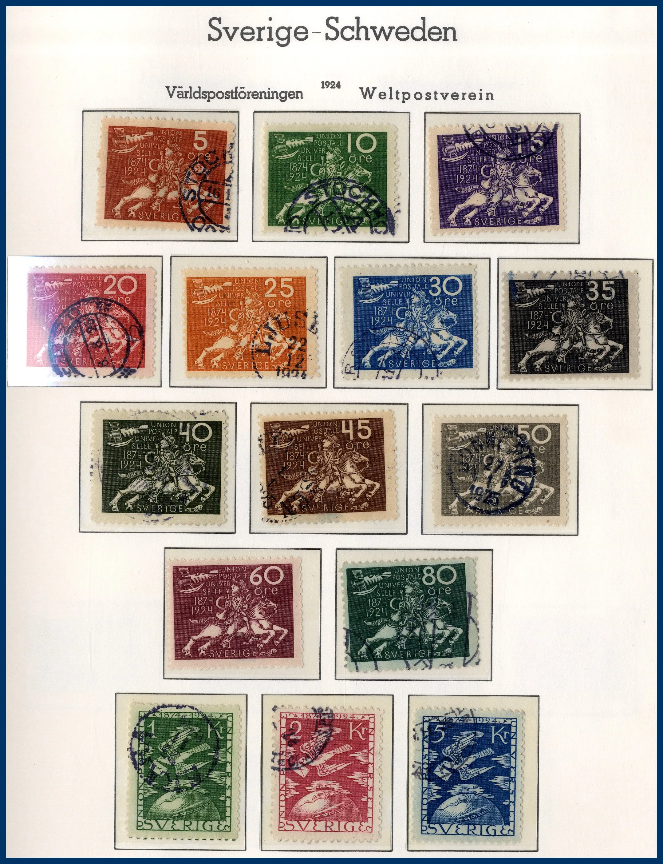 stämplat, från 1950-talet och framåt mer och mer **/*. Börjar med ett luckfyllarex av 3 Sk. Bco, 9 st 4-skillingar, ett luckfyllarex av 6 Sk. Bco, 3 st 8-skillingar varav en med intyg Franz Obermüller (1975) "Mycket god kvalitet utan reparationer eller förbättringar" och en med utlåtande Mats G. Nilsson (2025) av vilket det framgår att märket har diverse reparationer, 24 Sk. Bco med utlåtande Strandell (1951) diverse reparationer, 3 st svarta och 3 st bruna lokalmärken i blandad kvalitet, Vapen överkomplett (9-öringen med riss), Liggande lejon komplett, Ringtyp komplett förutom riksdalern t.13, ett par vackra stämplar på Oscar, Landstorm I-III komplett (både F.124 och F.125 *), Kongress/Förening komplett, samtliga BC-/CB-par, Bra Tjänste och Lösen. Från 1940-talet välbesatt med bl a alla 9-blocken i Stockholmia 55. Blandad kvalitet.