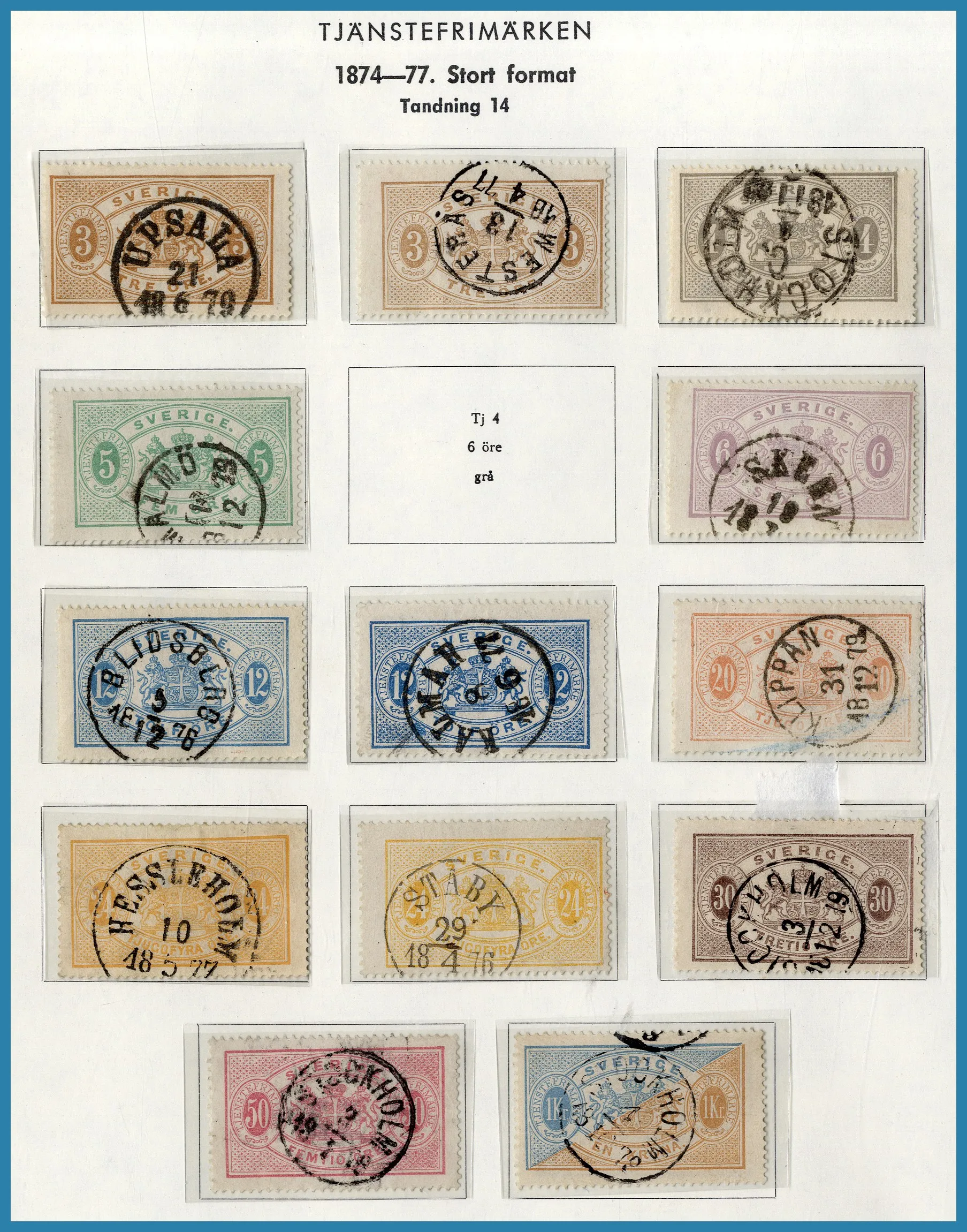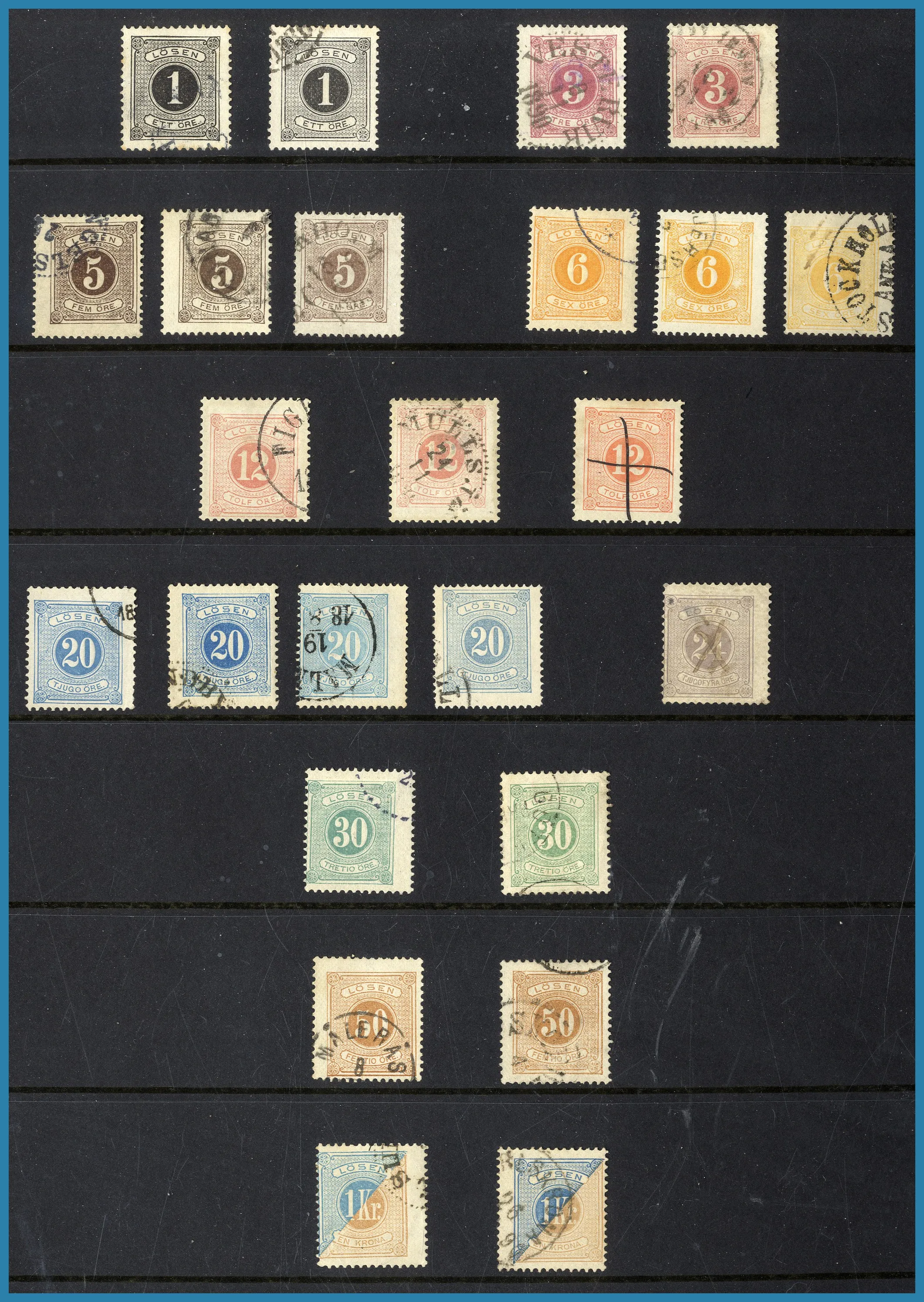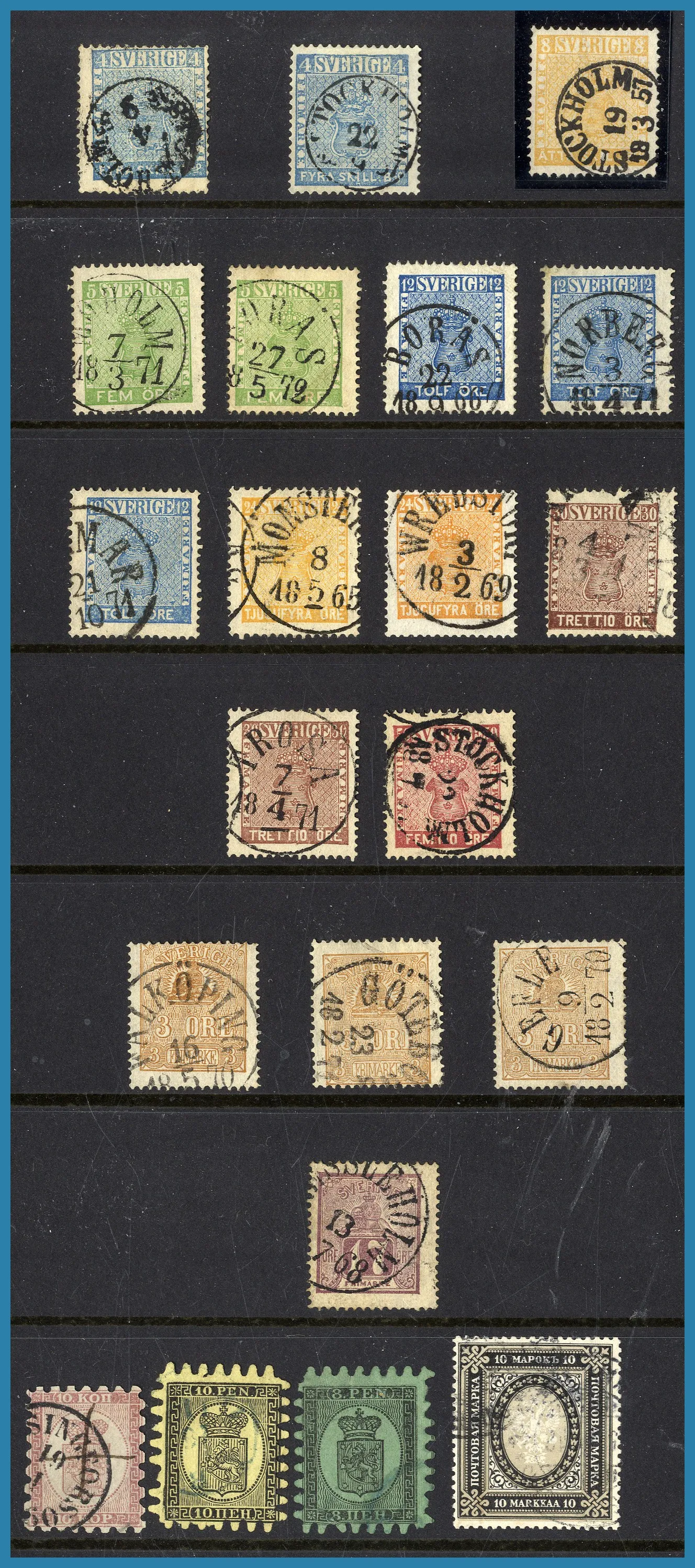 med visirblad inemellan. Börjar med 2x 4 Sk Bco och en fräsch 8 Sk med sidvänd stämpel "STOCKHOLM 19.3.1857", urval Vapentyp och Liggande Lejon med flera läsbara stämplar, likaså Ringtyp och stora Tjänste, Bandmärken med flera vm, Kongressen till 2 kr med luckor, Föreningen till 2 kr, 11 st enklare BC/CB etc.