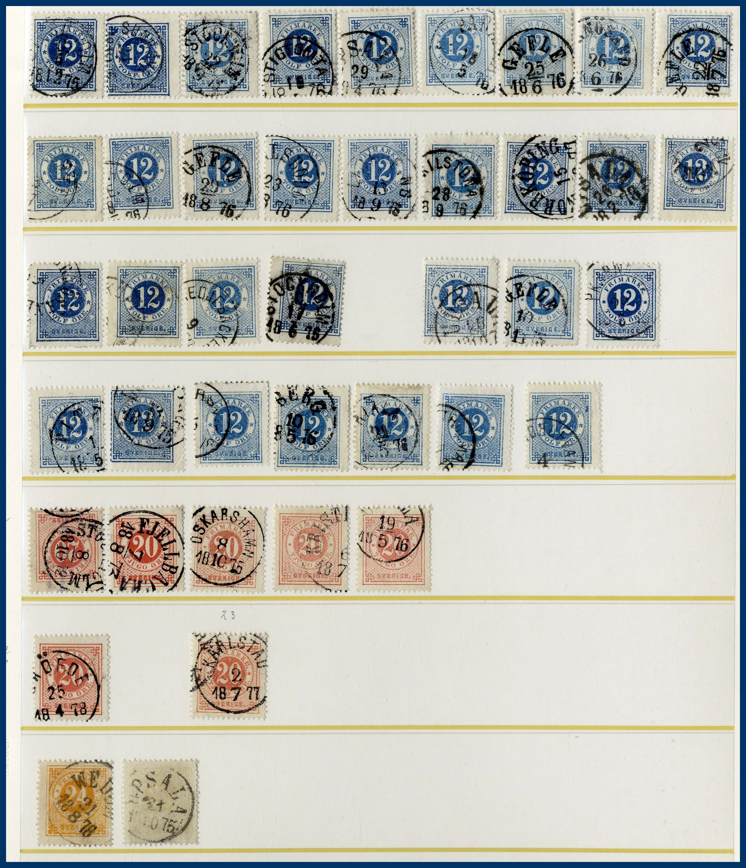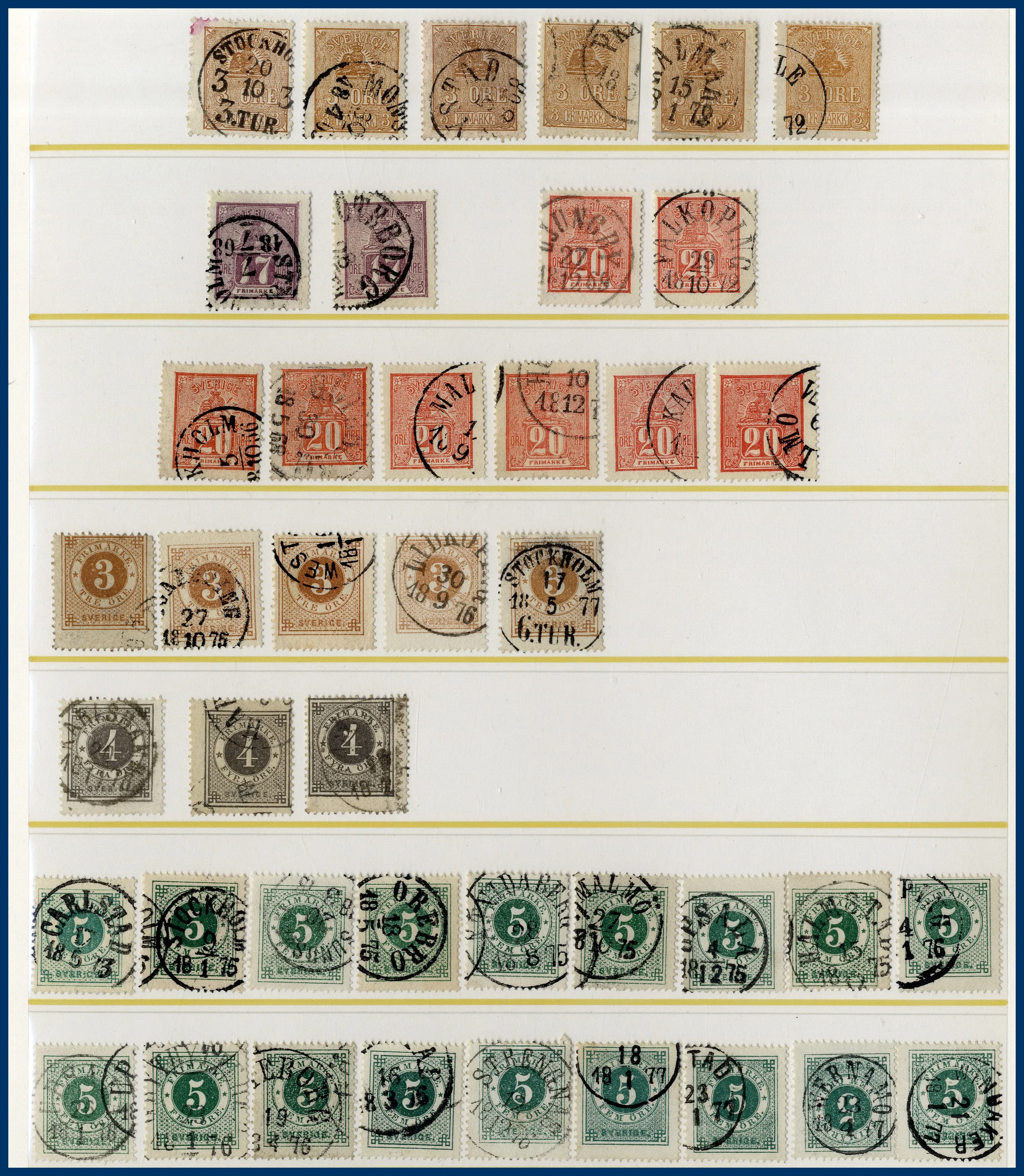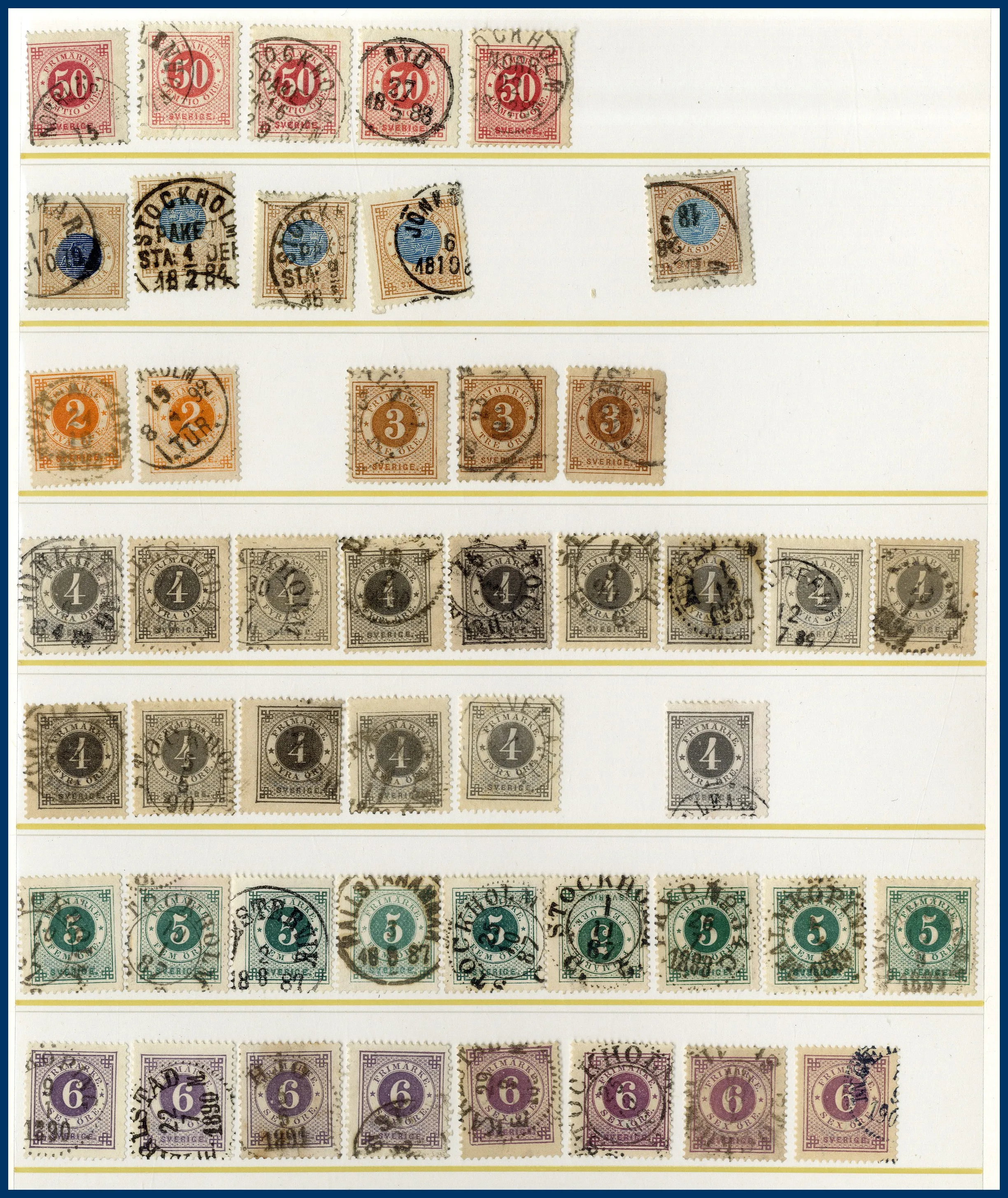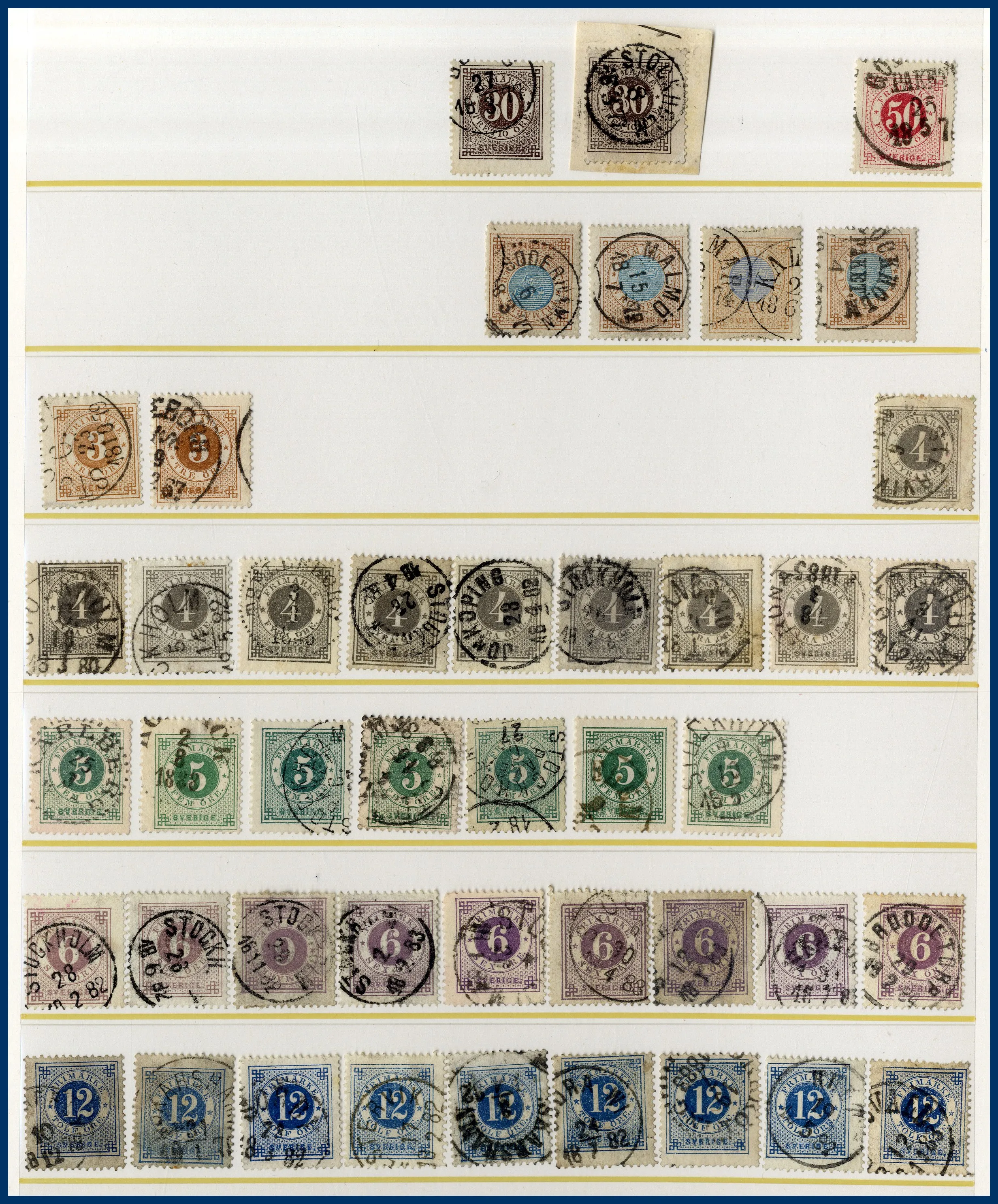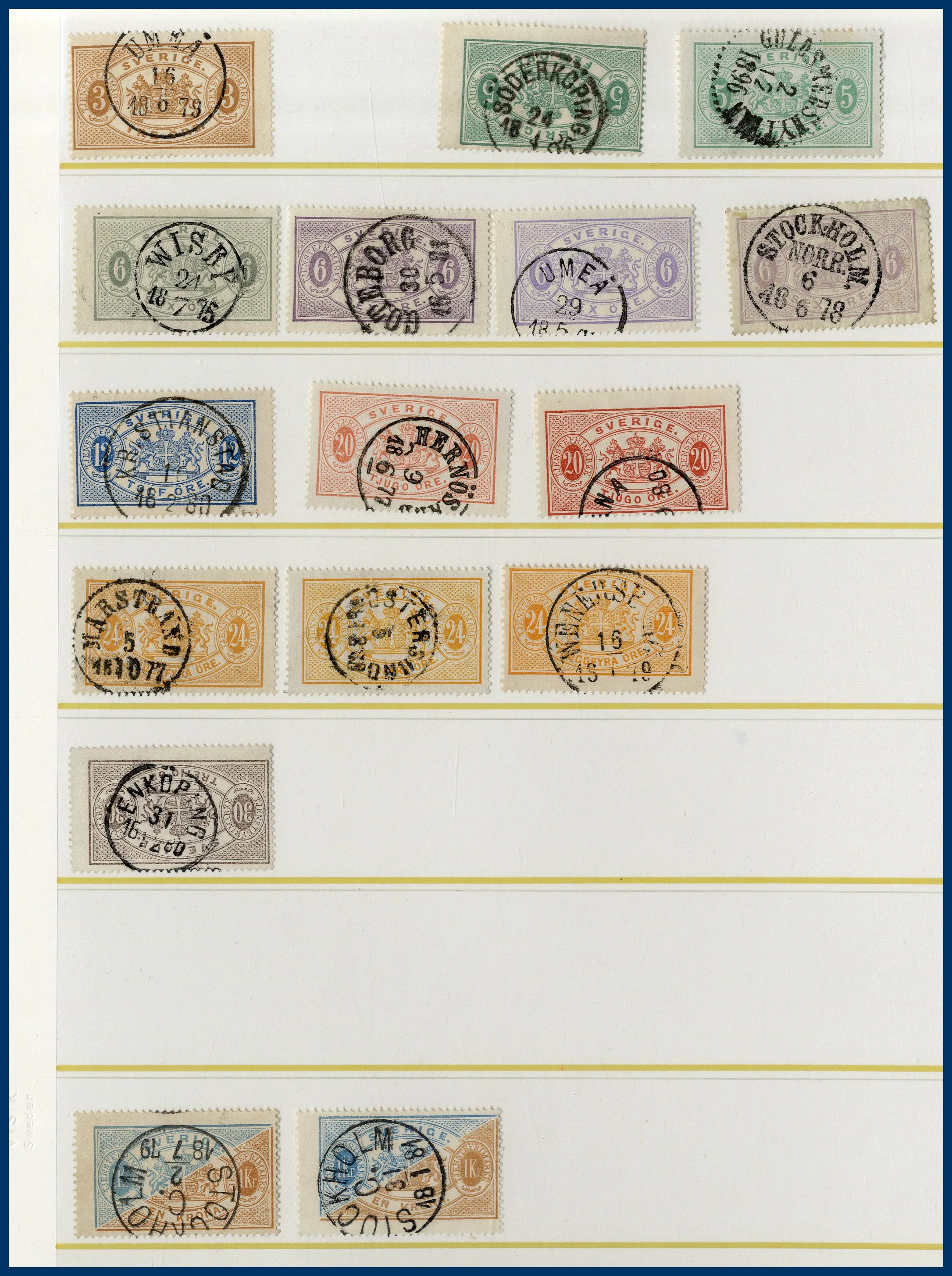 Bra urval Skillingar med 7 x 4 Sk, 2 x 6 Sk, 2 x 8 Sk (även 3 Sk + 8 Sk luckfyllare), välfyllt med många dubbletter Lokalmärken, Vapentyp, Liggande lejon och Ringtyp fortsätter med Oscar II, Medaljong och Bandmärken med Kongress/Förening med spridda valörer upp till 5 kr. Genomgående i samlingen en del vackra stämplar. På slutet även 5 visirblad Finland, bl a Ryska typer och några försändelser.