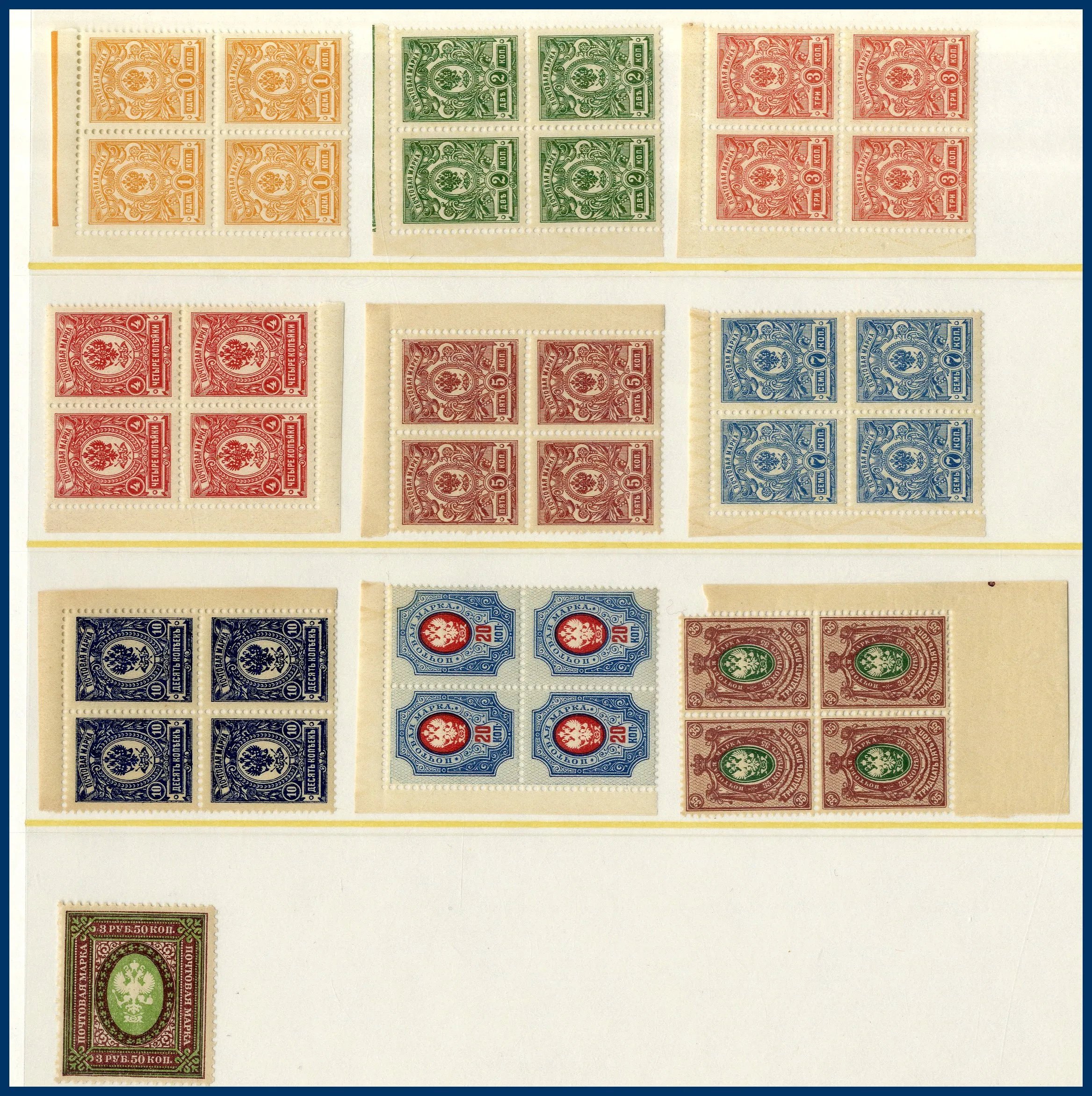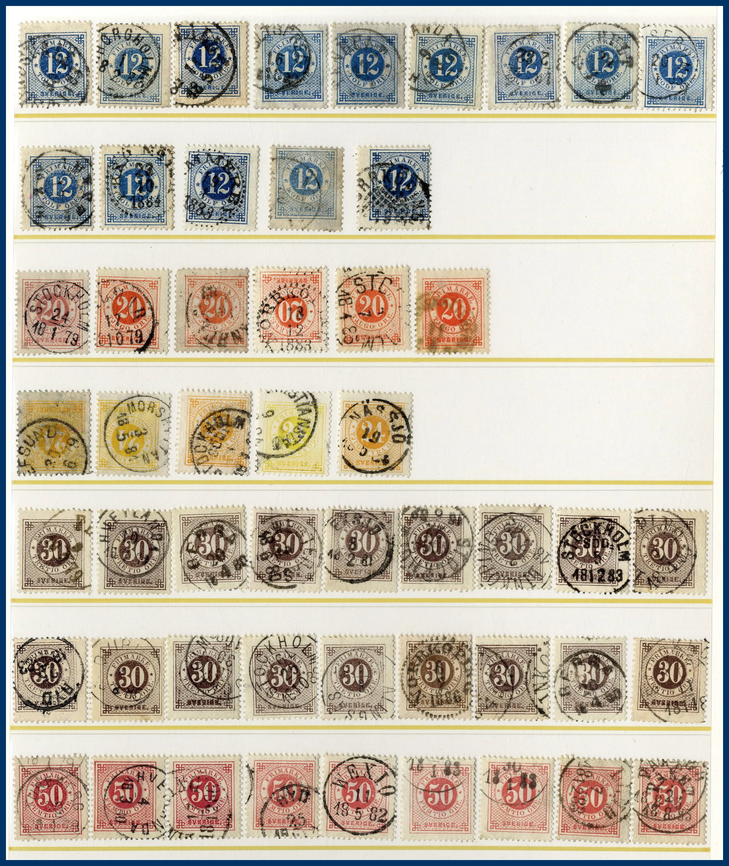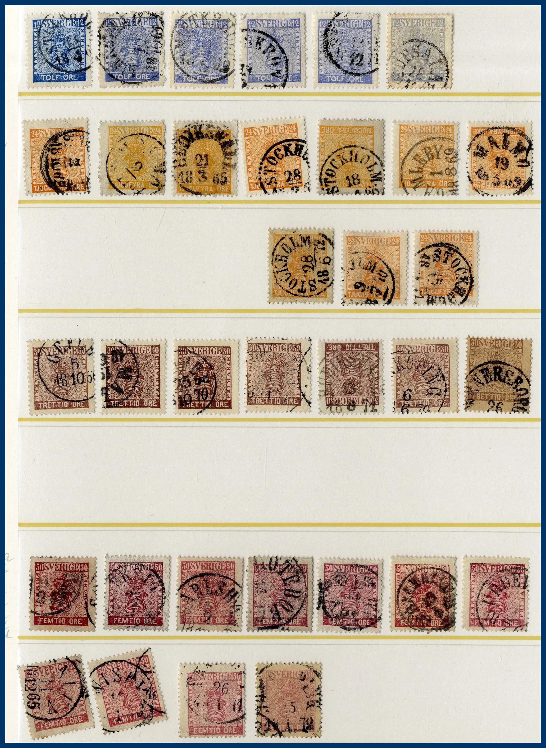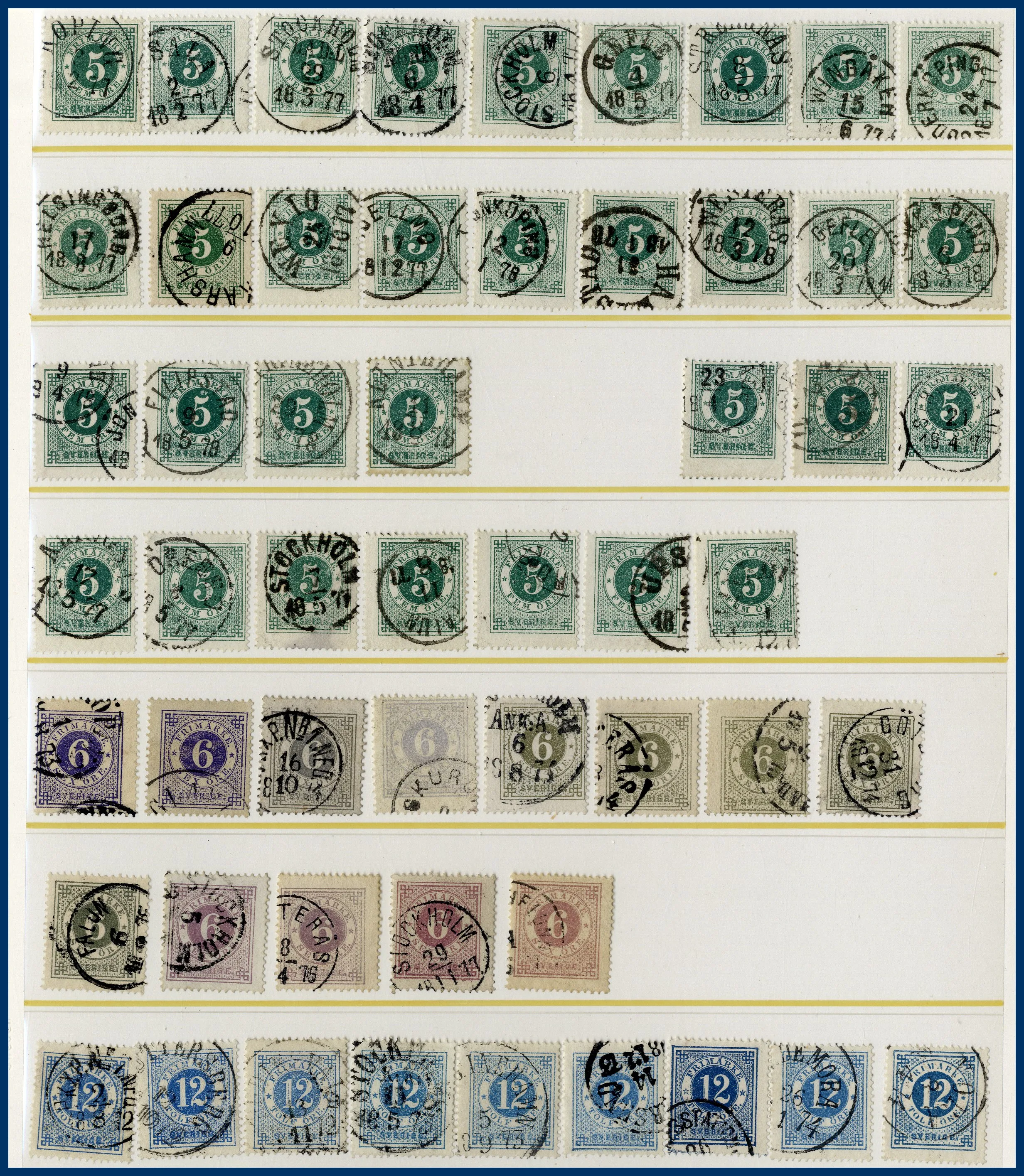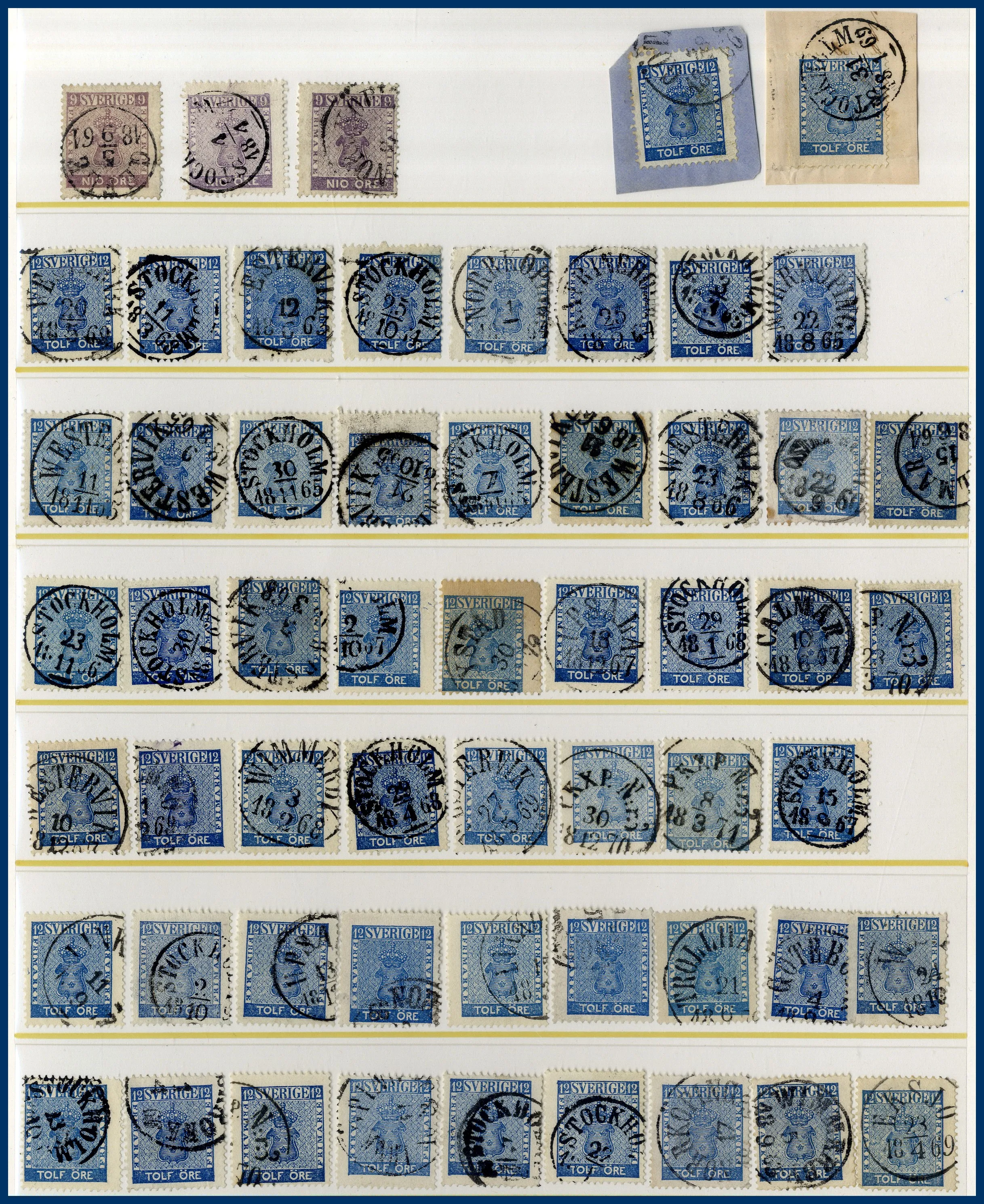 Bra urval Skillingar med 7 x 4 Sk, 2 x 6 Sk, 2 x 8 Sk (även 3 Sk + 8 Sk luckfyllare), välfyllt med många dubbletter Lokalmärken, Vapentyp, Liggande lejon och Ringtyp fortsätter med Oscar II, Medaljong och Bandmärken med Kongress/Förening med spridda valörer upp till 5 kr. Genomgående i samlingen en del vackra stämplar. På slutet även 5 visirblad Finland, bl a Ryska typer och några försändelser.