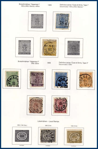 Leuchtturm-album utan fickor. 4 och 8 Sk.Bco, Vapentyp komplett, båda lokalmärkena, Liggande lejon komplett inkl. 3 öre typ I (17 öre grå dock luckfyllare), Ringtyp komplett inkl. Riksdalern t.13, Kongress/Förening komplett förutom 5 kr Kongressen, välbesatta avsnitt Tjänste och Lösen, ett flertal BC-/CB-par etc. Nämnas bör också de många vackra stämplarna som dyker upp lite här och var samlingen igenom.