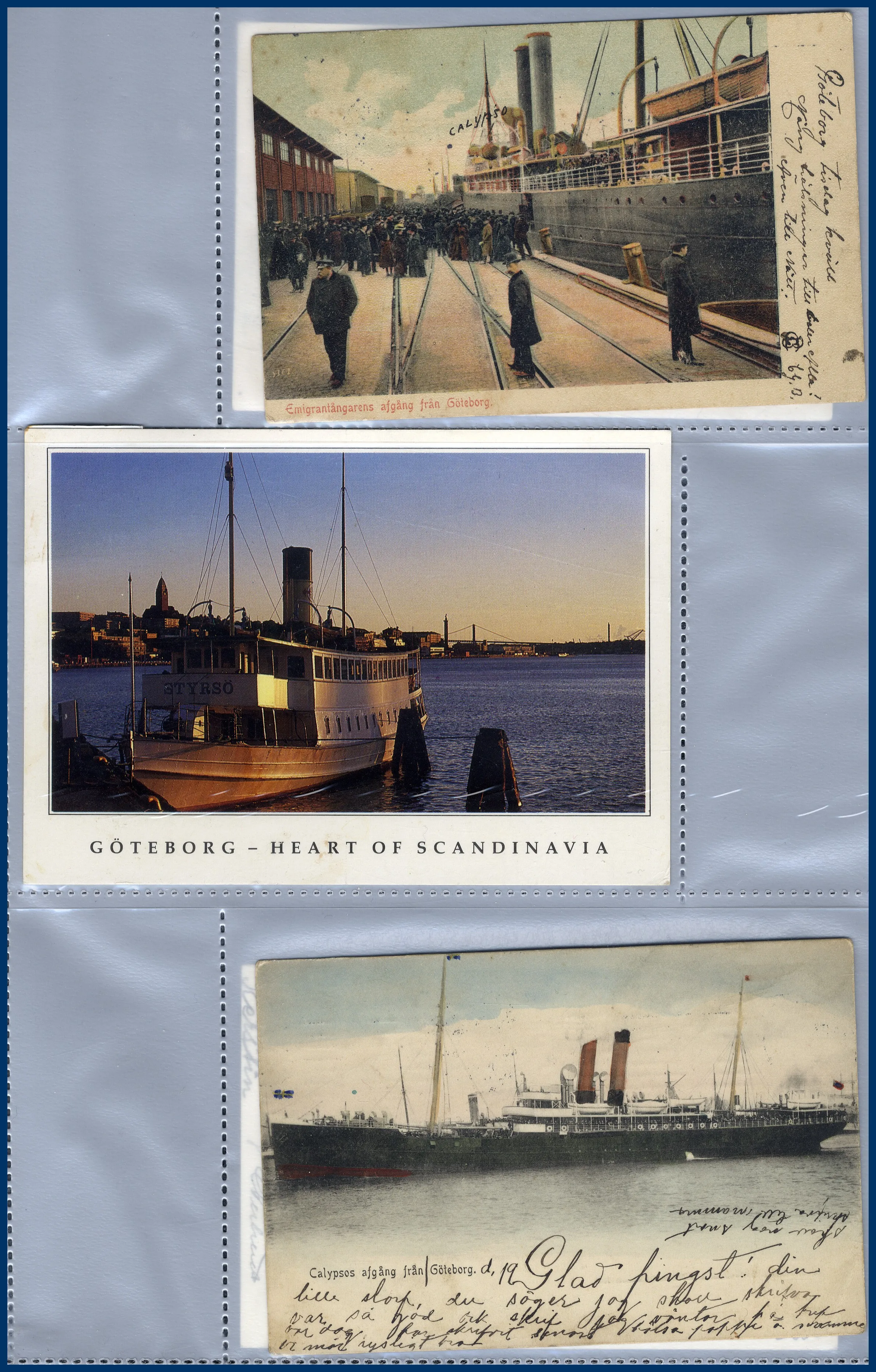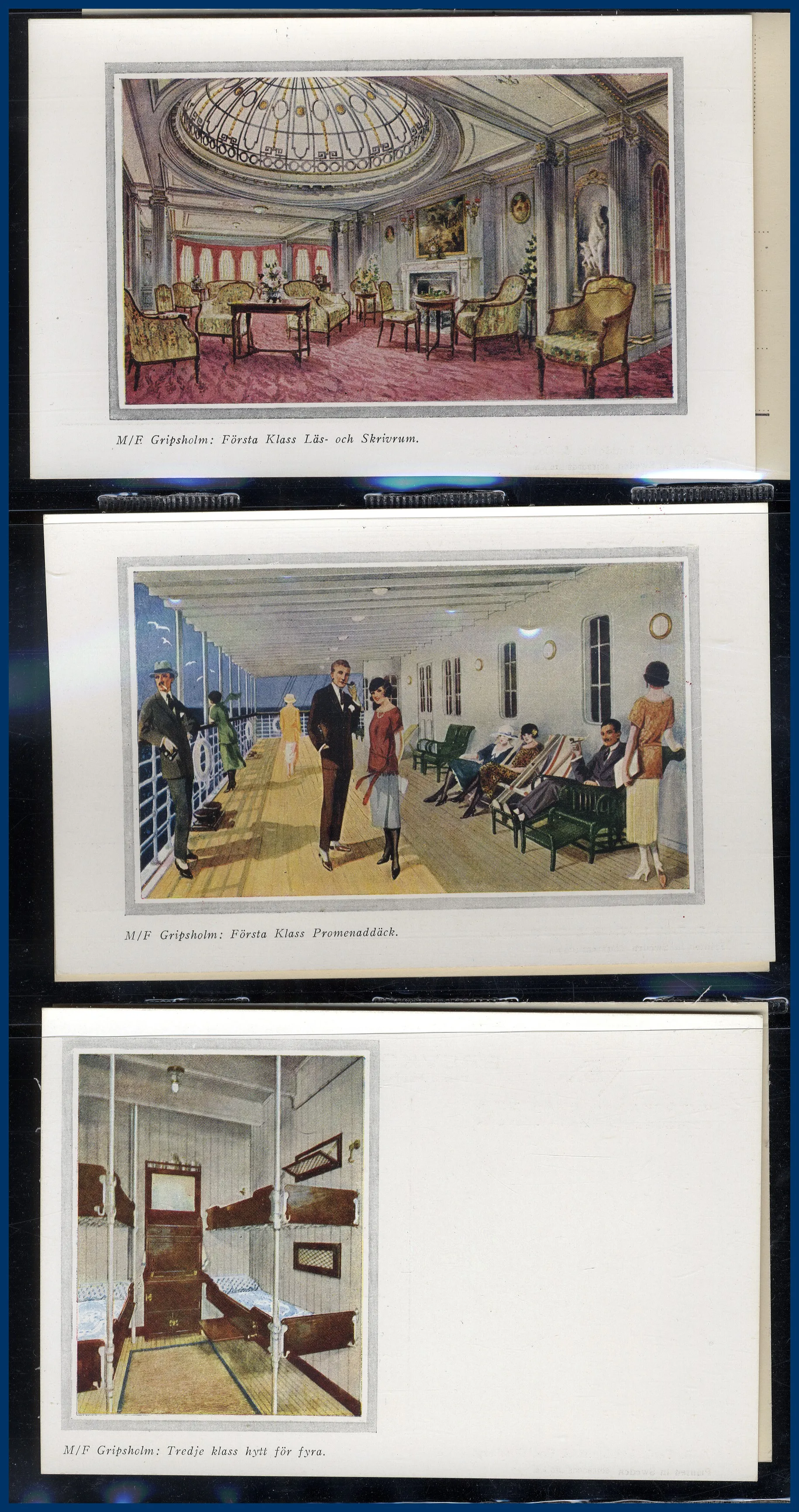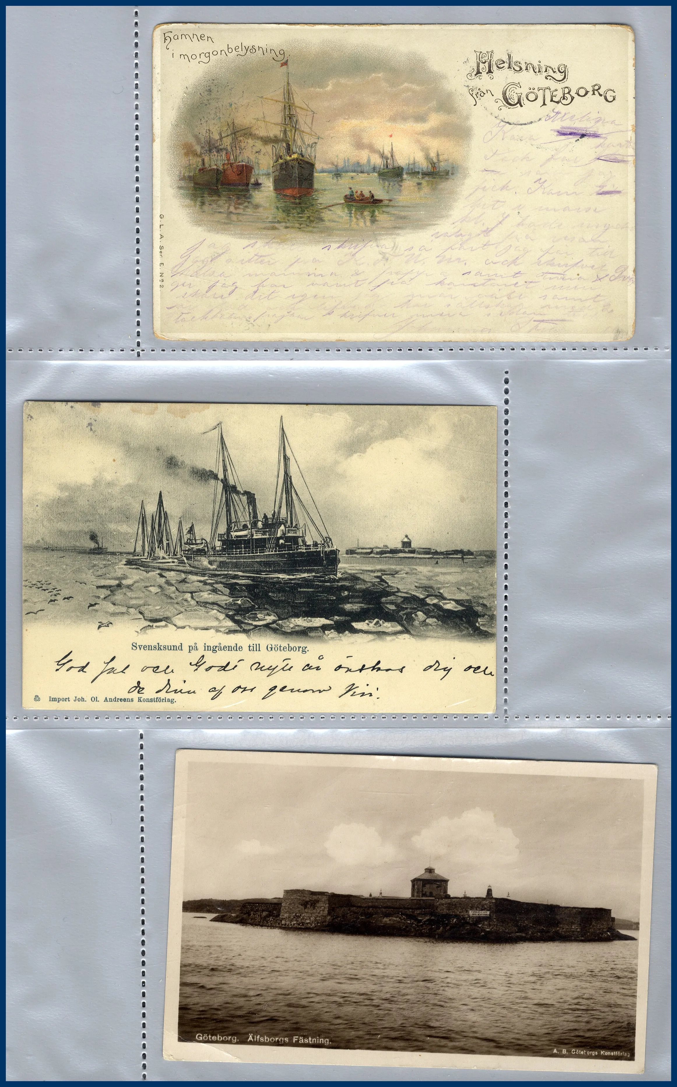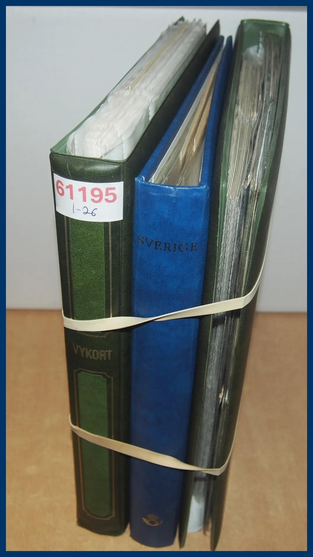 1. Ca 150 vykort med hamnmotiv, nästan alla av gamla formatet. 2. Närmare 170 vykort med kyrkomotiv, nästan alla av gamla formatet. 3. Ett 30-tal vykort sjöfart, de allra flesta med tecknade interiörer från M/F Gripsholm i gamla formatet. Trevliga kort som man inte ser så ofta.