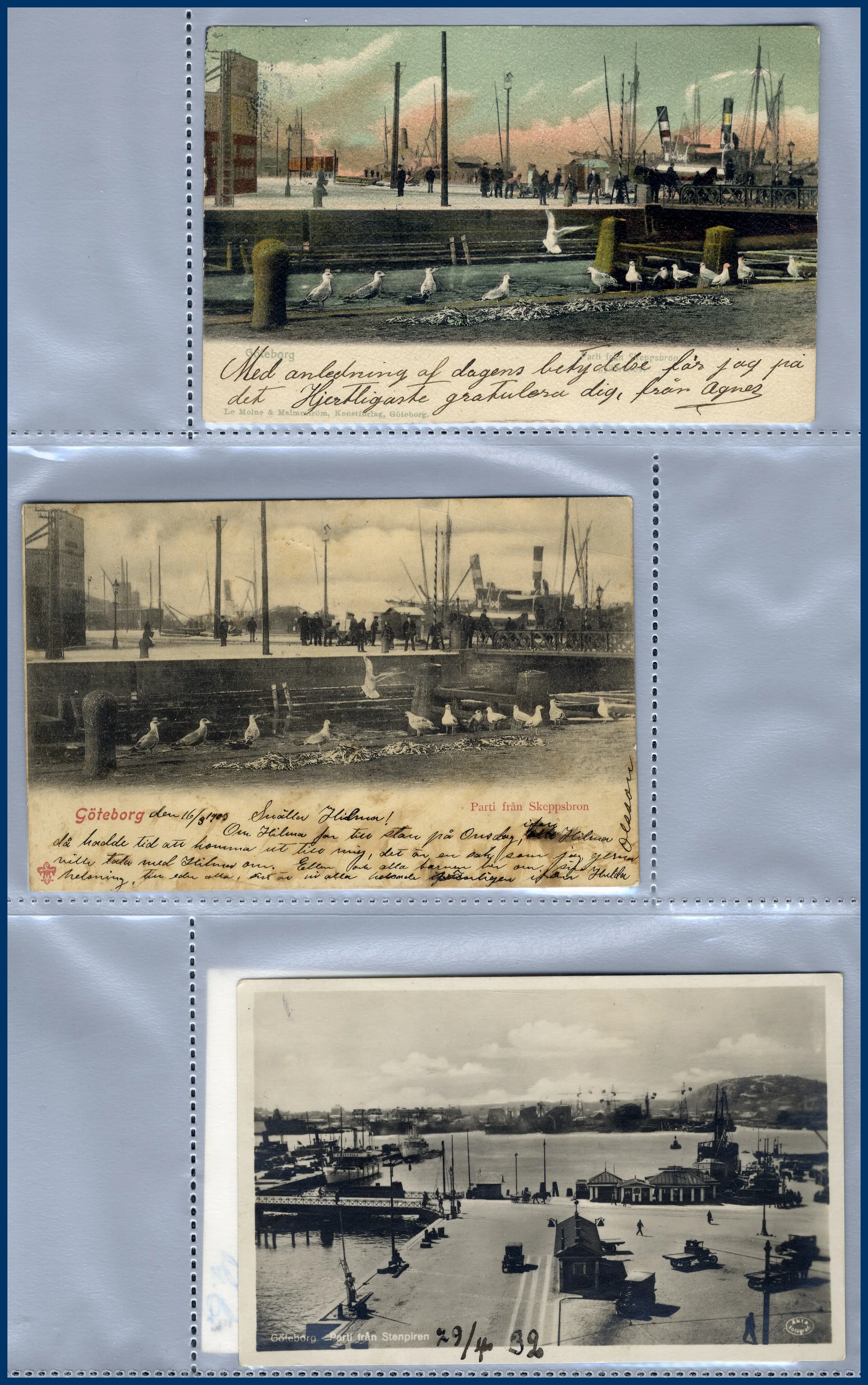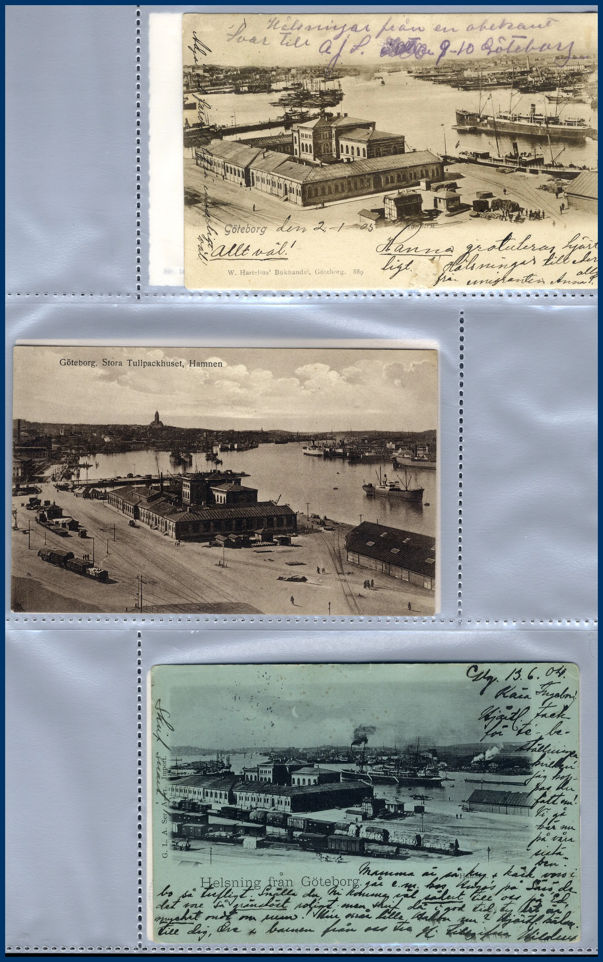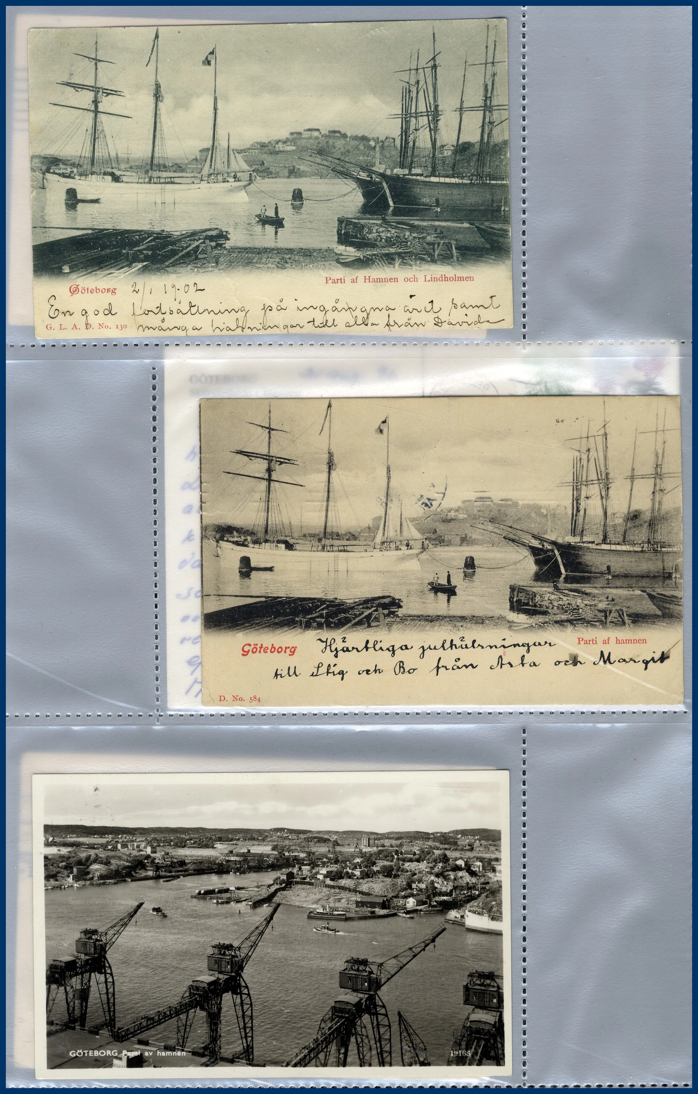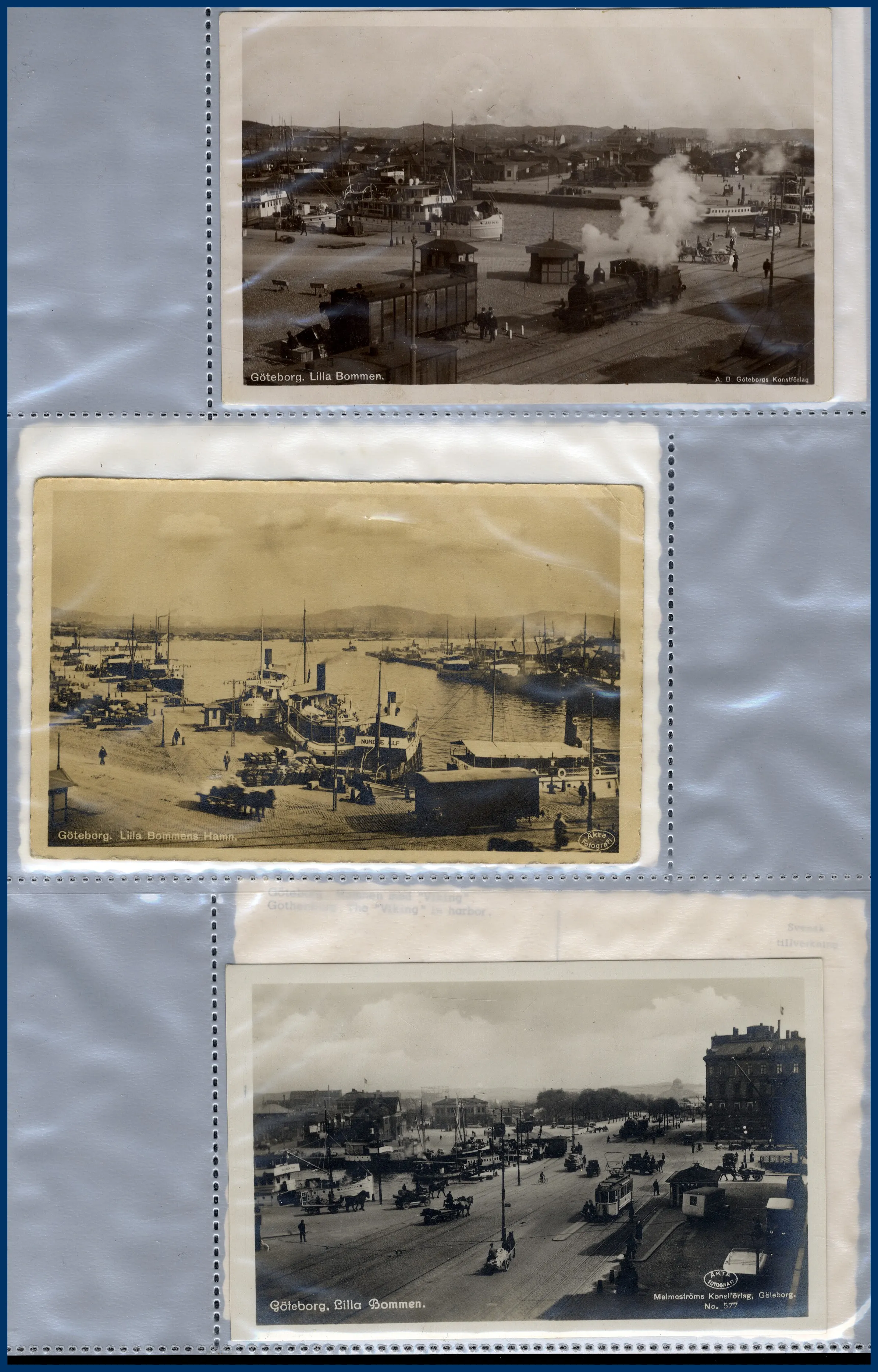 1. Ca 150 vykort med hamnmotiv, nästan alla av gamla formatet. 2. Närmare 170 vykort med kyrkomotiv, nästan alla av gamla formatet. 3. Ett 30-tal vykort sjöfart, de allra flesta med tecknade interiörer från M/F Gripsholm i gamla formatet. Trevliga kort som man inte ser så ofta.