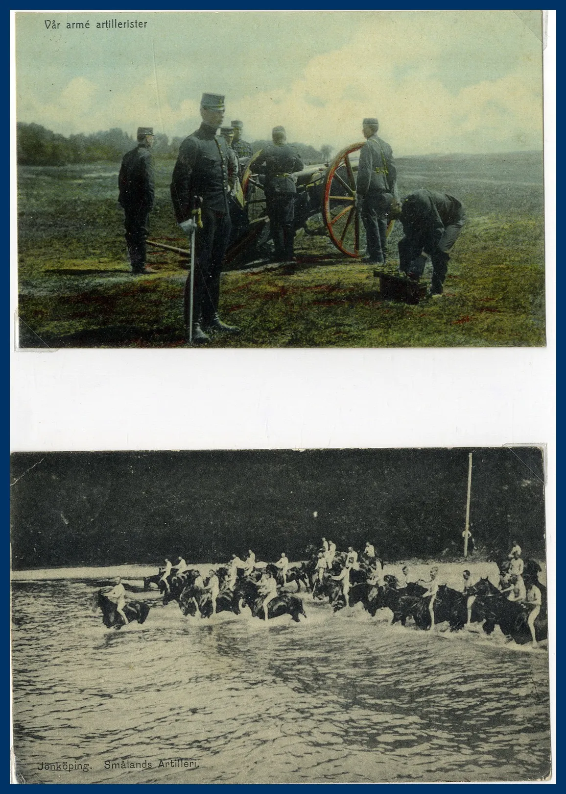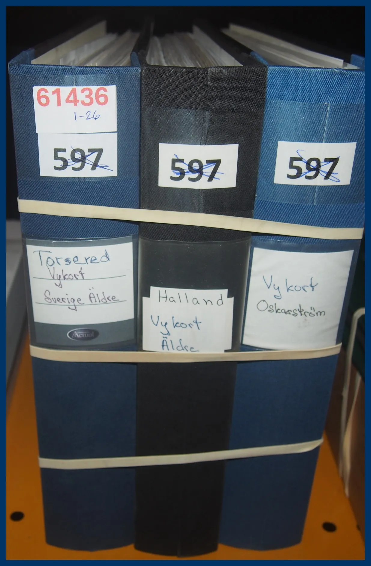 i 3 st kontorspärmar. Mest Halland men även blandad topografi med en hel del fartyg och militära vyer bla FN-Bataljonen i Kongo, några tidningsurklipp etc inemellan. Totalt ca 350 st vykort inklusive militärförsändelser.