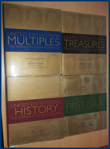 i 4 delar: First issue USA 1847, USA Postal history, Stamp multiples och Treasures. Möjligen de vackraste auktionskatalogerna hittills utgivna. Fräscha begagnade exemplar, dock veck och små riss i skyddsomslagen.